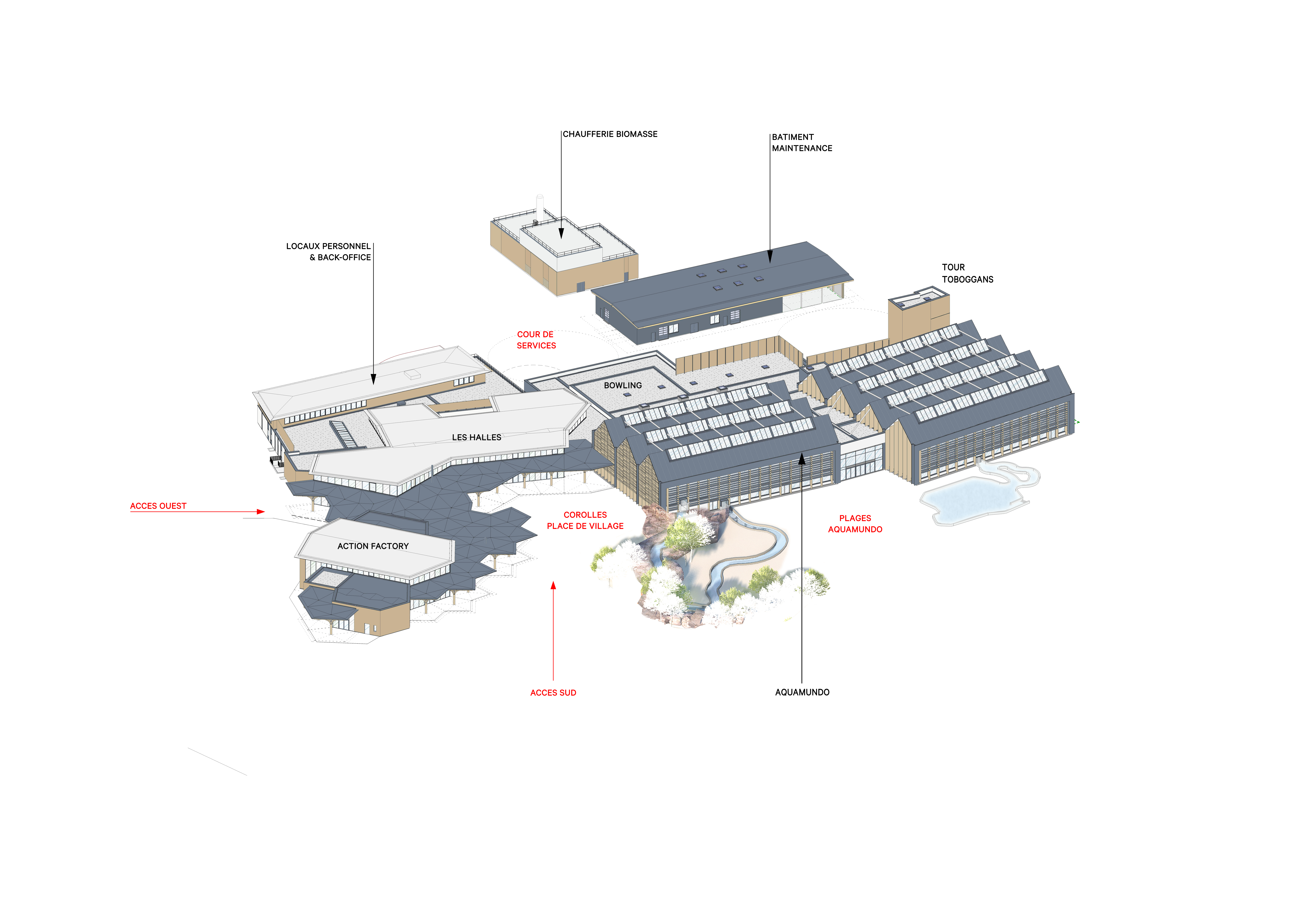 Approche environnementale : La forme et l’orientation du projet où le bois prédomine, participent à la certification HQE Aménagement du site, attestant son intégration au territoire. Dès la conception, des mesures environnementales ont été prises pour préserver la nature et le vivant : charte de chantier vert, création d’un corridor noir, limitation de la pollution lumineuse, suivi des espèces par une association locale. Par ailleurs, 80% du besoin énergétique du Cœur de Village sont d’origine renouvelable et 90% du besoin de chaleur de l’Aquamundo sont couverts par une chaufferie biomasse approvisionnée localement.
