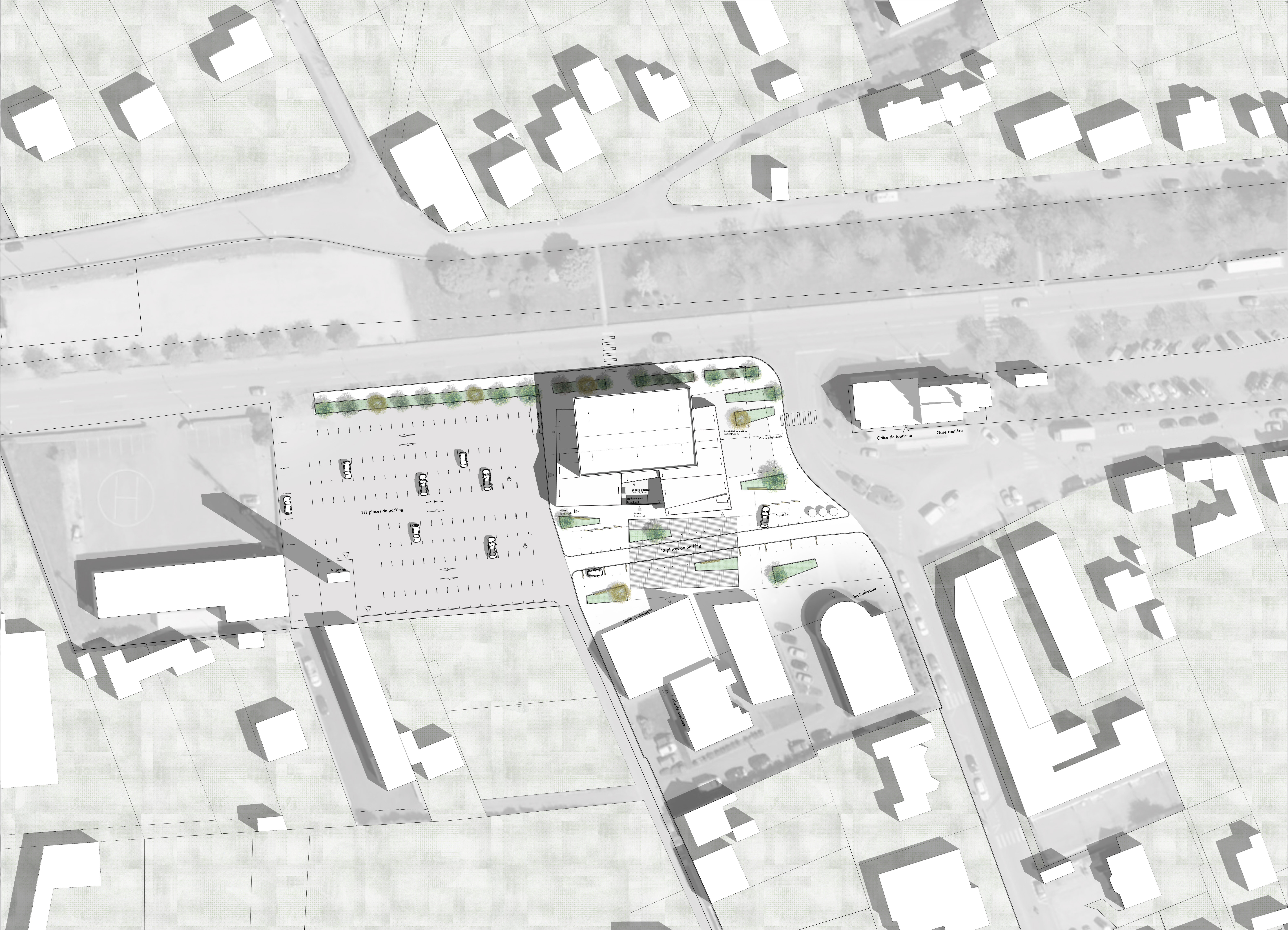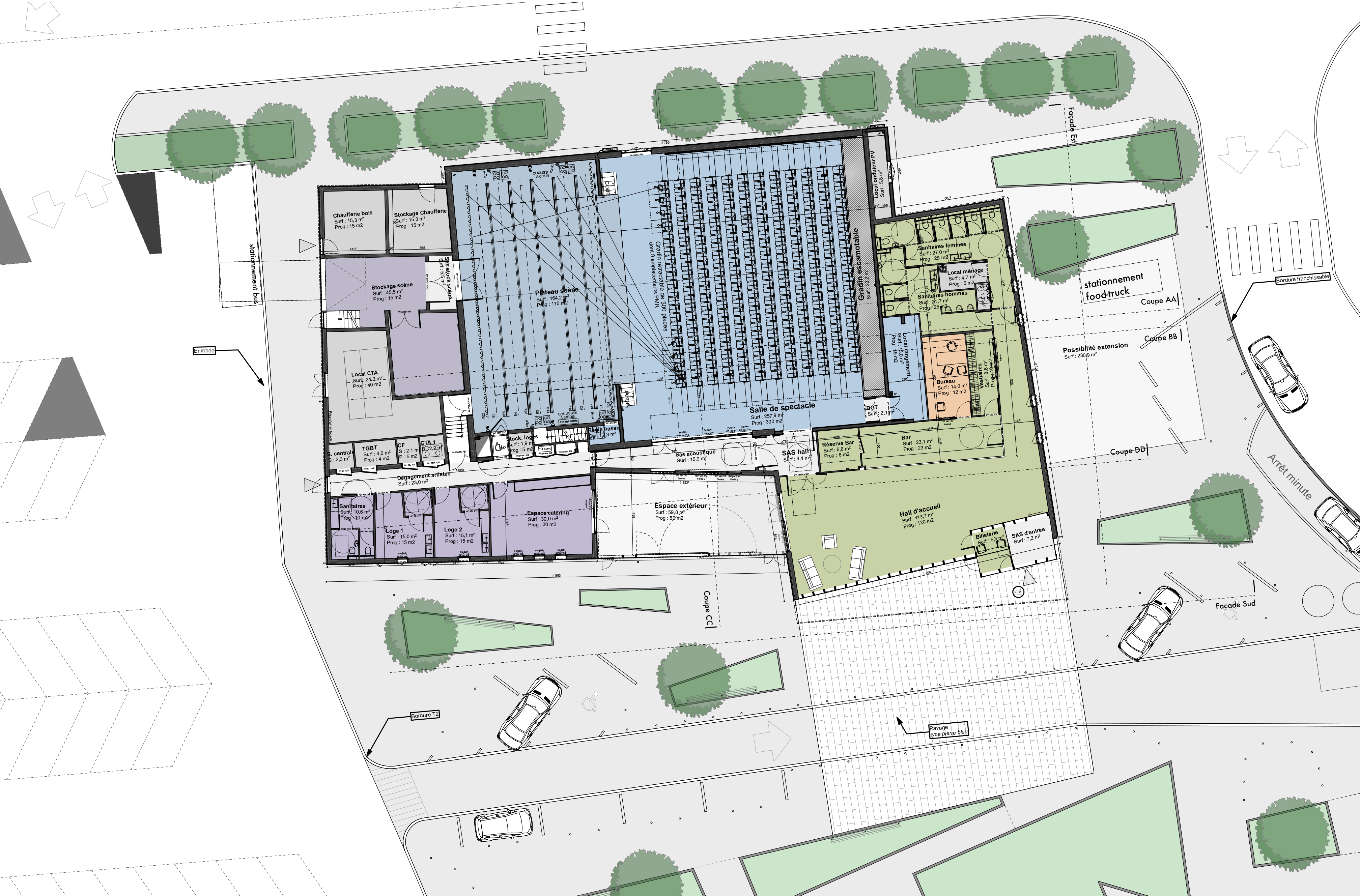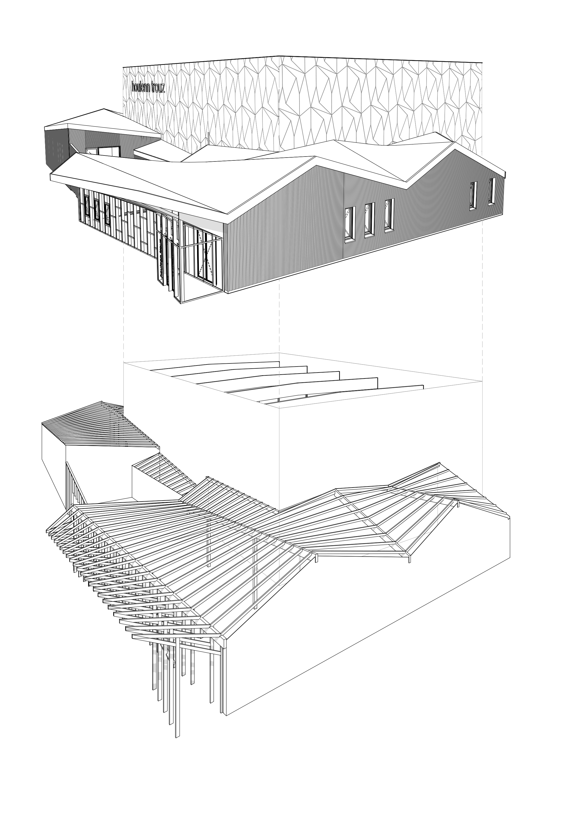 Les façades du volume principal sont rythmées par un motif géométrique. Les locaux annexes plus bas bardés de bois s’enroulent autour de ce volume avec un jeux de toitures gauches caractérisant le bâtiment. Le hall s’ouvre au sud sur la place piétonne. Il est protégé par un large auvent dont les membrures en bois se prolonge dans le hall de façon organique. En complément du jeu de matière entre le béton et le bois, le rouge ponctue le parcours du visiteur jusque dans la salle.