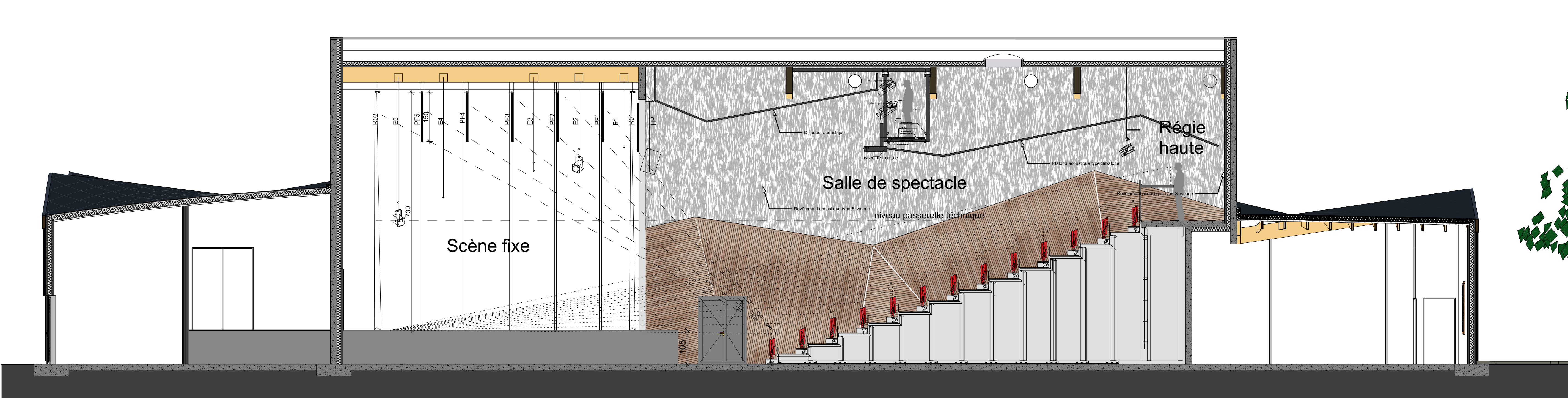 Descriptif technique : Le bâtiment accueille un espace scénique de 170m2 associé à une salle de 300 m2 pouvant accueillir 300 personnes assises sur un gradin et 750 personnes lorsque le gradin est rétracté. Autour de cet espace central se regroupe plusieurs locaux annexes destinées au public à l'est et destinées aux artistes à la technique à l'ouest.