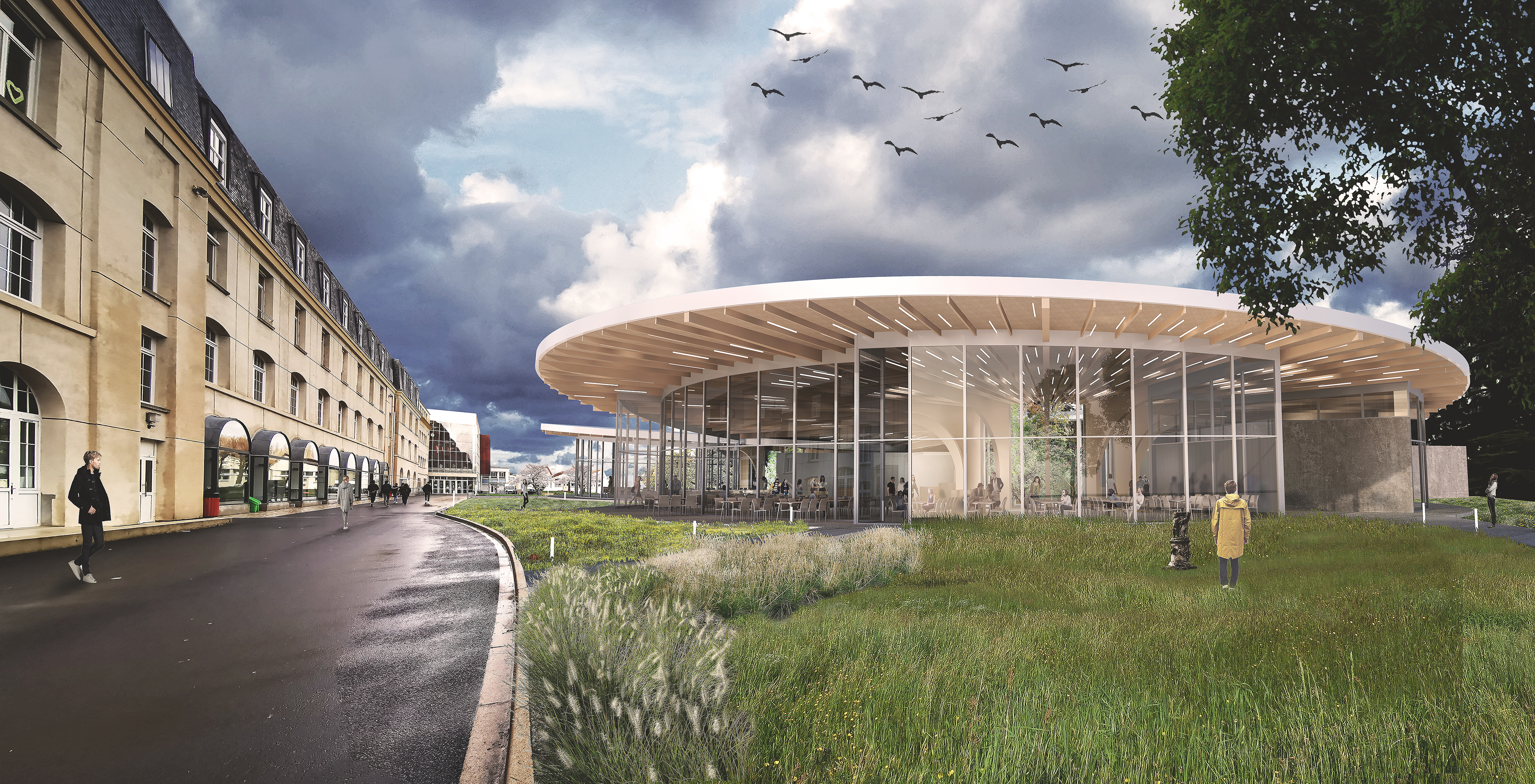 Au cœur d’un vaste établissement scolaire, ce bâtiment marque le site d’une empreinte que nous avons voulu la plus modeste possible : peu élevée, transparente et arrondie, comme pour embrasser la totalité des espaces extérieurs. C'est une construction légère, semblable à deux pétales blanc posés là par le vent, dont les ramures rayonnantes constituent la structure principale du bâtiment. Cette charpente bois monumentale est visible depuis l'extérieur à travers les grandes baies vitrées périphériques, et abrite les deux salles de restauration, avec au cœur de chacune, un patio végétalisé.