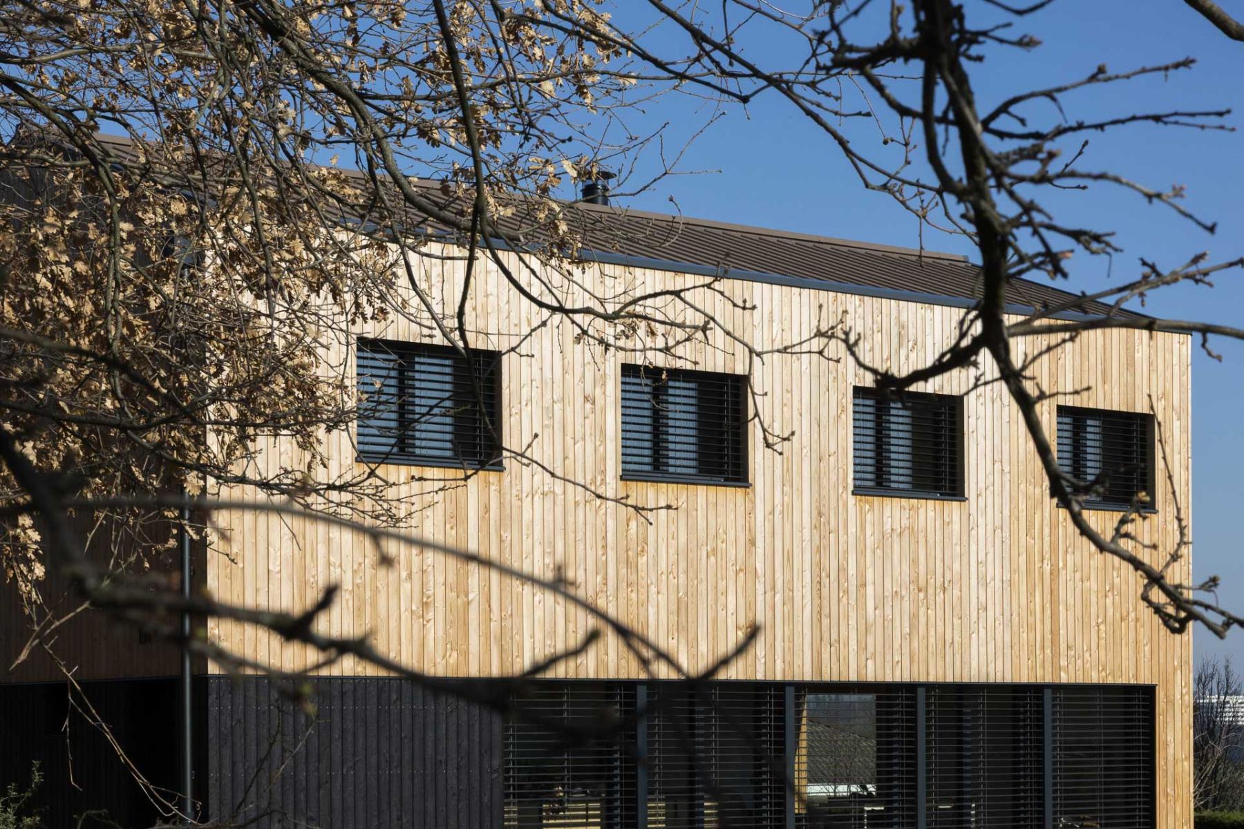 Le projet développe une architecture bioclimatique et sans ostentation qui fait la part belle aux détails et à des solutions aux low-techs afin d’atteindre des performances énergétiques élevés, un confort 4 saison et de procurer de l’agrément d’usage. La maison s’organise sur un socle sombre en bardage de douglas brûlé et largement vitré au Sud connectant le jardin aux pièces de vie. La partie supérieure, vêtue de douglas naturel, est plus "vivante" et s'harmonisera au fil du temps dans des nuances de gris pour faire corps avec la végétation environnante.