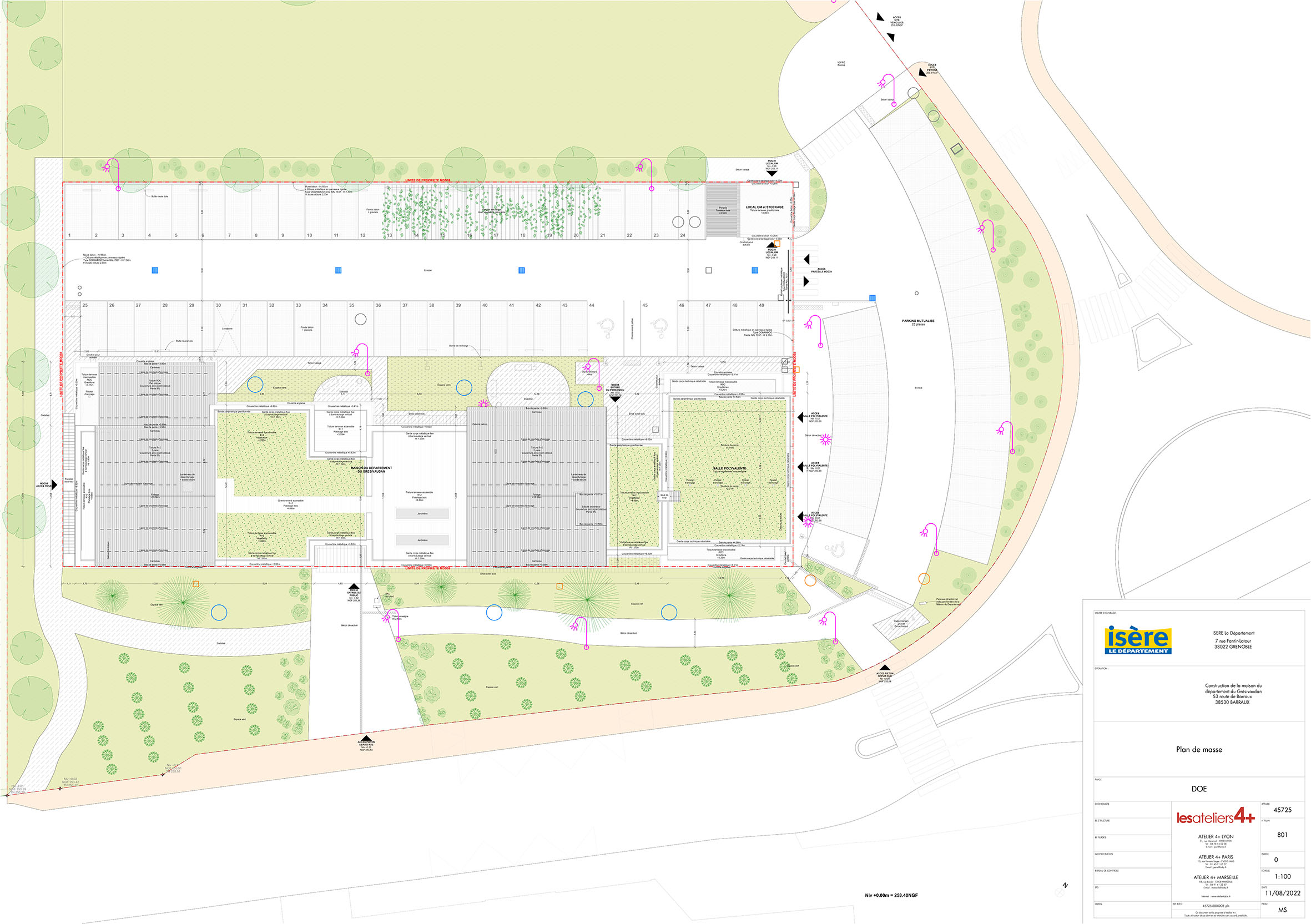 Bâtiment d'équipements d’intérêt collectif accessibles au public (Salle polyvalente,PMI) avec bureaux.Recherche basée sur des formes innovantes affirmant une modernité architecturale en respectant la construction modulaire.L’écriture architecturale s’inspire des formes rectangles(modules préfabriqués).Les ouvertures,la lumière naturelle, les espaces ext. paysagés sont des points participant au confort de vie.L'assemblage des volumes est mis en valeur par le traitement architectural de la ligne de toiture.Terrasses platelage bois. Terrasse R+2 avec jardin potager.