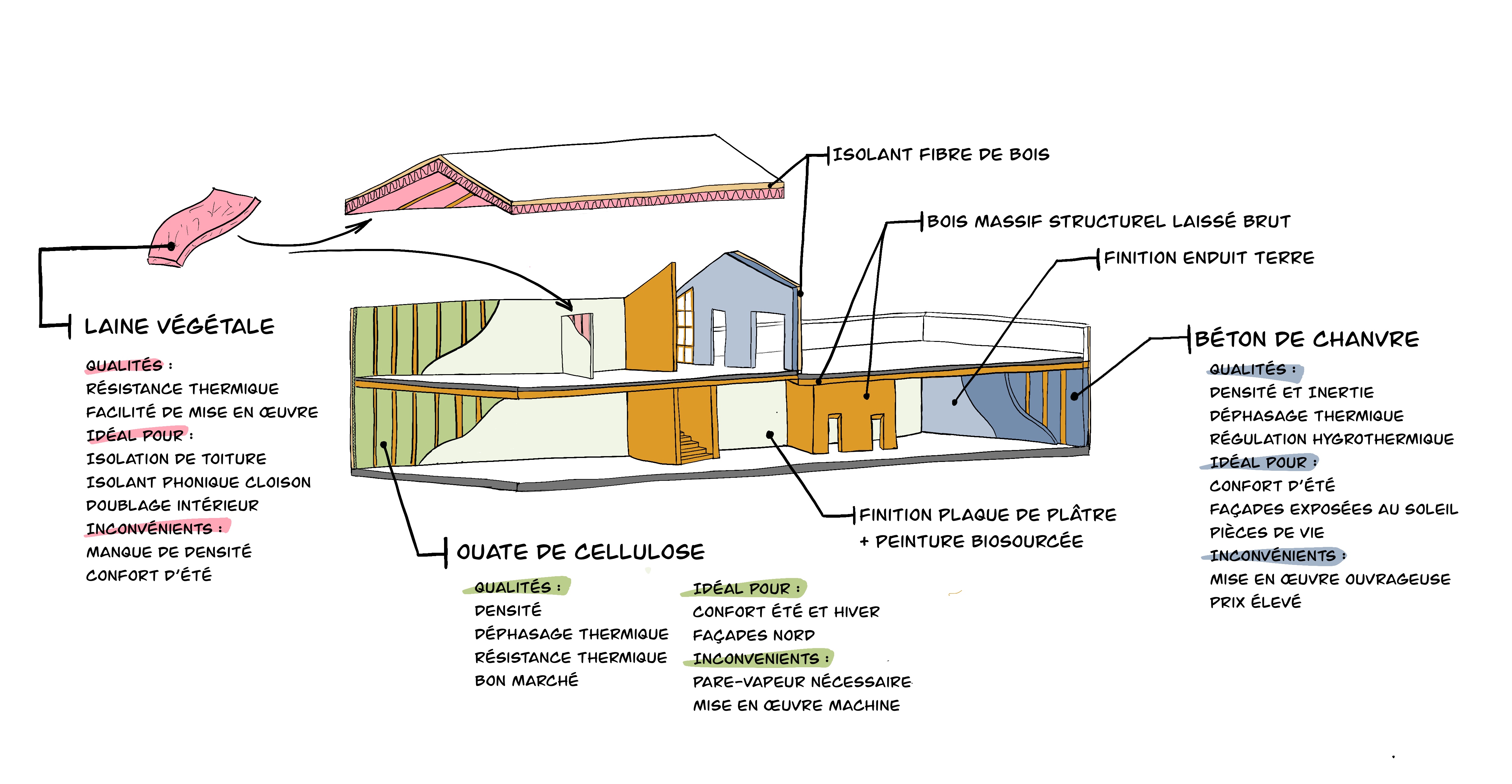 Descriptif technique : Les murs exposés au soleil sont isolés en béton de chanvre revêtus d'enduit terre intérieur issu d'un fournisseur local. Cela permet d'apporter de l'inertie favorable au confort d'été et de réguler les apports hygrothermiques. La façade Nord est isolée et ouate de cellulose et la toiture en laine végétale Biofib trio au même titre que les cloisons intérieures. Le bâtiment a été pensé afin de pouvoir se passer de climatisation et l'installation de panneaux solaires est prévue dès la mise en exploitation des lieux. En terme de mise en oeuvre, le béton de chanvre a été mis en oeuvre en atelier pour les panneaux entièrement préfabriqués de l'étage et projeté in-situ au rez-de-chaussée. Le bâtiment a été pensé et dimensionné pour une extension possible de l'étage sur la toiture terrasse.