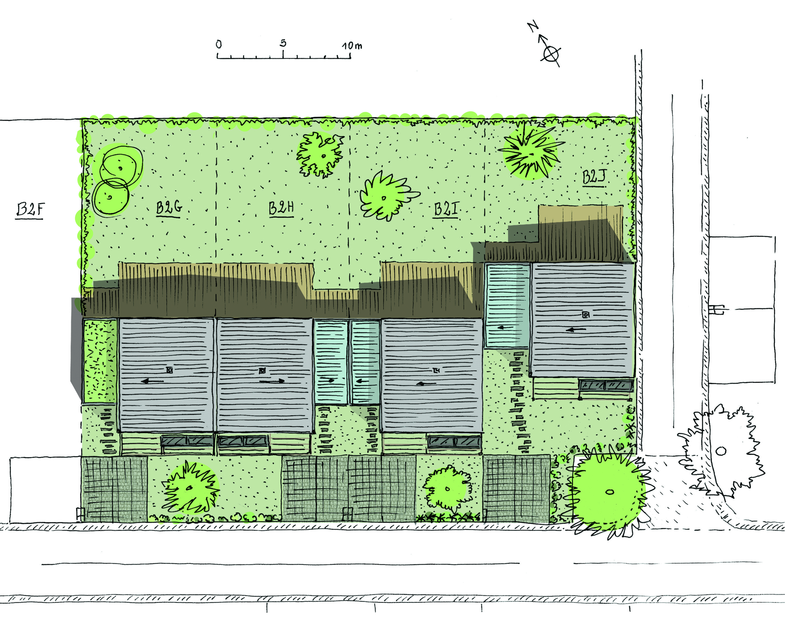 Descriptif technique : Outre les principes constructifs décrits précédemment, les maisons sont conçues selon une approche bioclimatique et "low-tech" favorisant les apports solaires, la compacité et la rationalité. D'un point de vue énergétique, l'accent a été mis sur la performance de l'enveloppe afin de limiter les besoins en chauffage. Seul un poêle à bois assure le chauffage et la ventilation double flux permet de réduire les déperditions énergétiques. L'eau chaude est quant à elle majoritairement produite par deux panneaux solaires thermiques, faisant également office de casquette solaire.