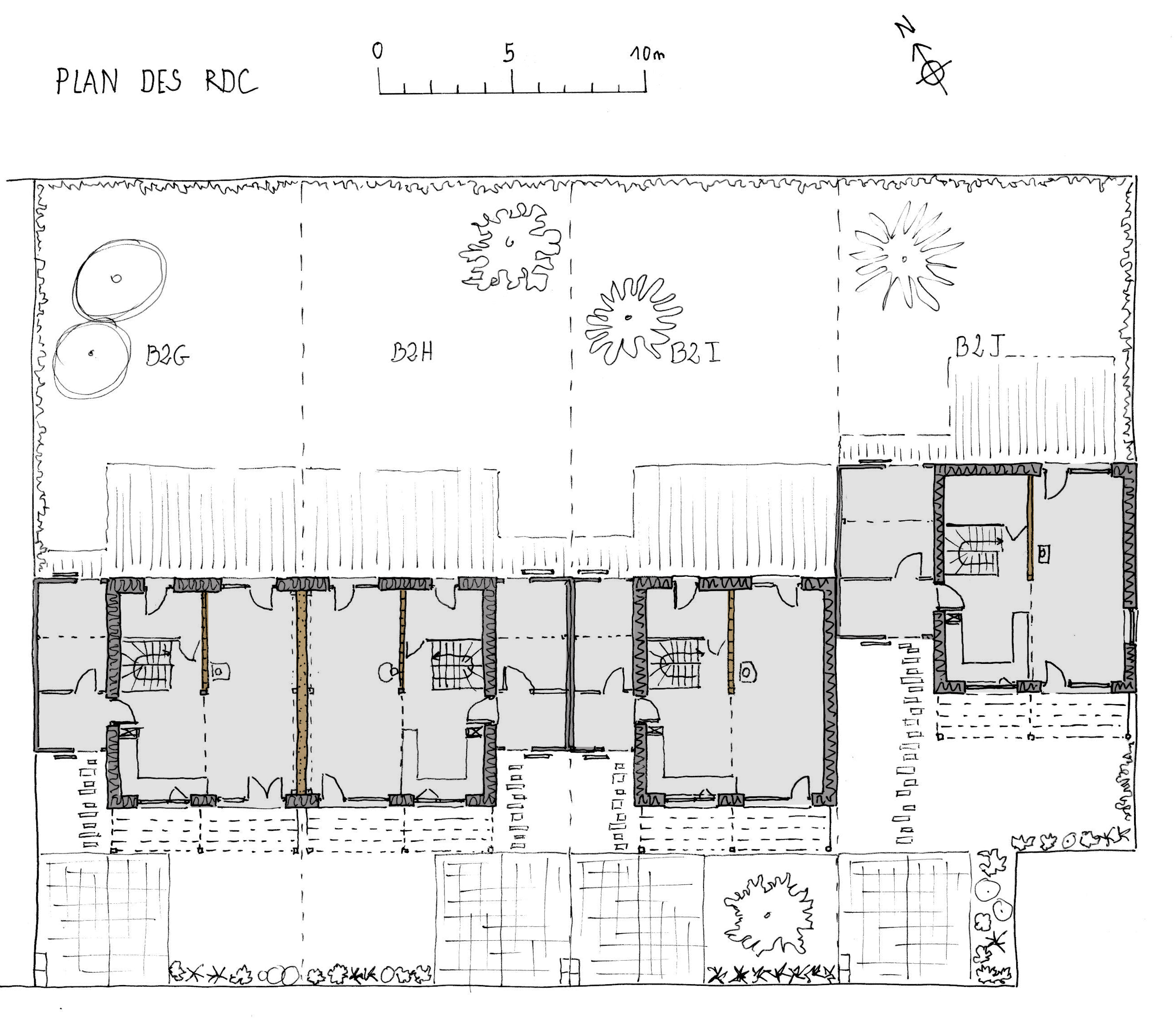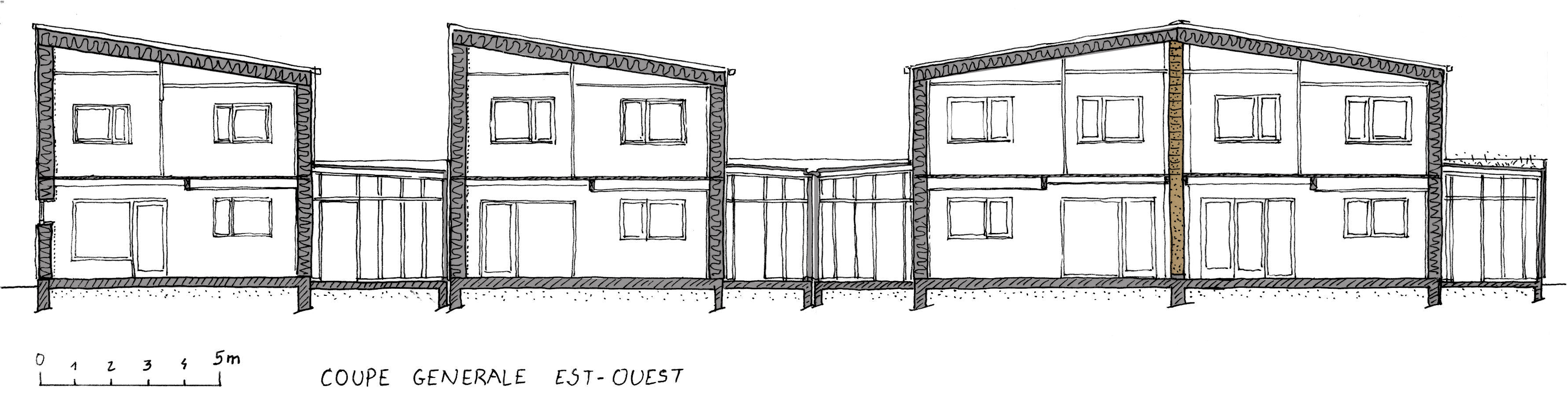 Approche environnementale : Les matériaux utilisés sont biosourcés ou géo-sourcés et issus de filières locales : les murs en ossature bois sont en bois massif issu de la région, l'isolation des murs et de la toiture est réalisée en bottes de paille provenant du 49, le bardage bois est en douglas, parfois naturel, parfois peint à l'ocre naturelle rouge ou noir de falun. La terre issue du site est massivement employée : le mur de refend entre les maisons mitoyennes est réalisé en adobes et en bauge, les murs de masse situés derrière les poêles sont faits d'adobes ou de torchis et des enduits intérieurs sont en terre crue.