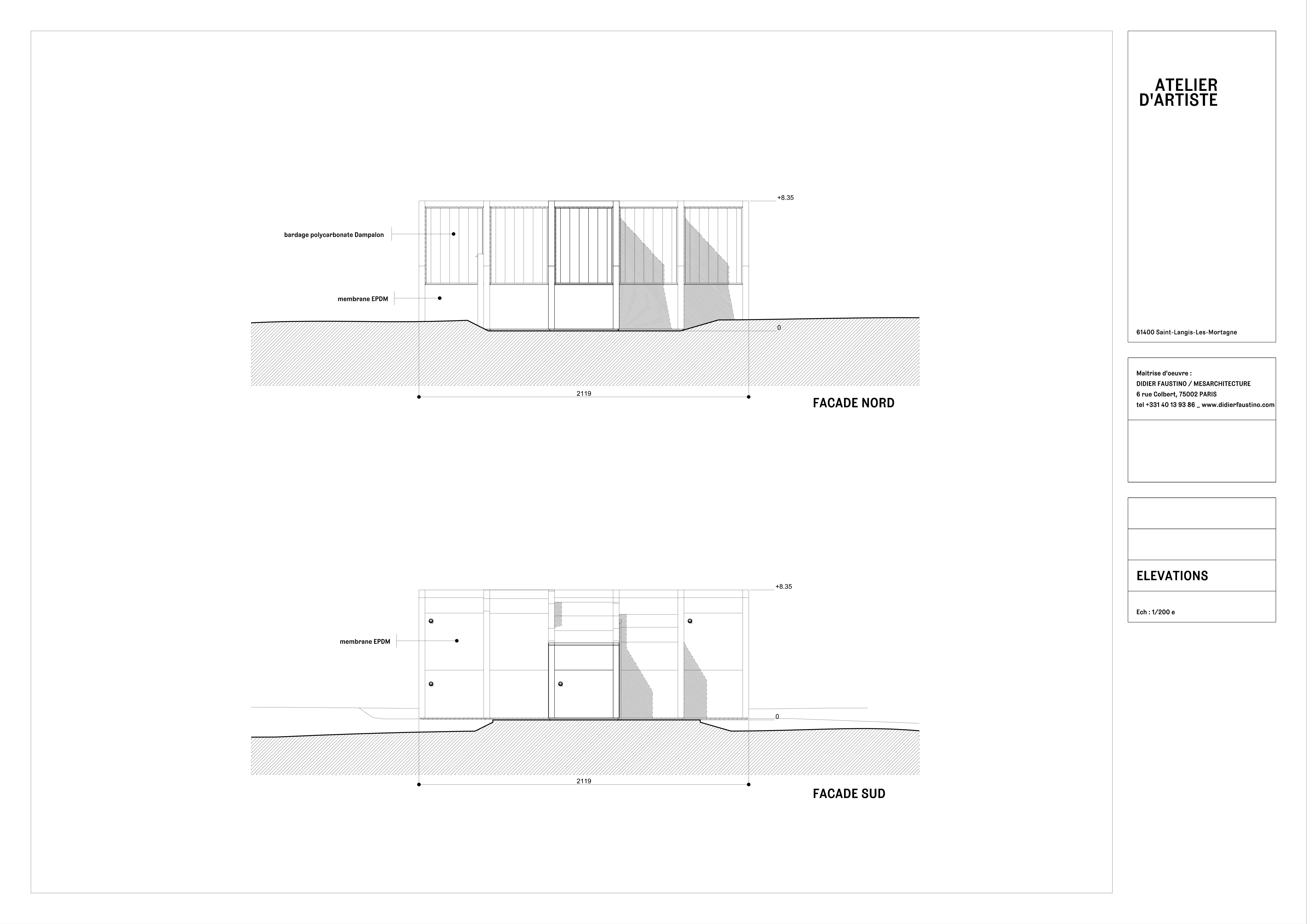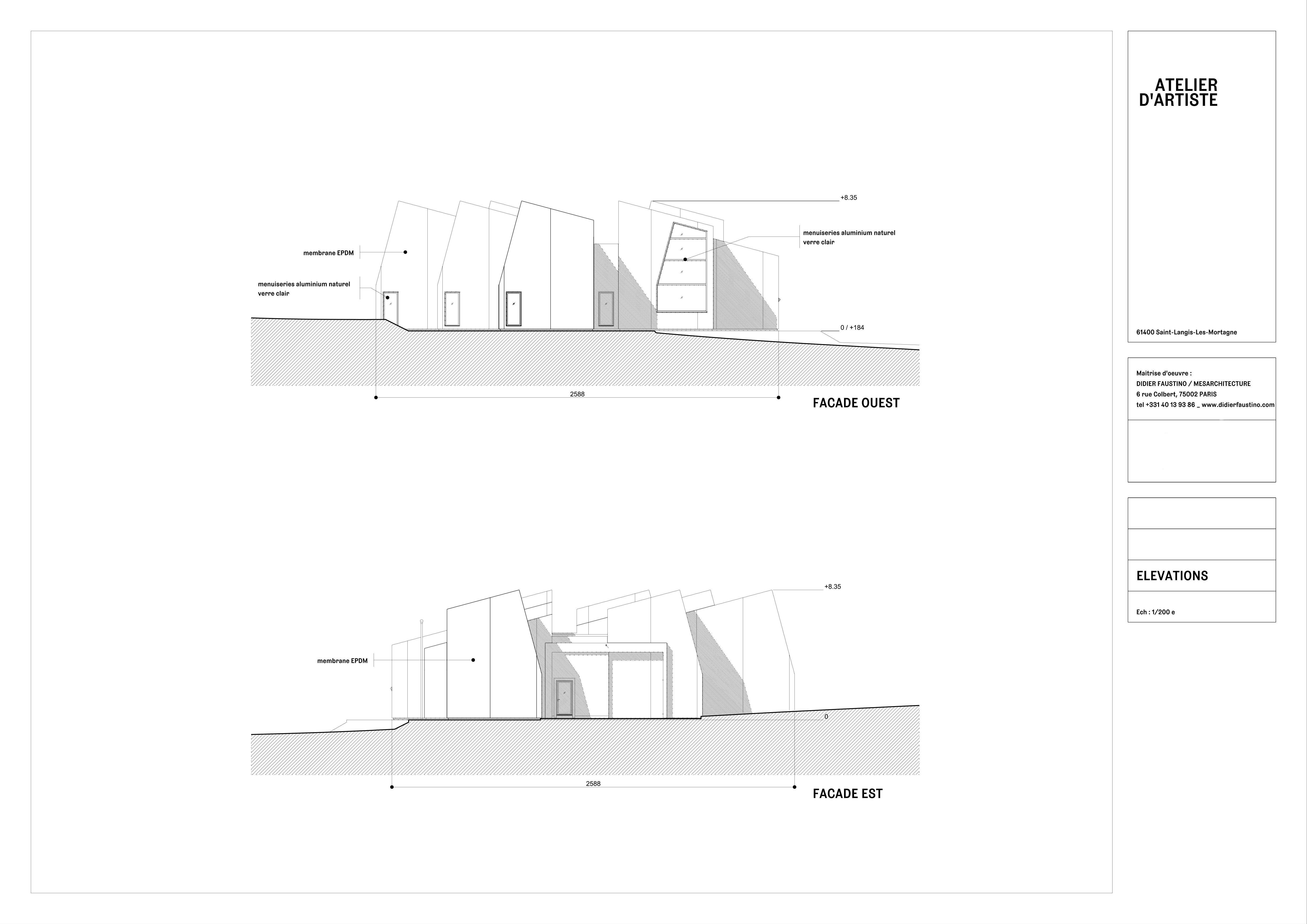 Descriptif technique : De l'extérieur, le bâtiment est composé de l'assemblage d'une série de volumes identiques répartis en décalages constants sur cinq travées parallèles de 4m de large. Chacun de ces volumes présente une façade inclinée translucide plein nord, un rampant de toiture nord-sud terminé par une paroi verticale opaque en continuité du toit. À l'intérieur, l'assemblage défini un espace ouvert de 265 m² au sol sous 8m de hauteur au faîtage, coupé en son centre par une faille est-ouest où se situent l'entrée et l'accès à une mezzanine de 100 m². Les murs et toitures sont réalisés en caissons à ossature bois préfabriqués fixés sur une dalle en béton armé et recouverts d'une membrane en caoutchouc noir étanche.