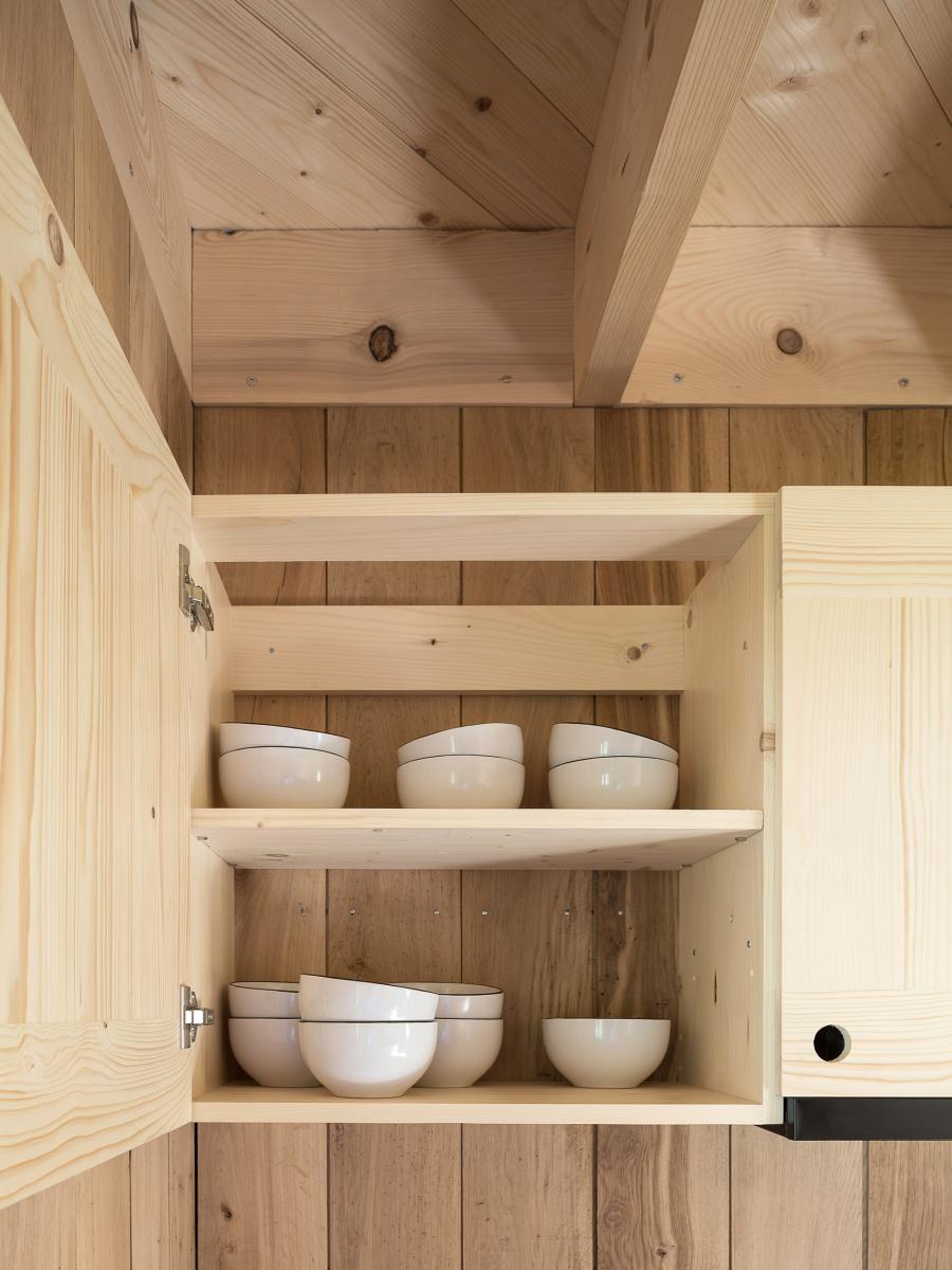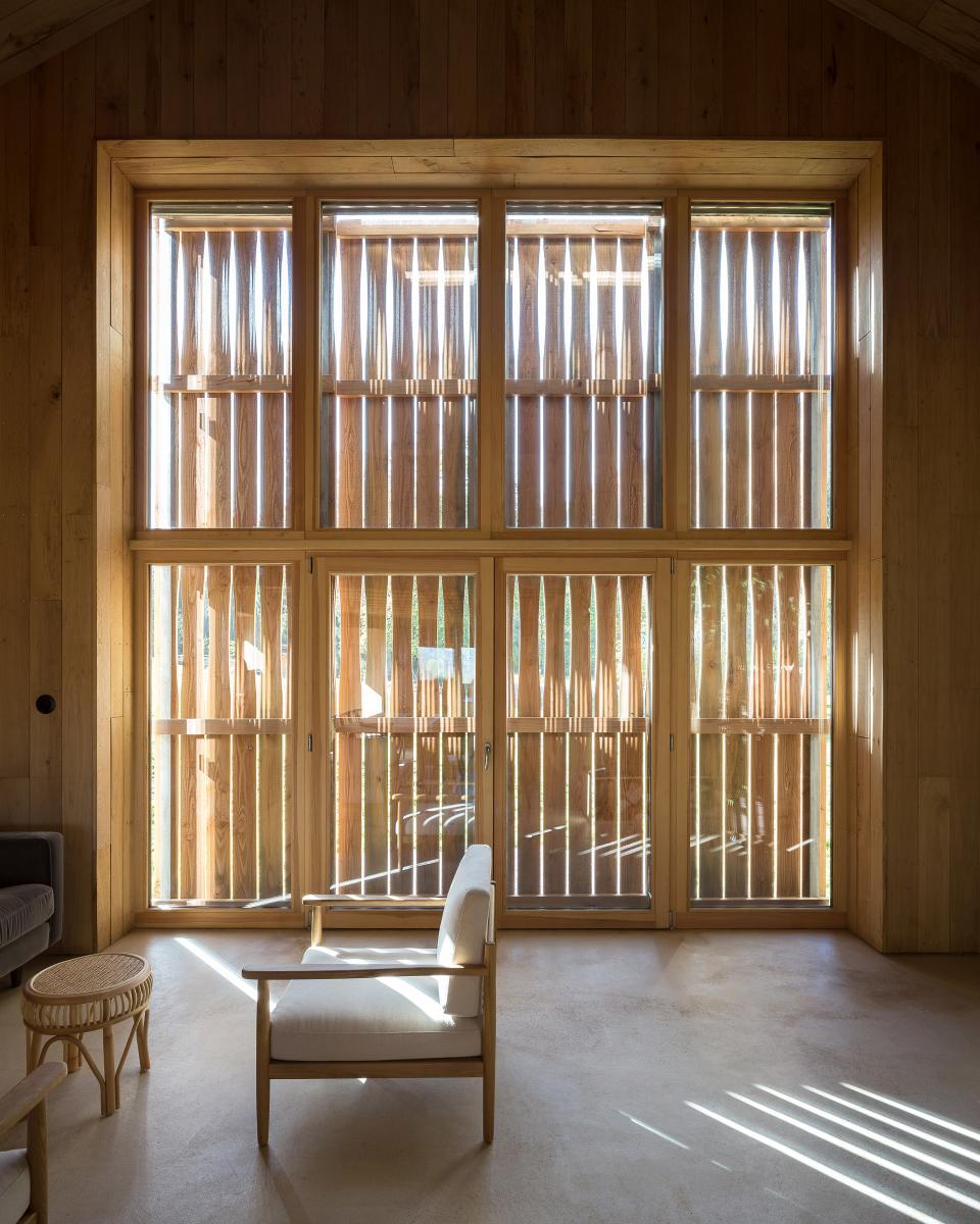 Approche environnementale : Nous nous sommes interdit tout bois industriel. Aucun panneau, aucun lamellé-collé. Dessiner avec du bois massif permet de garantir une provenance locale de la totalité des bois pour la structure comme pour le mobilier. Un intérieur en planches de chêne, qui nous fait découvrir un nouvel univers de couleurs, de motifs, d'odeur, de robustesse. Et puis comment ne pas (trop) perturber la prairie, être capable de disparaître totalement un jour ou l'autre.