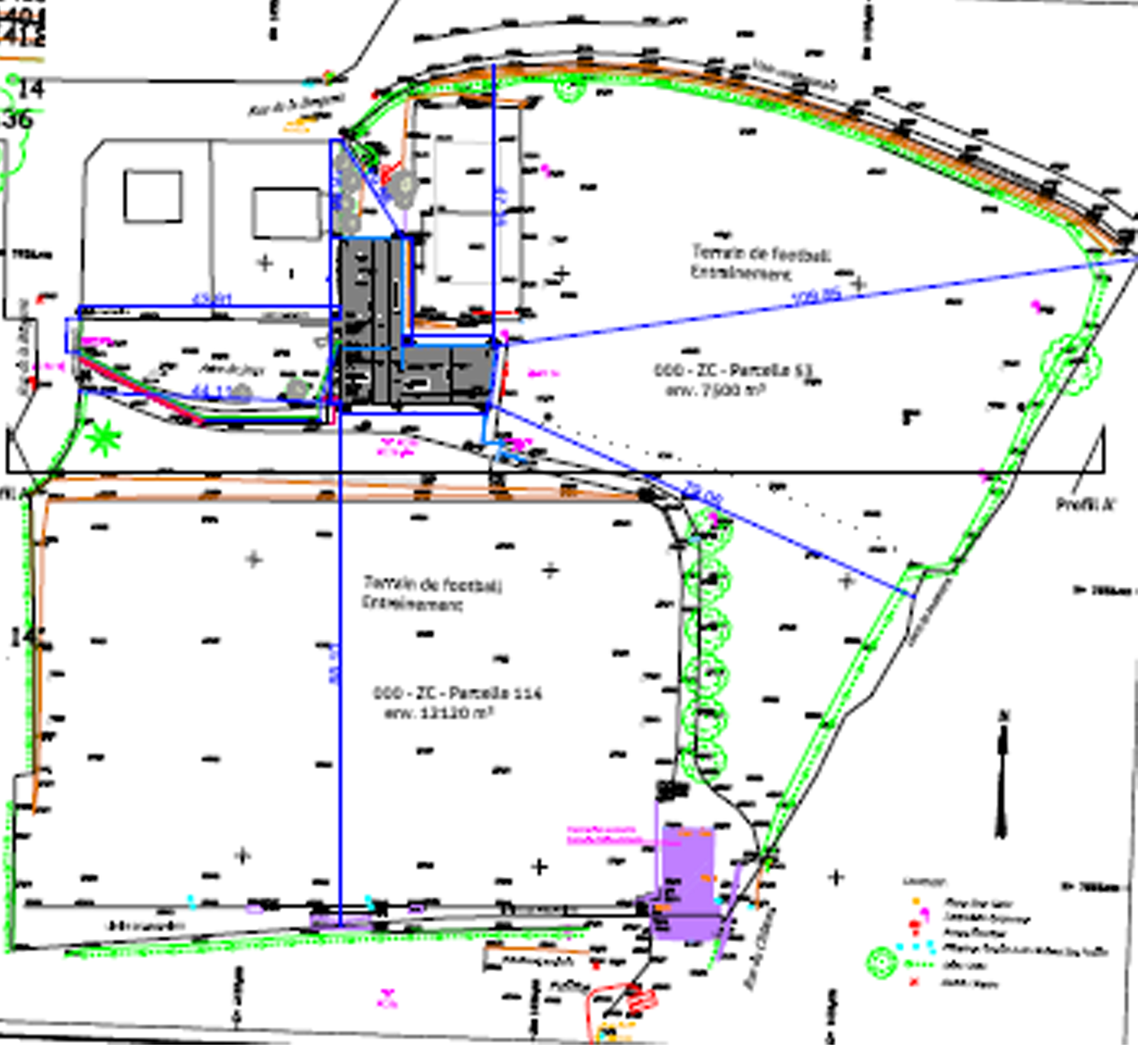 Le nouvel équipement accueille sportifs, enfants et spectateurs. Implanté à l’articulation des différents accès, il permet une vue panoramique sur les espaces de jeux et le bourg. Reprenant la volumétrie traditionnelle de la longère agricole, il est composé de deux volumes distincts reliés par un auvent. Les vestiaires sont implantés sur la partie nord, en limite de propriété et orientés vers le terrain de tennis. Entre les deux volumes, l’auvent dessert tous les espaces et s’élargit pour créer un large préau donnant sur le terrain d’honneur et club-house, articulation de l’équipement sportif.