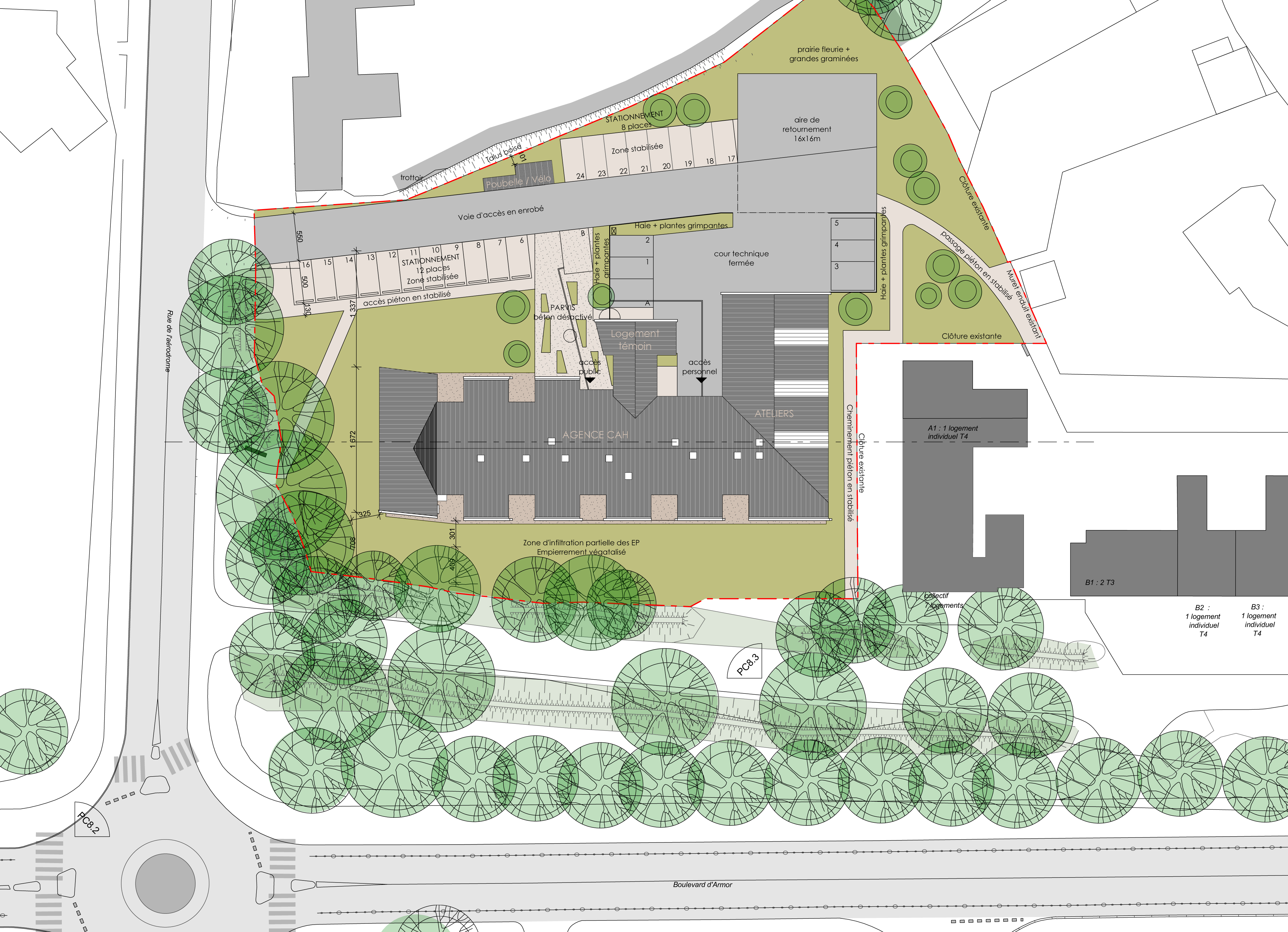 Descriptif technique : Les toitures du projet et certaines façades sont habillées de bacs métalliques noir, interrompus pour la lumière dans l’atelier par des panneaux polycarbonate ; Les pans Sud en contact avec les grands arbres sont constitués de cassettes en aluminium poli afin de refléter la lumière, le mouvement, le paysage ; En façade Nord, les pans de mur sont revêtus de bois Douglas naturel ; Et enfin le parvis d’entrée conduit vers un patio lui-même bardé de cassettes métalliques aux couleurs de Terres d’Armor Habitat. Ce parvis en béton désactivé associé à des parterres réguliers ainsi que les stationnements en sable assurent la perméabilité du site, pour compléter la noue paysagère. Le bâtiment prend ainsi sa place en douceur dans cet environnement au fort caractère paysager.