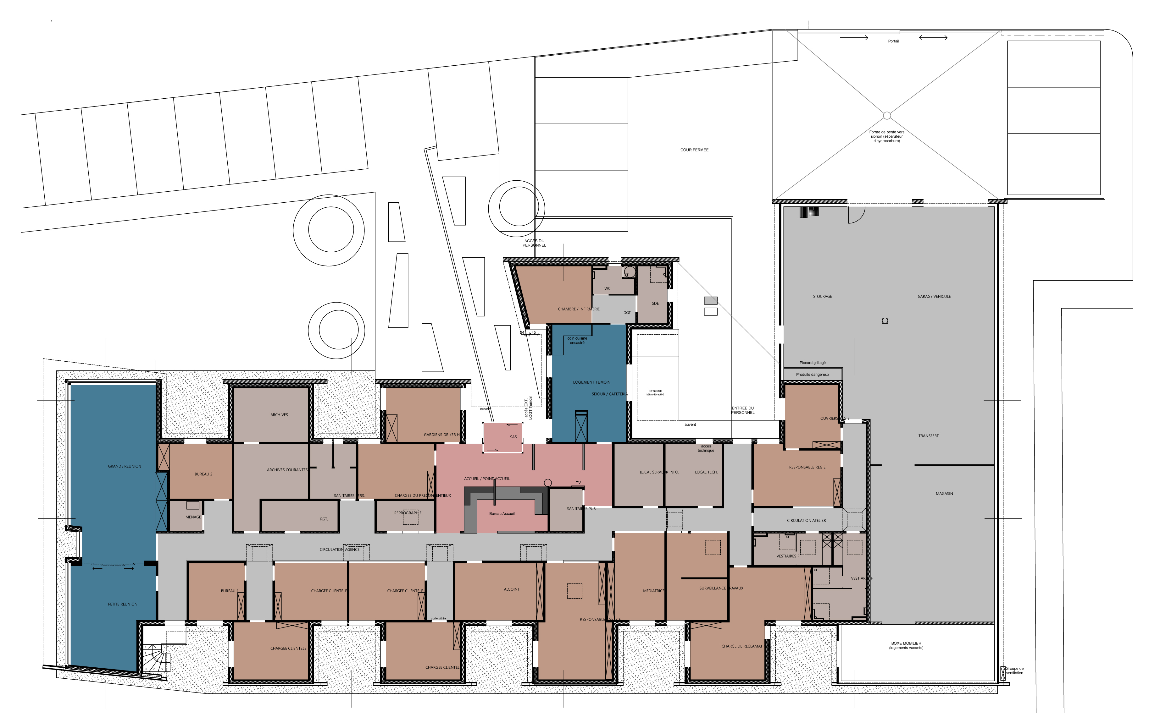Approche environnementale : L’approche environnementale du projet réside dans une construction 100% ossature-charpente bois hors dalle en béton flottante. L’ensemble est bardé et couvert en métal à l’exception de la façade Nord en bois. Des murs rideaux et du mobilier complètent les dispositifs en bois. Ce sont ensuite le chauffage central au gaz et la ventilation double flux haute performance, associés à des isolants et une étanchéité à l’air maitrisée, qui assurent l’équilibre thermique de la construction. La gestion des eaux de pluie est gérée à la parcelle grâce à une large noue périphérique.