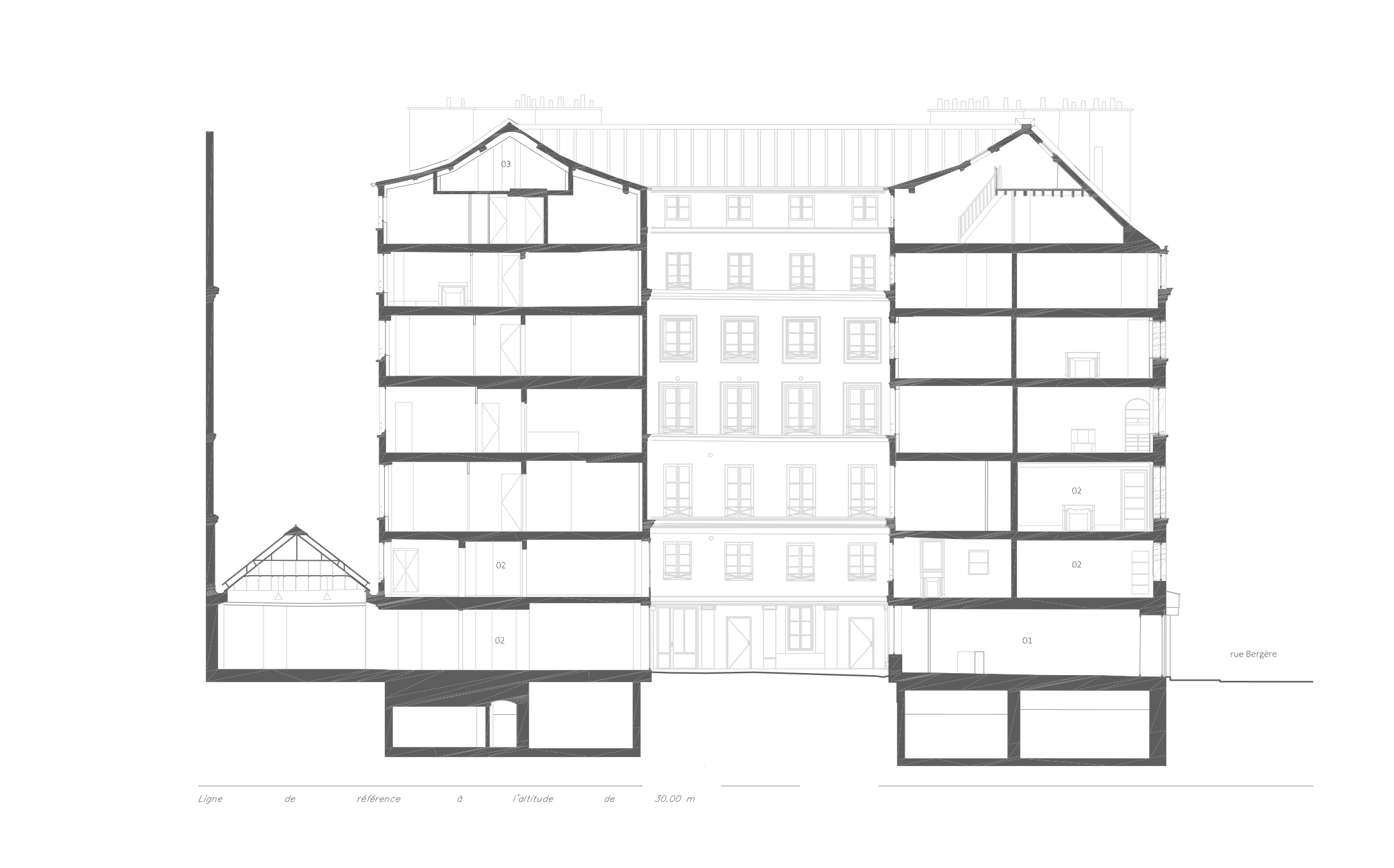 Cet immeuble d'habitation construit au début du XIXe siècle et situé en périmètre inscrit au titre des bâtiments de France projet a fait l'objet d'une réhabilitation lourde, avec remaniement typologique en site semi-occupé. Le système constructif en pans de bois et moellons, les reprises ponctuelles, et la présence de plomb et d'amiante ont conféré au bâti une complexité et une fragilité. Méthodologie sur mesure, anticipation, dialogue habitant, capacité d’adaptation, reprises en structure bois traditionnelle et réemploi des parquets existants rythment cette expérience.