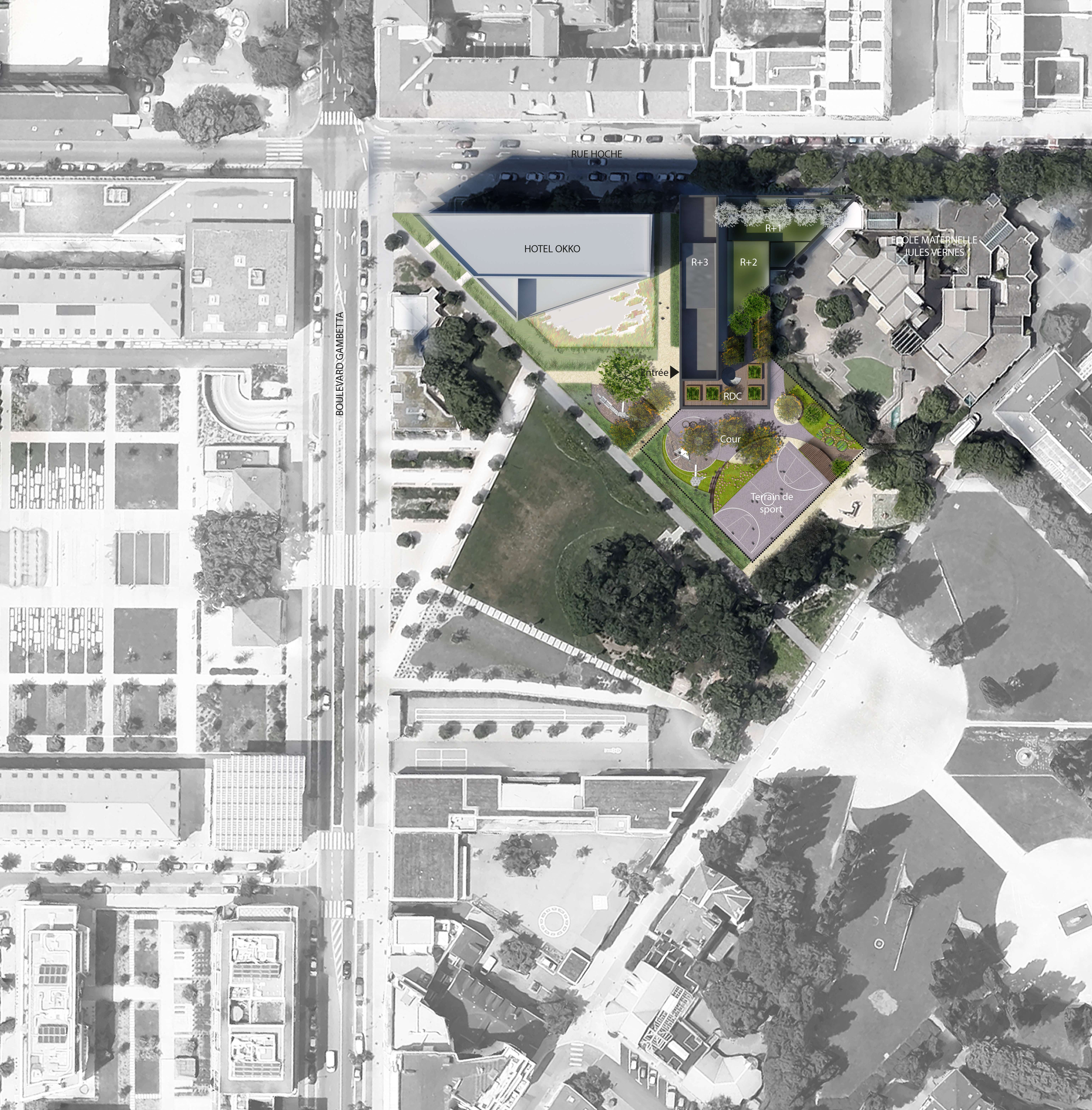 Face aux volumes hauts de la rive nord de la rue, l'école complète l'alignement de la rive sud, entre le petit gabarit de l'école Jules Verne et le volume imposant de l’hôtel OKKO. Surélevé d'un étage technique ce monolithe gagne de l'élancement et la forme d'affronter le pignon de l'hôtel et d'en prendre la mesure. Ce face à face construit le passage vers le parc et guide vers l'entrée de l'école, sécurisée au cœur du jardin, à la croisée des allées piétonnes.