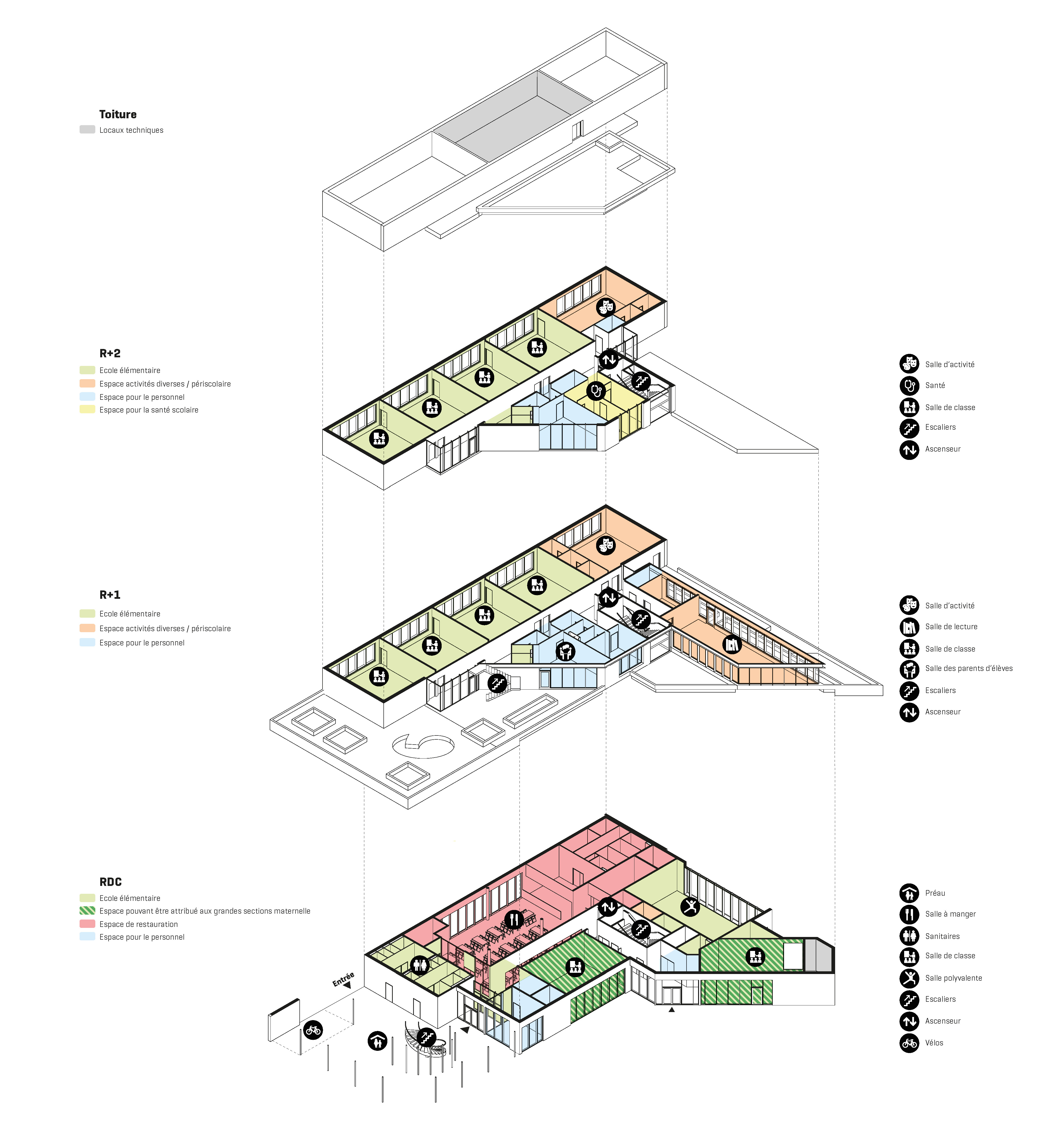 Approche environnementale : La plateforme du socle accueille sur sa terrasse, au nord, la salle de lecture et, au sud, sur deux niveaux, les salles de réunions. Ces deux « cabanes » posées sur le toit, construites en ossature et mur rideau bois, cultivent l’aspect des kiosques qui habitent généralement les parcs urbains. Leur volumétrie construit le crescendo de l’école vers l’ouest, prépare et conforte l’émergence du bâtiment des classes. Leurs toitures végétalisées offrent aux habitants des immeubles voisins deux tapis verts, qui réinterprètent et confortent, à des fins techniques, l’évocation du parc.