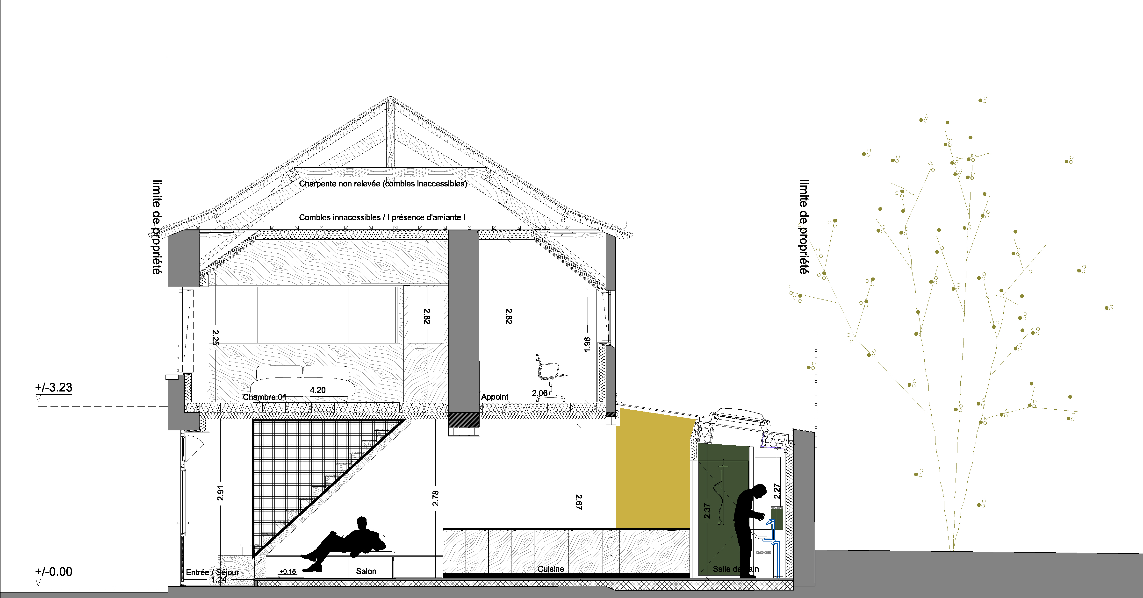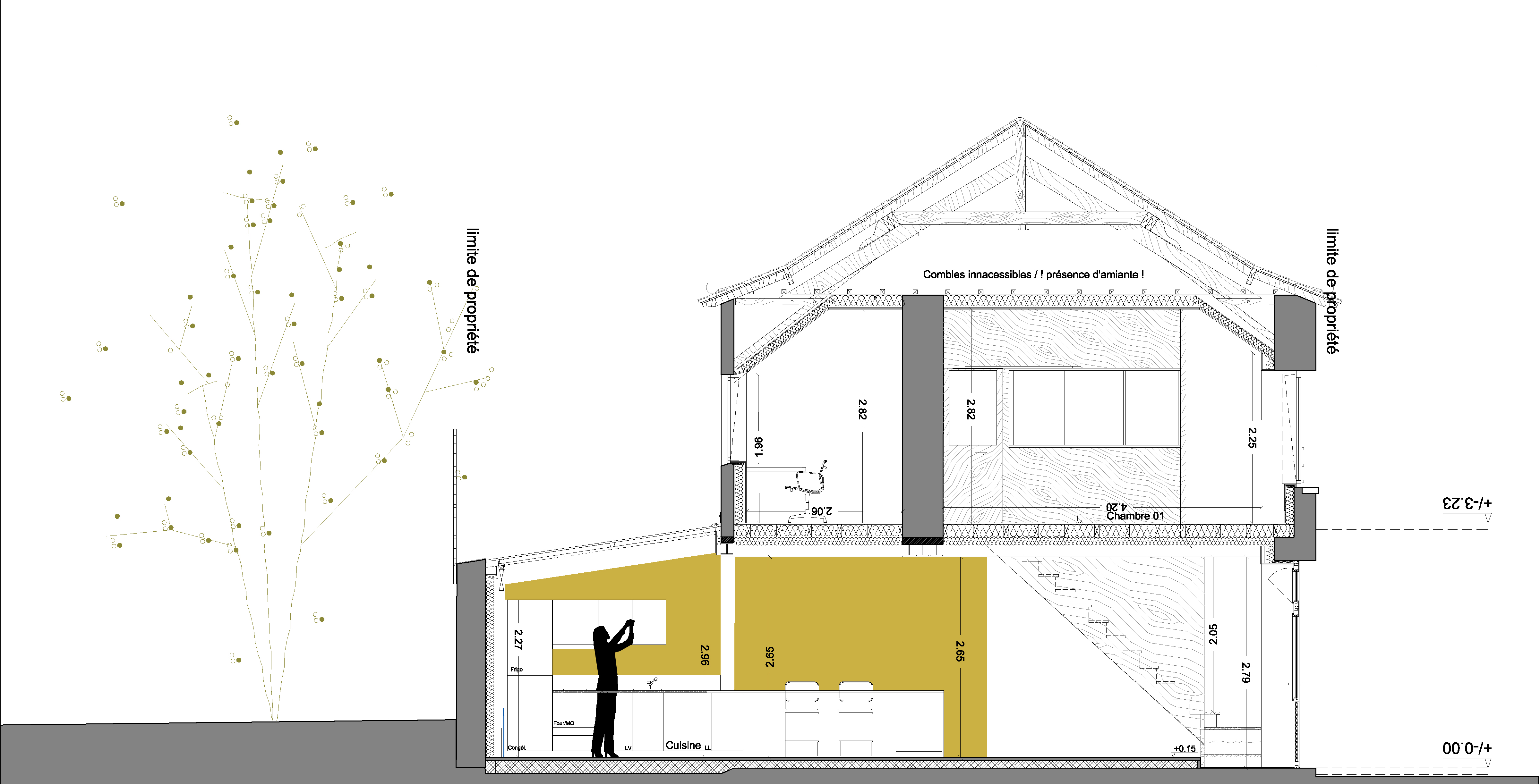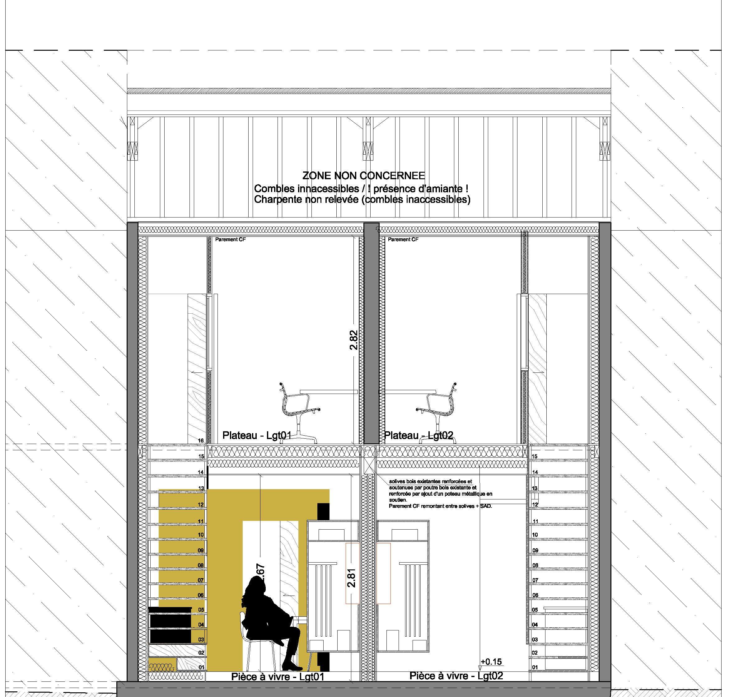 Descriptif technique de l'aménagement : Le défi d’un tel aménagement fut de donner une sensation d’espace dans un volume long et étroit, pour ce faire deux stratégies - deux plans. Le premier logement affirme la profondeur du volume avec un agencement latéral se déclinant le long de la pièce à vivre entièrement décloisonnée. Le peuplier et le pin brut s’associe au noir pour apporter contraste et lignes graphiques dans cet espace exigu. Le deuxième logement à l’inverse ne dévoile pas d’emblée sa profondeur de champ. L’espace se crée par sa dimension cachée, ce qui ne se voit pas s’imagine... Pin et peuplier brut sont à nouveau déclinés dans une séquence accompagnant l’occupant à l’étage. Associé au pin et au peuplier, un ocre jaune vient capter et réhausser la lumière des espaces à vivre telles les ailes jumelles du ruban fauve.