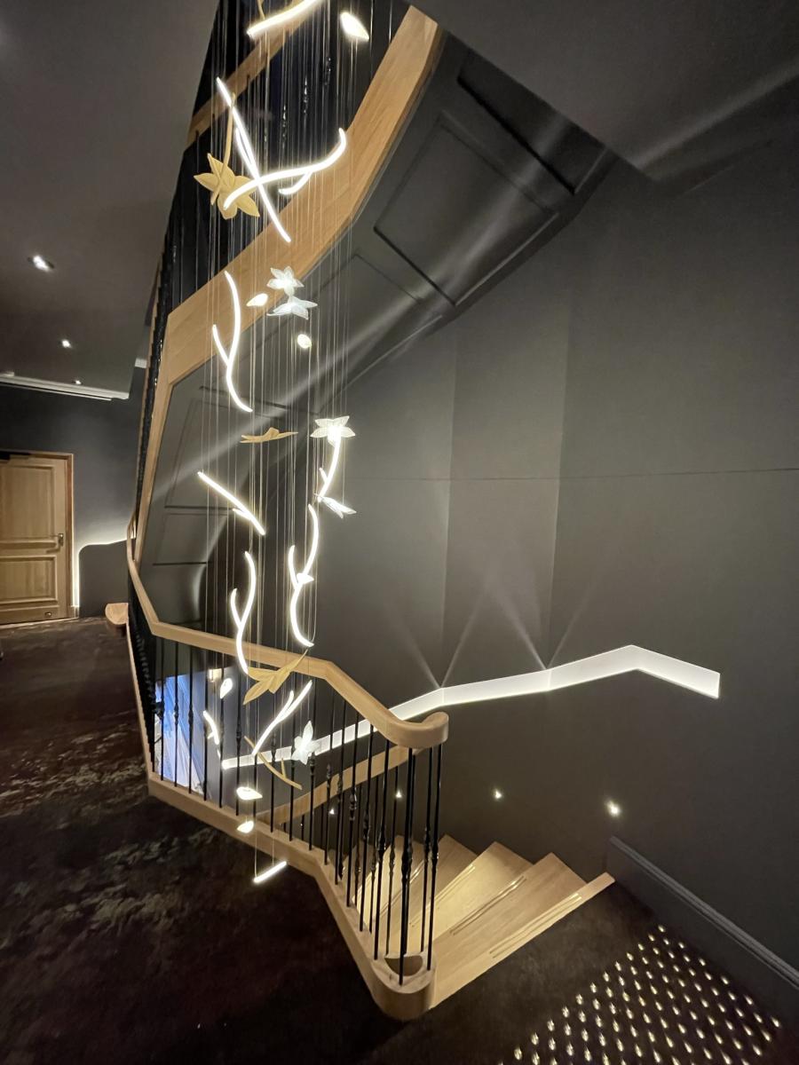 Descriptif technique de l'aménagement : Escalier en chêne sur deux niveaux avec garde-corps rampant continu avec raccord courbe. Mur sur ossature bois avec main courante encastrée rétroéclairée. Anti déparant en laiton. Aménagements à portes moulurées sous la première volée. Lambris rampant mouluré en sous face de la deuxième volée. Volées de l'escalier balancées avec marches camardées.