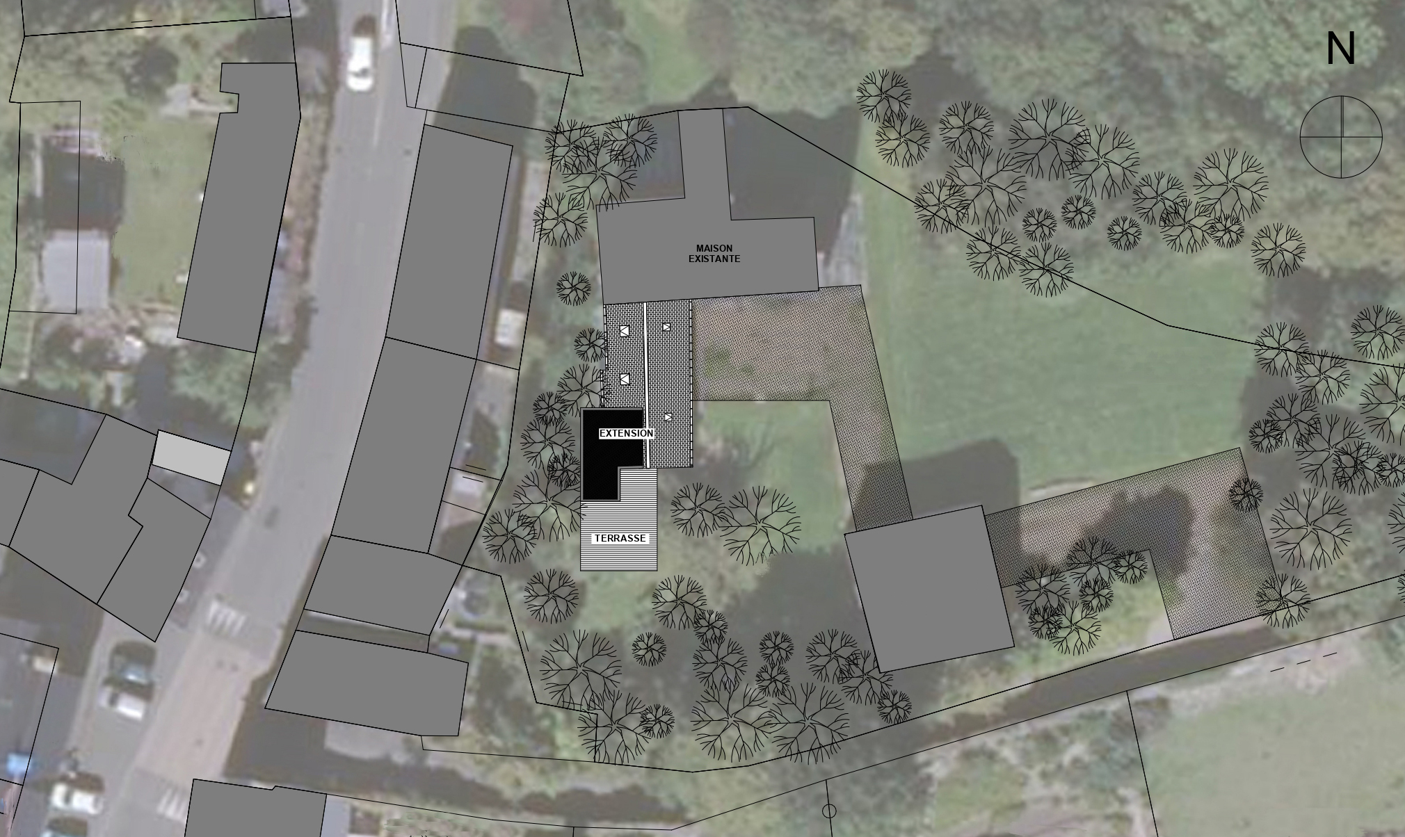 Approche environnementale : La construction est relativement classique par son ossature et sa charpente bois réalisée en caissons insufflés en ouate de cellulose. Le complément en laine de bois intérieur associé à une étanchéité à l’air bien maitrisée permet un chauffage au bois d’appoint suffisant. L’extension permet surtout de profiter d’une grande largeur de vitrage exposé au Sud, que des châssis de toit accompagnent pour la ventilation en cas de forte chaleur. L’ensemble des bois de structure et de terrasse sont en Douglas non traité.