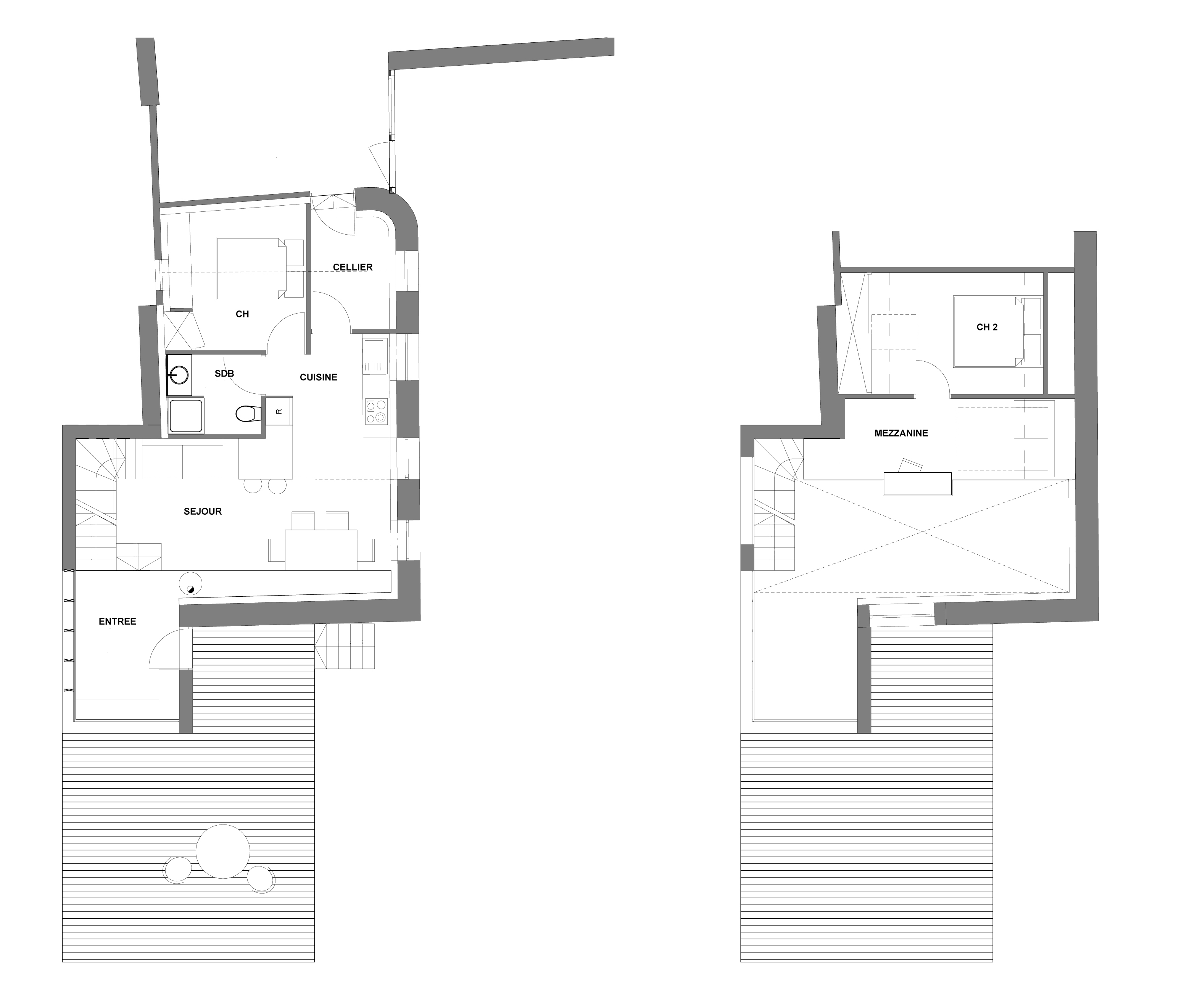 La deuxième extension de cette maison traditionnelle en pierre permet de valoriser un appentis jusque-là non aménagé pour augmenter la capacité d’accueil de l’habitation. L’extension au toit plat permet à la fois de déporter la circulation verticale toujours problématique dans les volumes traditionnels, mais surtout de valoriser la vue sur le paysage grâce aux percements généreux ouverts sur une terrasse-promontoire non moins généreuse. Le vide intérieur profite à une mezzanine avec bureau sur le panorama.