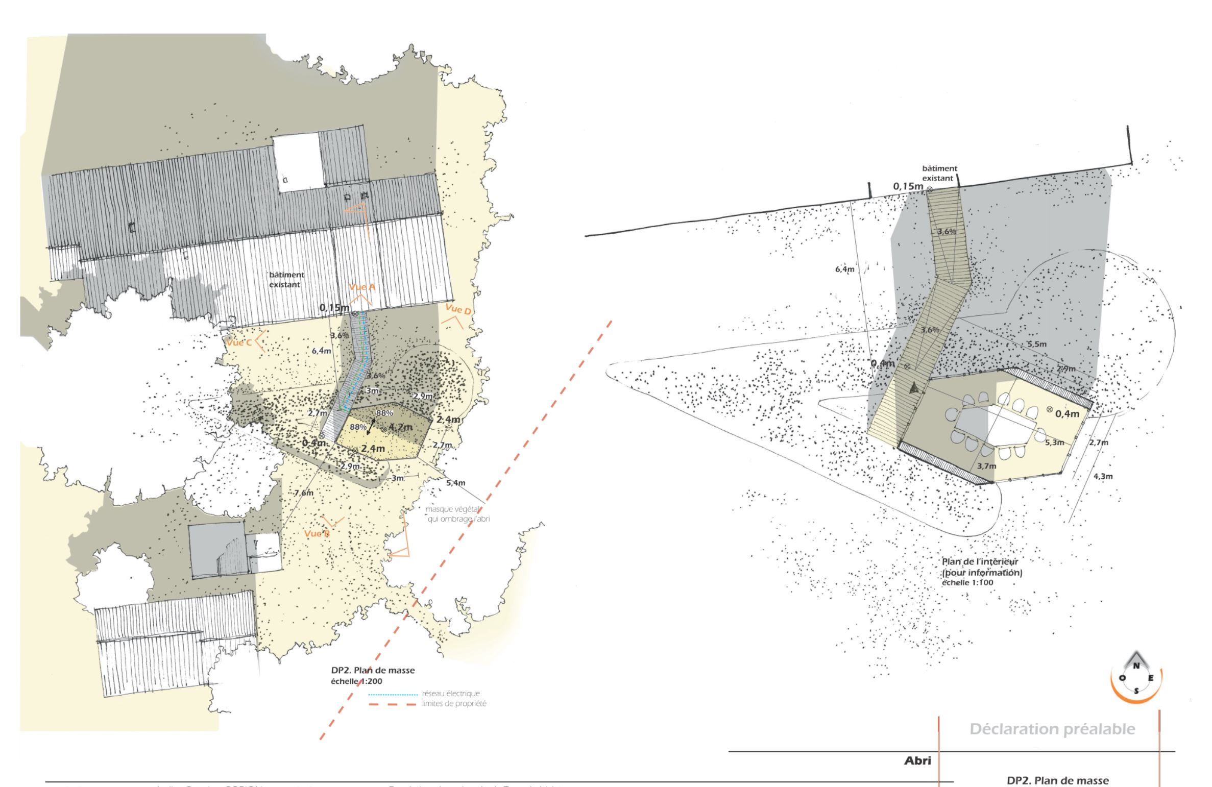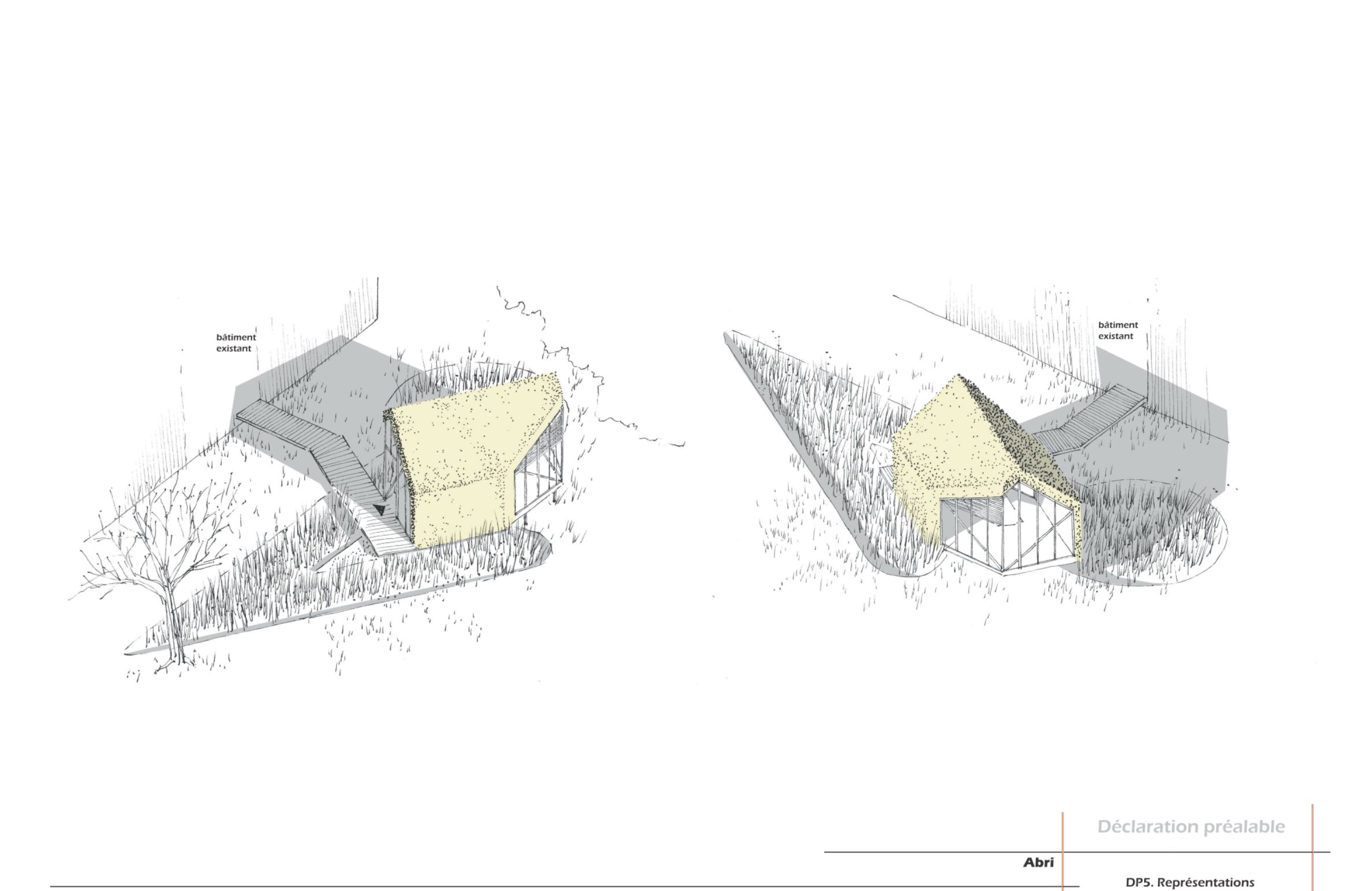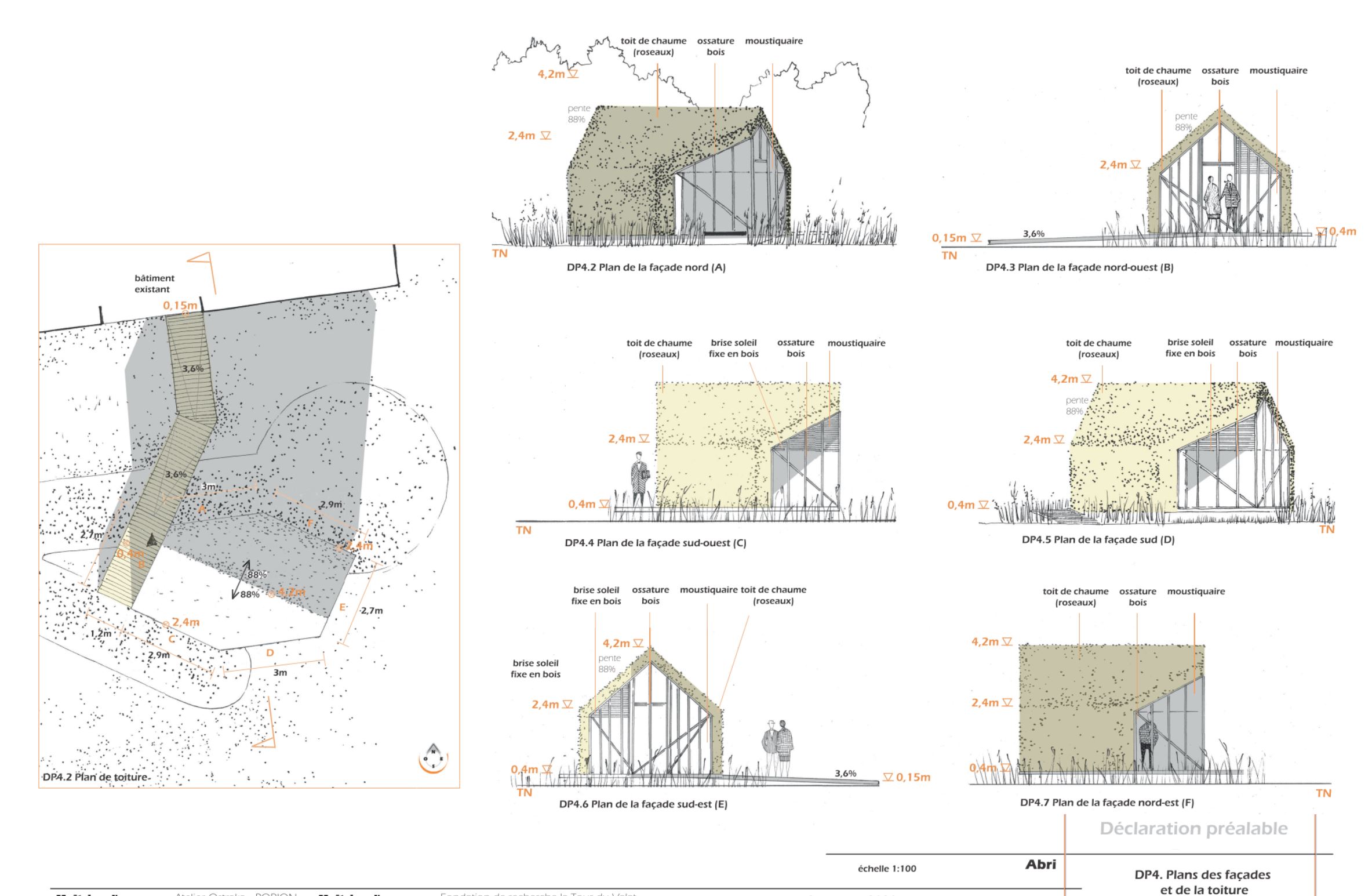 Descriptif technique : Pilotis métalliques visés, plancher bois et platelage bois (Douglas) pour la salle et le ponton. Ossature bois pour les élévations (Douglas) Panneaux OSB travaillant Vêture en roseaux Moustiquaires entre ossature non vêtue pour lumière et ventilation. Brise soleil bois (Douglas)