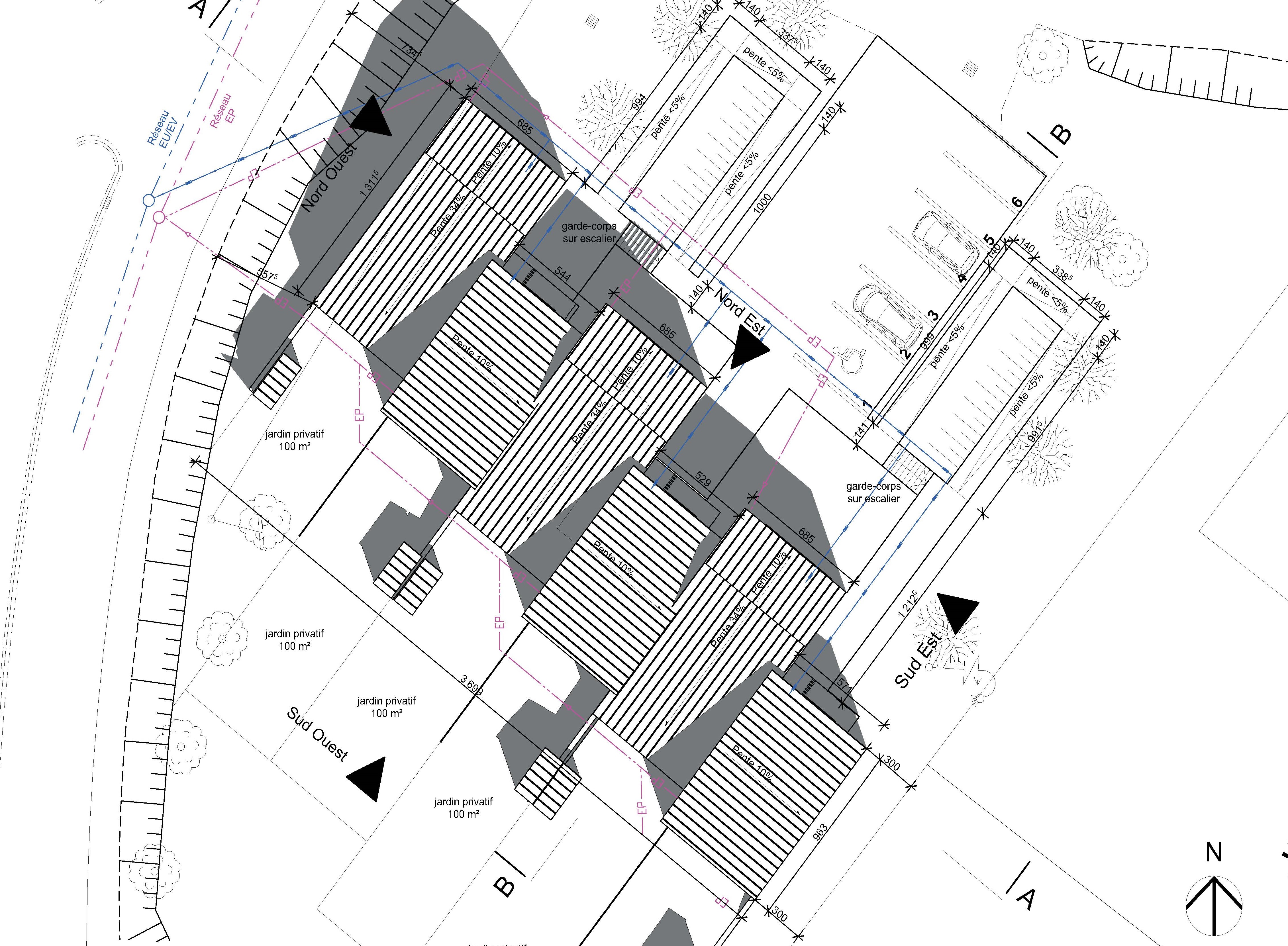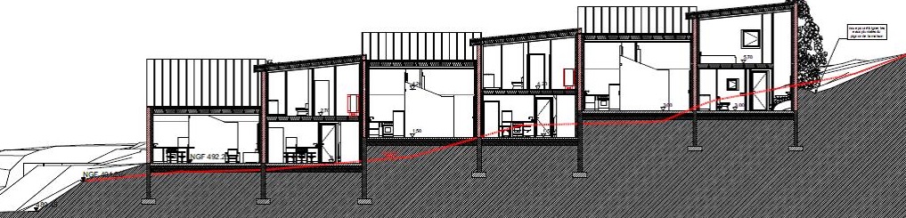 Descriptif technique : Ossature bois en panneaux de 145 mm avec isolation (laine de verre plus économique) , 6 cm de laine de bois rigide à l'extérieur formant pare-pluie, contreventement OSB intérieur, pare-vapeur intérieur jouant le rôle d''étanchéité à l'air, doublage intérieur sur rail en placoplatre. La déclivité du terrain a obligé la réalisation de murs à contre-terrain en béton. Nous aurions souhaité un chauffage collectif mais le Maître d'ouvrage a préféré individualiser les logements au niveau comptage dans l'optique des les vendre individuellement ce qui a alourdi le budget d'investissement.