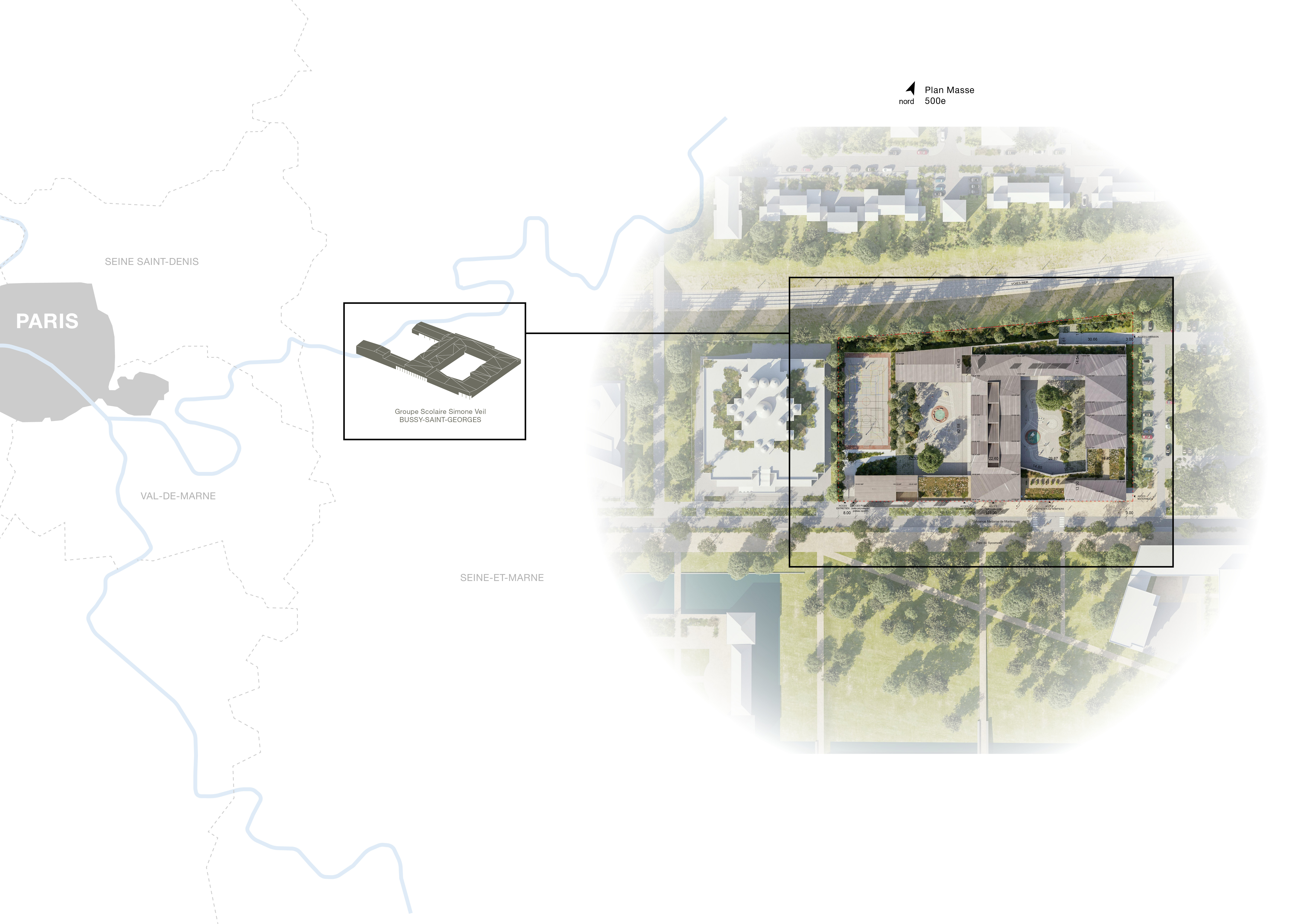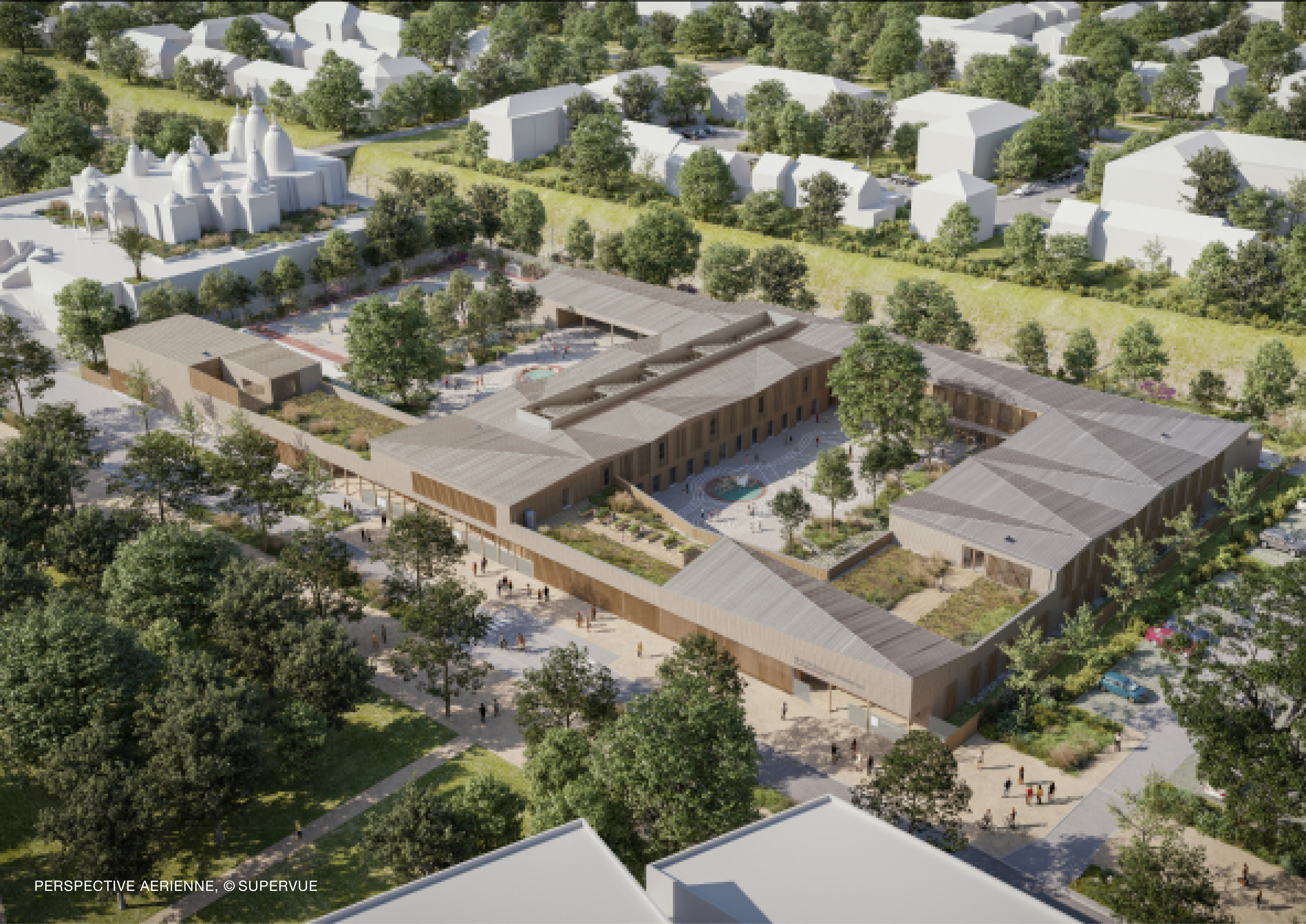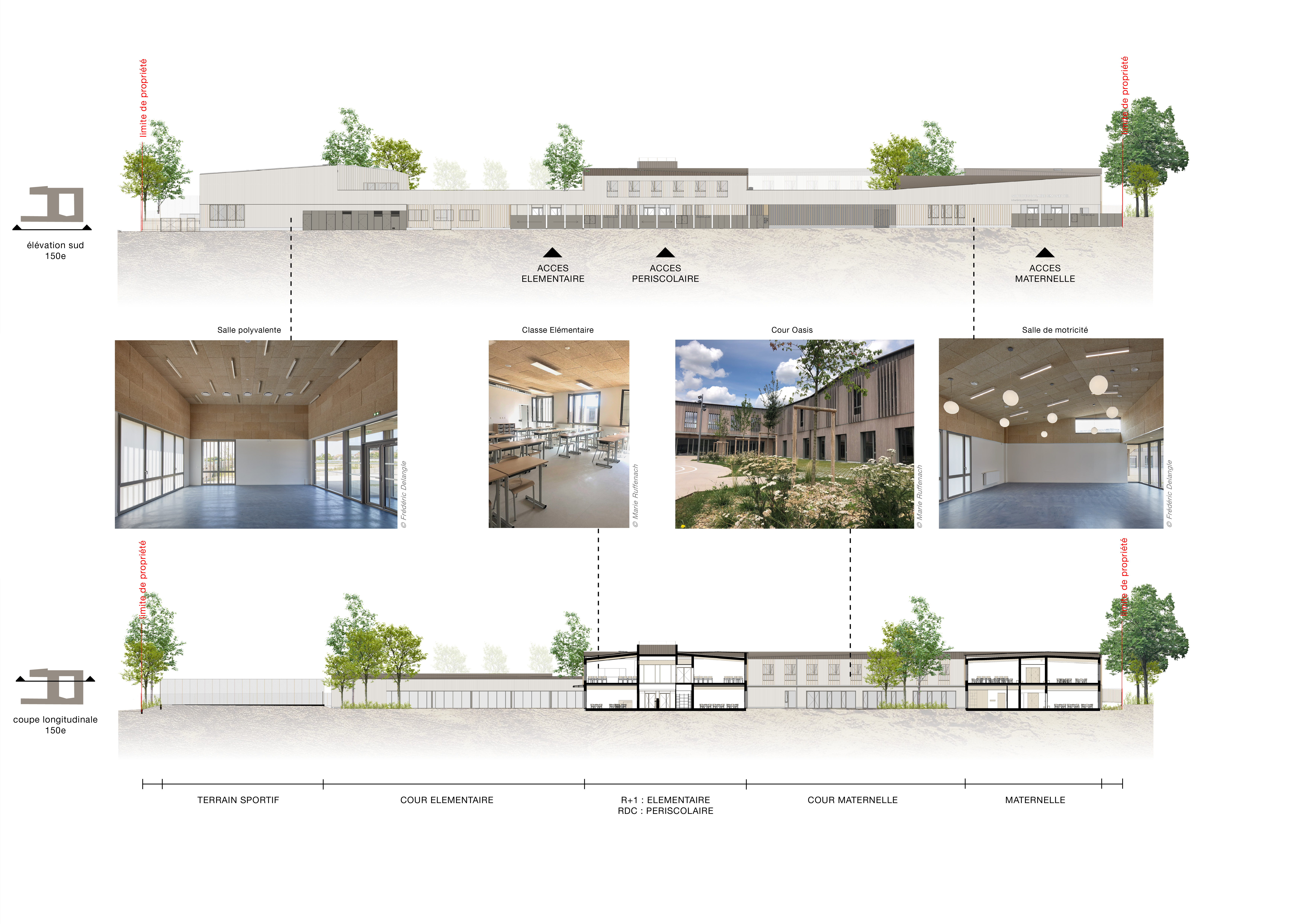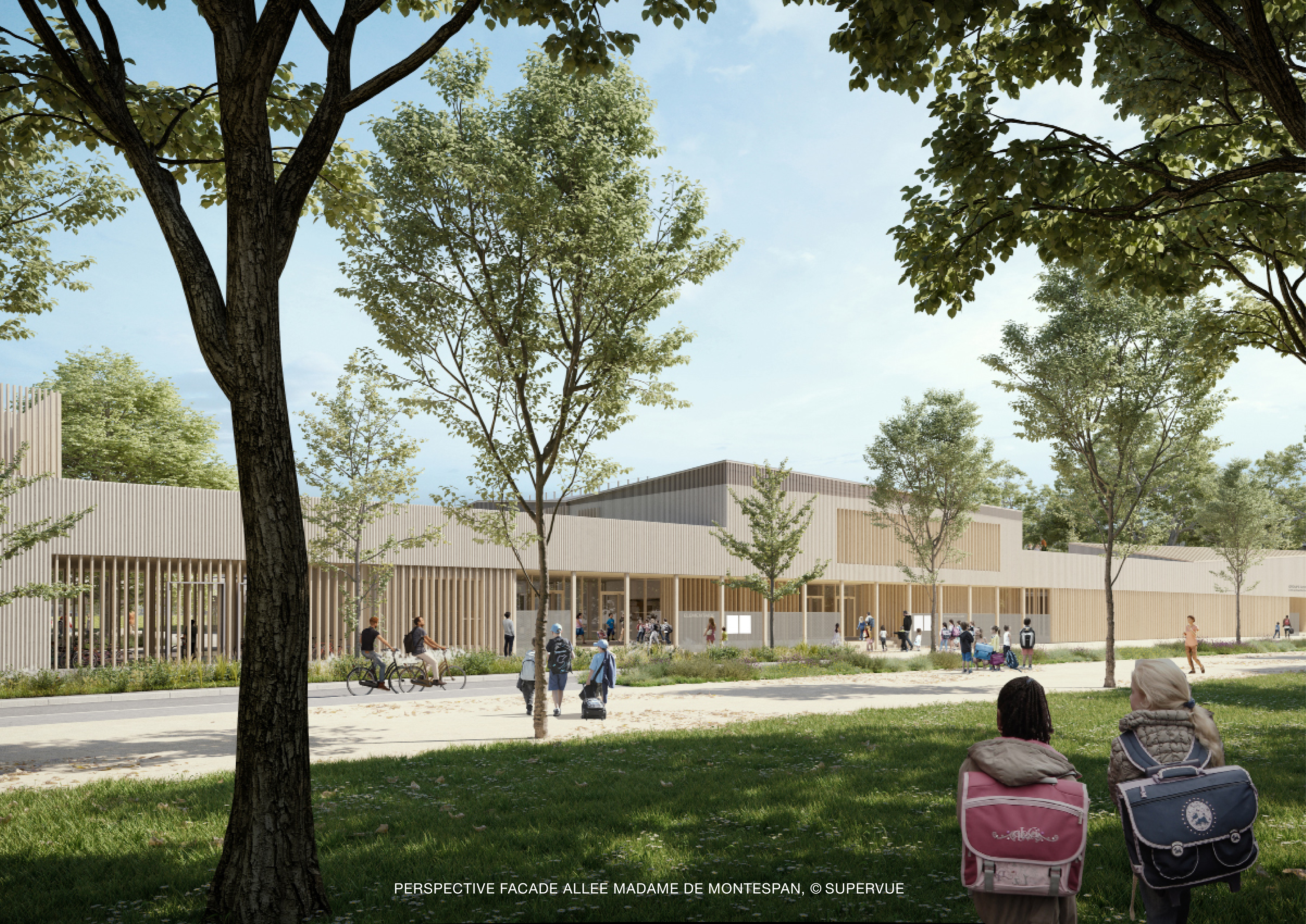 Le nouveau groupe scolaire est une nouvelle institution à destination des plus petits d’entre nous. Son architecture traduit donc un équipement ouvert à tous, protecteur et sécurisé, en prolongement de l’espace public. La principale façade de l’équipement scolaire est la « 5ème façade », une toiture dont les faîtages et les noues dessinent les plis d’un skyline singulier. A l’alignement de la rue de Montespan et face au Parc Sycomore et à la ferme du Genitoy, la vêture de bois se dématérialise et laisse filtrer les vues et les perspectives vers les cours paysagées.