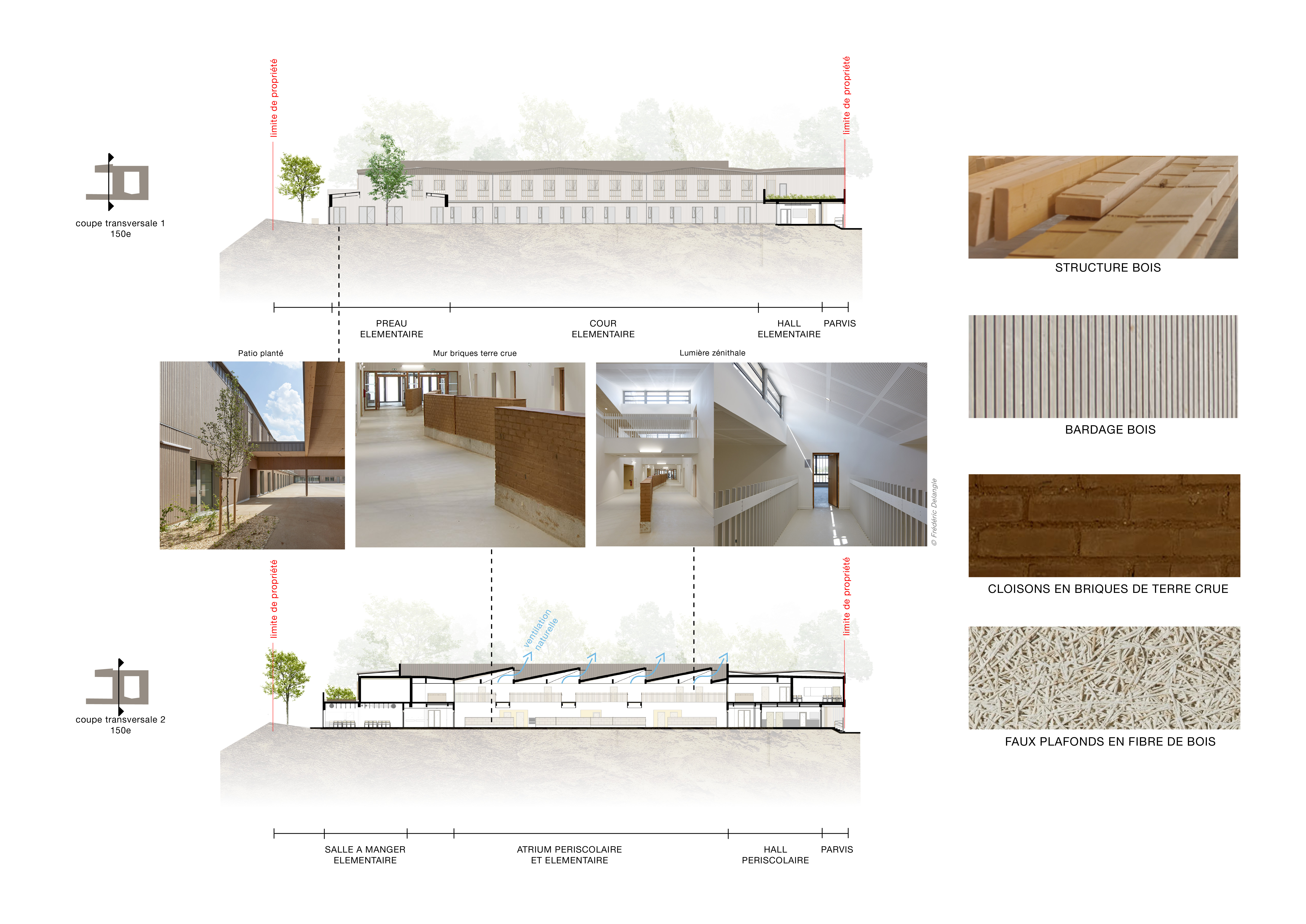 Approche environnementale : Le bois a fortement été valorisé pour ses vertus décarbonées, pour sa rapidité de mise en œuvre, pour ses performances d’assemblage et de préfabrication (MOB, panneaux bois) Pour l’ensemble bâti en structure bois, le couple construction bois et vêture bois s’est donc naturellement imposé comme solution opportune. Tous les bois sont PEFC et FSC. Matériaux bio et géo sourcés utilisés : - Structure et charpente bois - Bardage bois en façade - Plafond acoustiques en fibre des bois dans les classes - Briques de terre crue dans les circulations