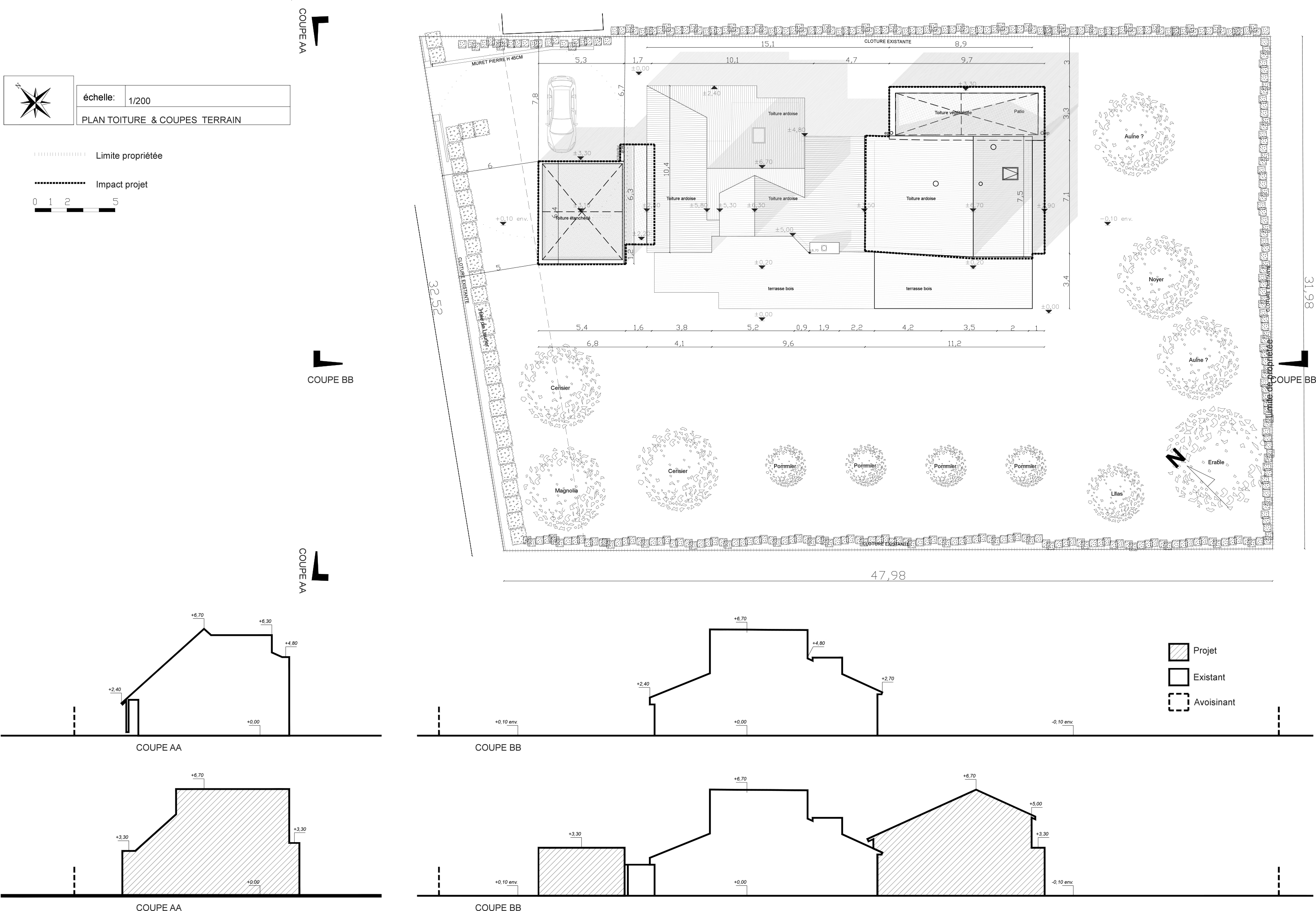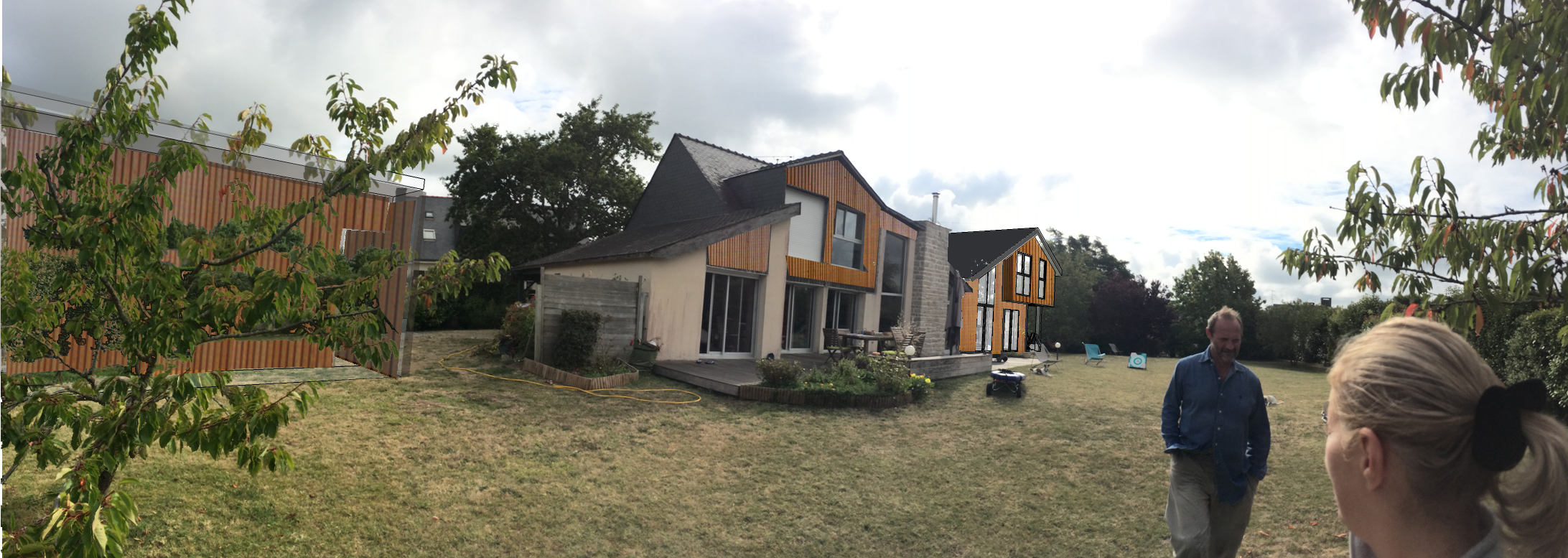 Approche environnementale : L'objectif était de préserver la qualité d'orientation de l'existant pour des raisons de confort et d'efficacité thermique. Le volume de l'extension vient en "dédoublement" de la façade principale Sud permettant de profiter largement du soleil, tout en gardant des percées vers l'est. Pour des raisons sensibles et environnementales les extensions sont en bois, la nouvelle toiture principalement en ardoise et à l'arrière la toiture est végétalisée. La nouvelle maison répond au normes RT2012. Thermiquement, le choix d'une PAC avec plancher chauffant en RDC a été selectionné avec un poêle à bois.