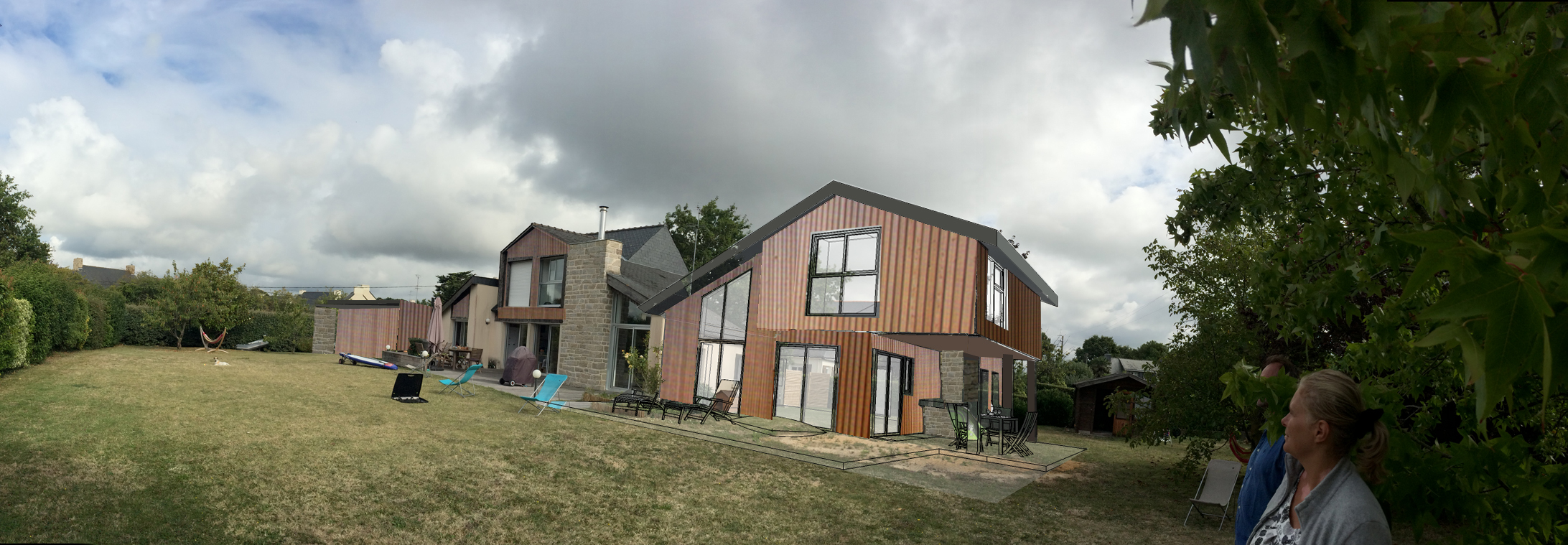 Le projet est une extension d'une maison existante des années 90. Il consiste en un dédoublement de la maison "mère" à l'est, d'une surface au sol semblablement équivalente. Et de l'ajout d'un garage à l'ouest, côté rue. L'ensemble est implanté dans un large jardin arboré. Le programme a nécessité de conserver la maison mère en activité. Les travaux de la nouvelle partie n'ont pas empêcher le fonctionnement de la première. Les deux parties de la maison devaient être en lien direct via les ouvertures existantes.