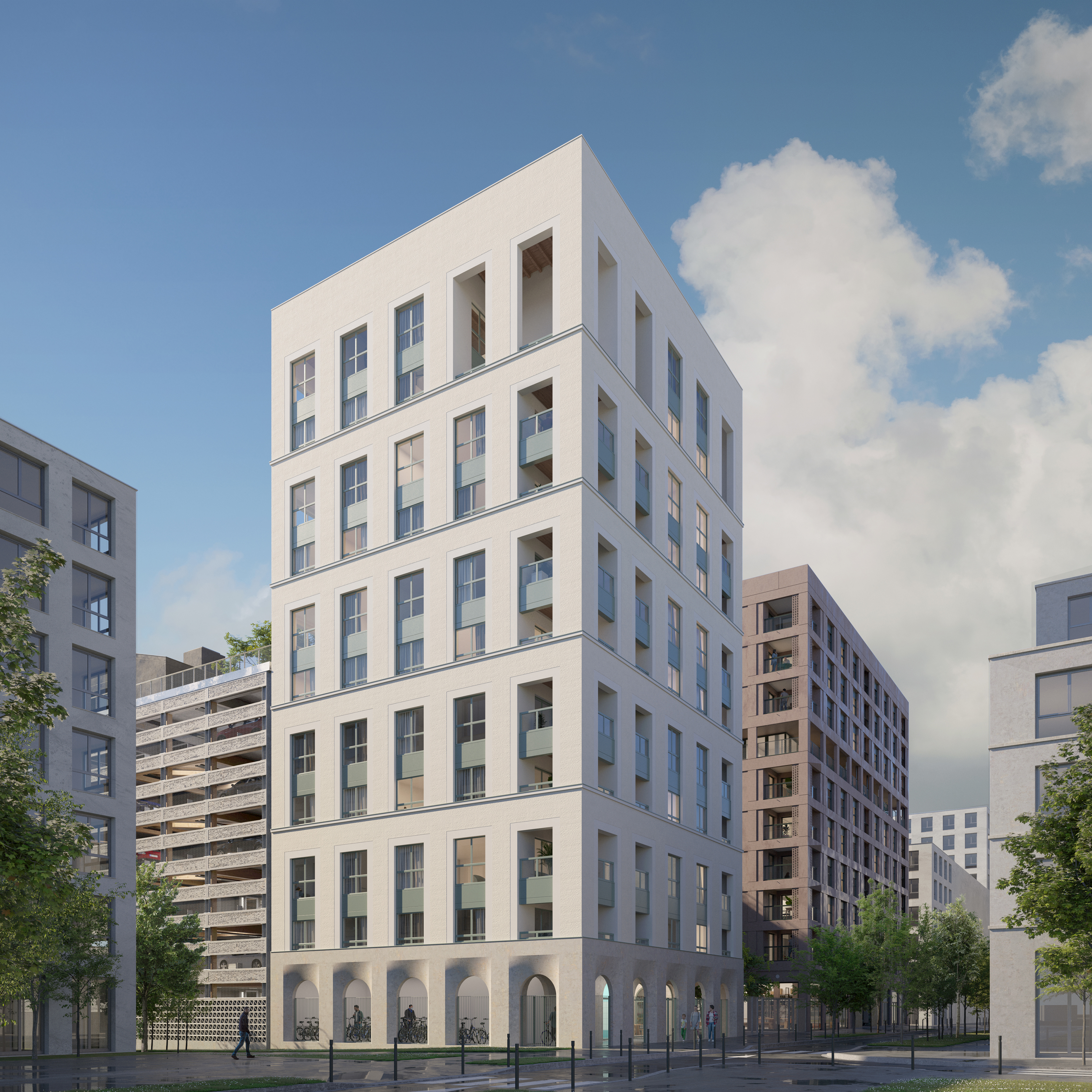 Descriptif technique : Structure R+10 majoritairement bois avec planchers dalles bois CLT reprises sur murs façade bois CLT : 767m3 ; 220kg bois/m²SP. Façade finie enduite sur immeuble 3efam.B nécessitant ATEx pour procédé bardage type ETICS Laine de Roche sur paroi COB/CLT (ht 9 à 40m). ICADE porte avec STO l’ATEx a), reproductible, afin de bénéficier gratuitement à la filière, pouvant être mis en œuvre par autres opérateurs. 2ème ATEx volontairement développé par ICADE sans utilité pour ce projet, mis à disposition de la profession pour réaliser même procédé ETICS sur façades manteau FOB. Intégration précadres métalliques soudés répondant à réglementation IT249. Douches carrelées sans ressauts sur planchers bois : procès étanchéité et mesures conservatoires pour enrailler conséquences du risque fuites.