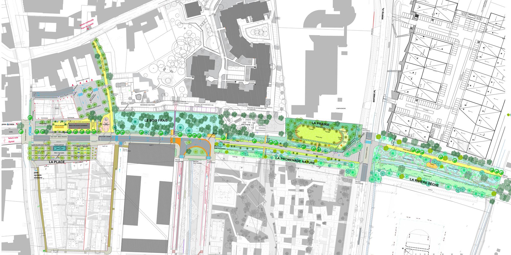 L'aménagement global du projet est vu avec l'aspect protection de l'environnement: ainsi le passage du public au sein du seul boisement, zone refuge de la faune et flore, est guidé par passerelles et belvédère avec garde-corps, en bois et métal pénétrant au cœur de la végétation. De même, une rivière sèche est crée en tant qu'espace de compensation écologique dédié à la préservation du crapaud calamite.