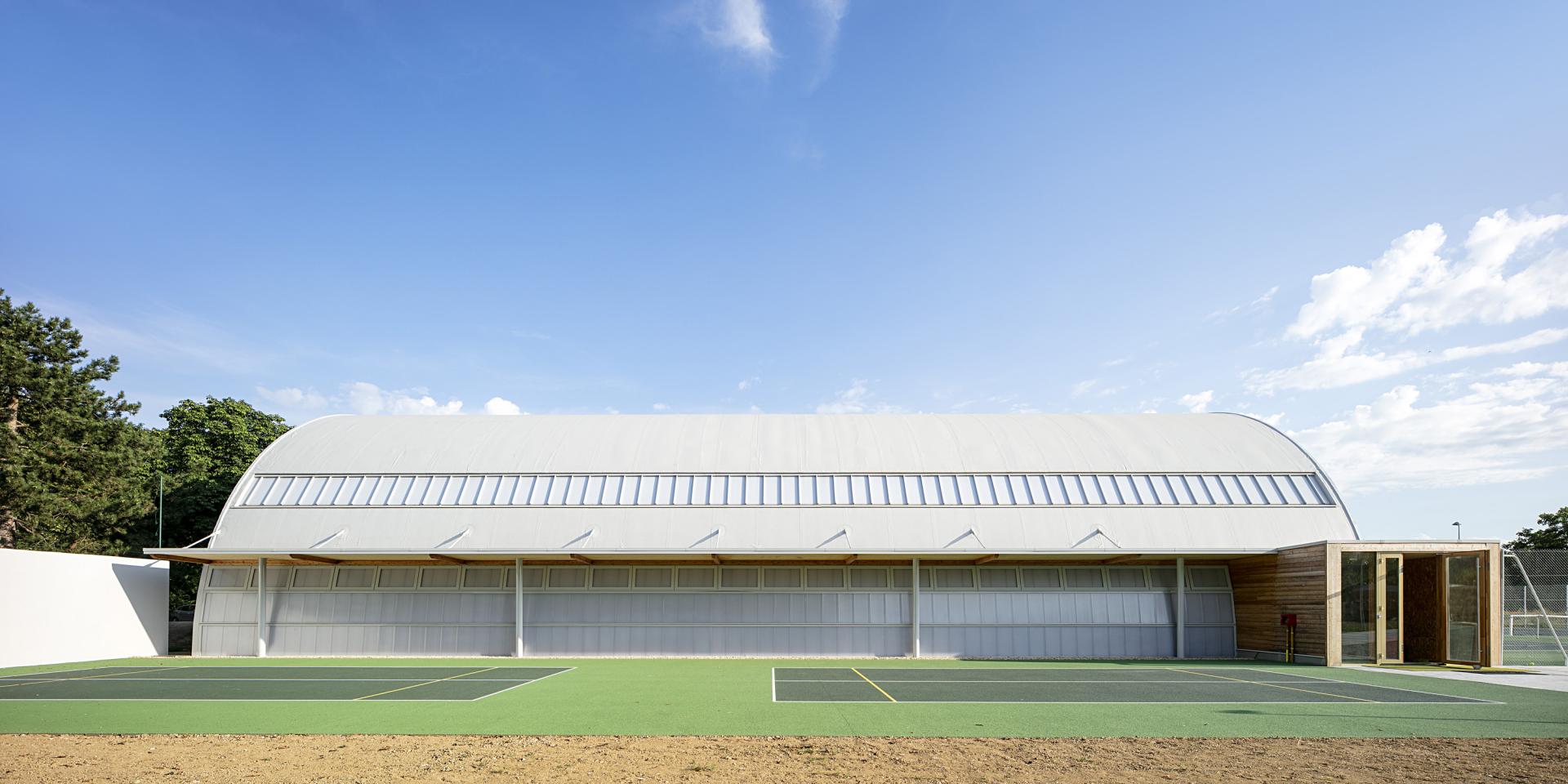 Descriptif technique : Les tennis couverts sont formés par une structure bois de poutres en lamellé collé semi circulaires, sur lesquelles repose la toiture de caissons bois isolés, recouvert d'une membrane d’étanchéité claire. Le volume du club house est à ossature bois, coiffé d’un panneau CLT de grosse section formant une toiture en un pan unique à 3%. Les façades du Club house sont revêtues de lames bois en hêtre de teinte naturelle. Elles sont identiques aux bardages des façades des Tennis, protégés par les avancées de toiture. L’ensemble du bois visible sur le projet est traité avec une même essence. CTB A Traitement des bois en oeuvre CTB Air CTB B CTB LCA CTB Panneaux de process CTB P (Produits de traitement) CTB Structures CTB WPC NF Contreplaqués (CTBX - CTBC) NF Fenêtres Bois et Portes Extérieures - Acotherm