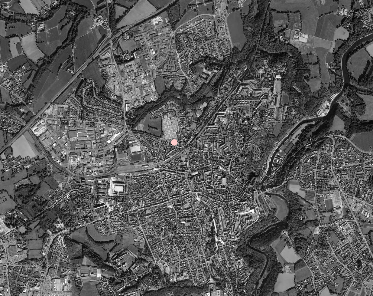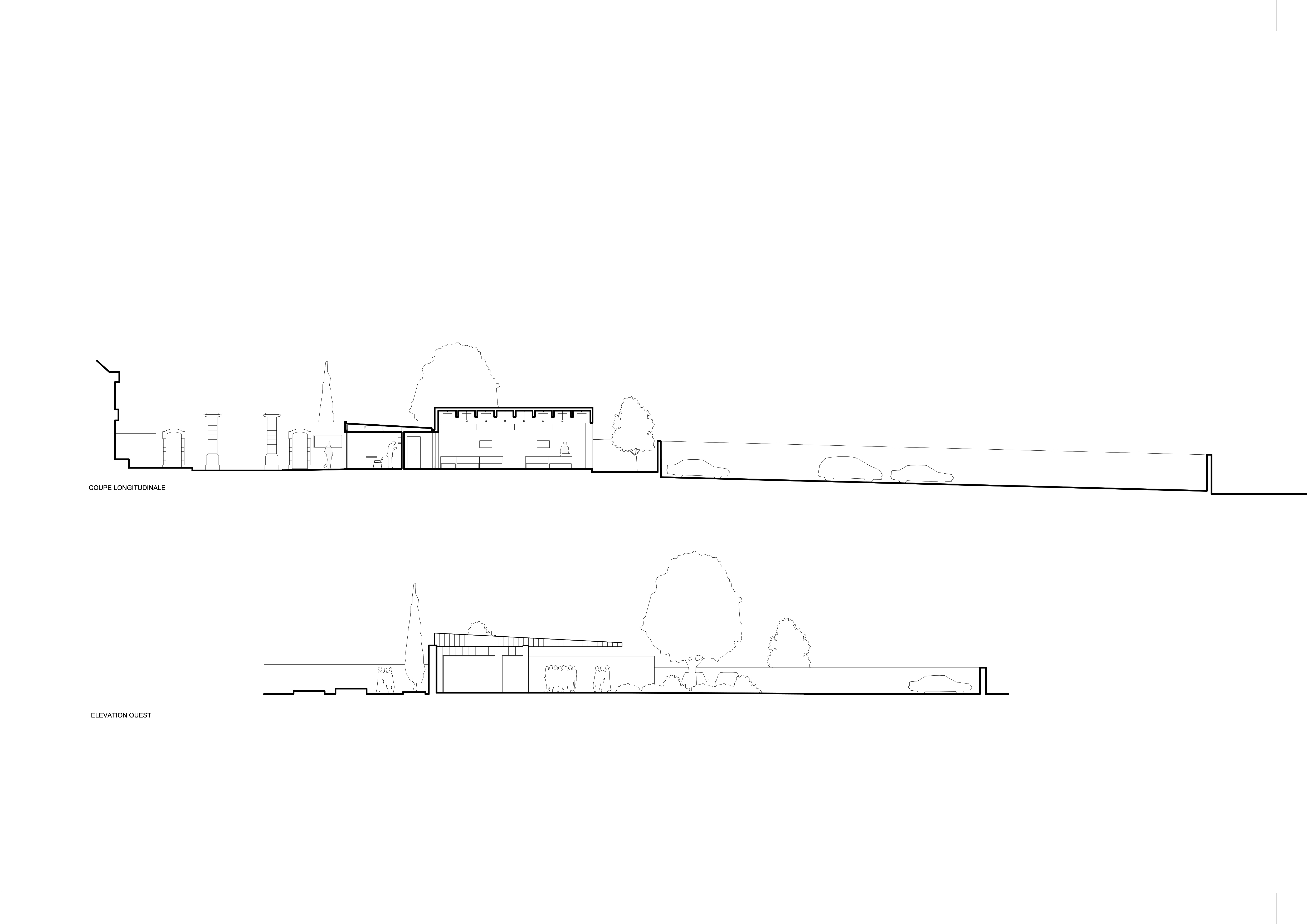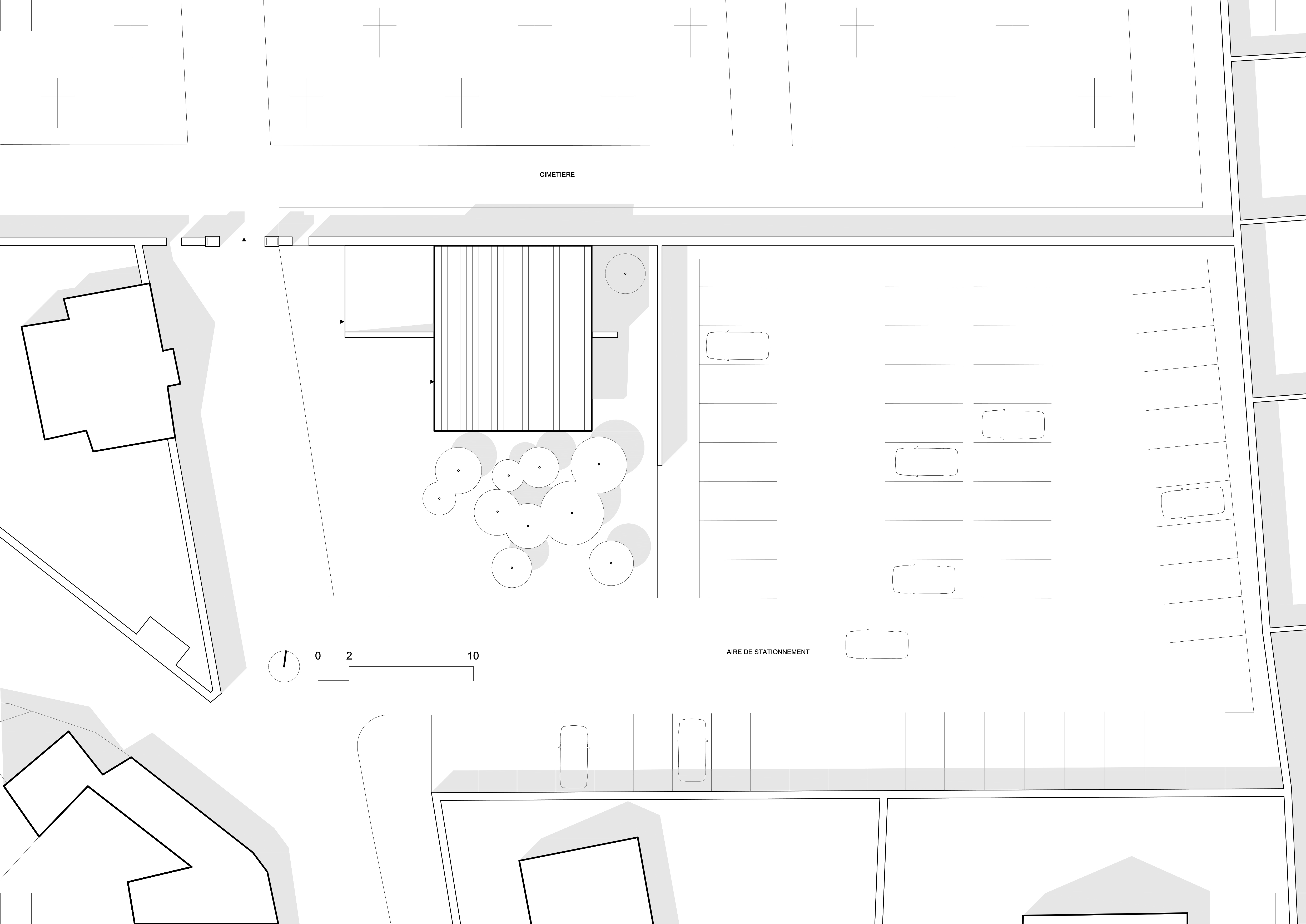 Un ensemble à la fois architectural et paysager, préservant l'intimité des cérémonies laïques, en bordure du cimetière de la Ville de Dinan. Le jardinet a été agrandi, la placette pavée de granit s'abrite sous le long auvent de bois et de zinc. On voit le cimetière, les maisons, le ciel : l'existant est accepté, disponible. C'est un parcours public - depuis le parking et la voirie - vers l'intime de la salle de recueillement, un intérieur / extérieur, dedans et dehors suspendu entre la vie et la mort. Pour une confiance en la transmission et en la vie. Pour éventuellement, une consolation