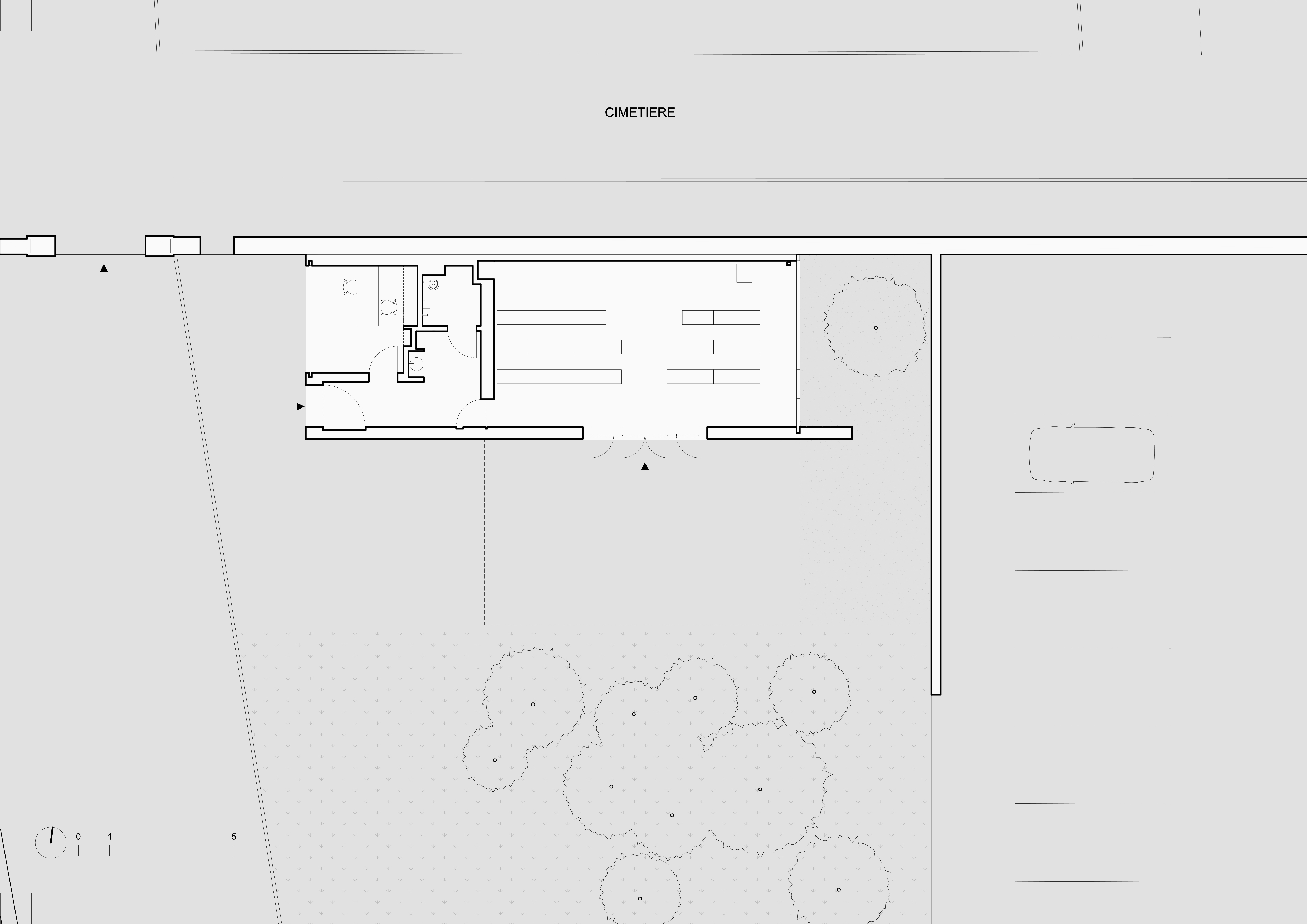 Descriptif technique : Le mur du cimetière est conservé, et devient intérieur. Les menuiseries s'y appuient légèrement. La structure qui les soutient - ainsi que le porte-à faux - est tenue sur un poteau en métal galvanisé 15x15 cm reprenant les charges des deux poutres en lamellé collé de 1 mètre de hauteur. A l'angle, derrière le pupitre, il rappelle la solidité et la ténuité de la vie. Les matériaux sont calmes, bruts, vivants. Chêne des portes, hêtre du mobilier, pierre du pays du mur extérieur, granit des pavés, béton planches, aluminium, zinc, verre.