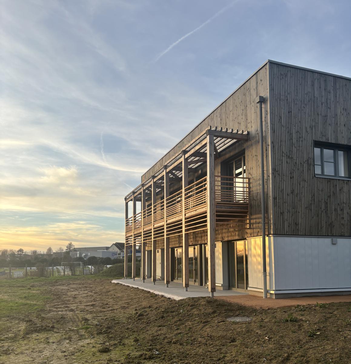 Approche environnementale : L'approche environnementale du bâtiment passe d'abord par la limitation des parties imperméables de la parcelle, cela permet notamment d'infiltrer les eaux pluviales directement sur le terrain. Ensuite le bâtiment, privilégiant la structure bois, limite l'utilisation du béton à la dalle et à la cage d'escalier et d'ascenseurs Dans le même sens une chape sèche est utilisé pour le plancher du R+1. Au delà de la structure, le bois à une place de choix dans la conception : bardage, menuiseries, mobilier, habillage, escalier, parquet et même isolant avec des panneaux de fibres de bois.