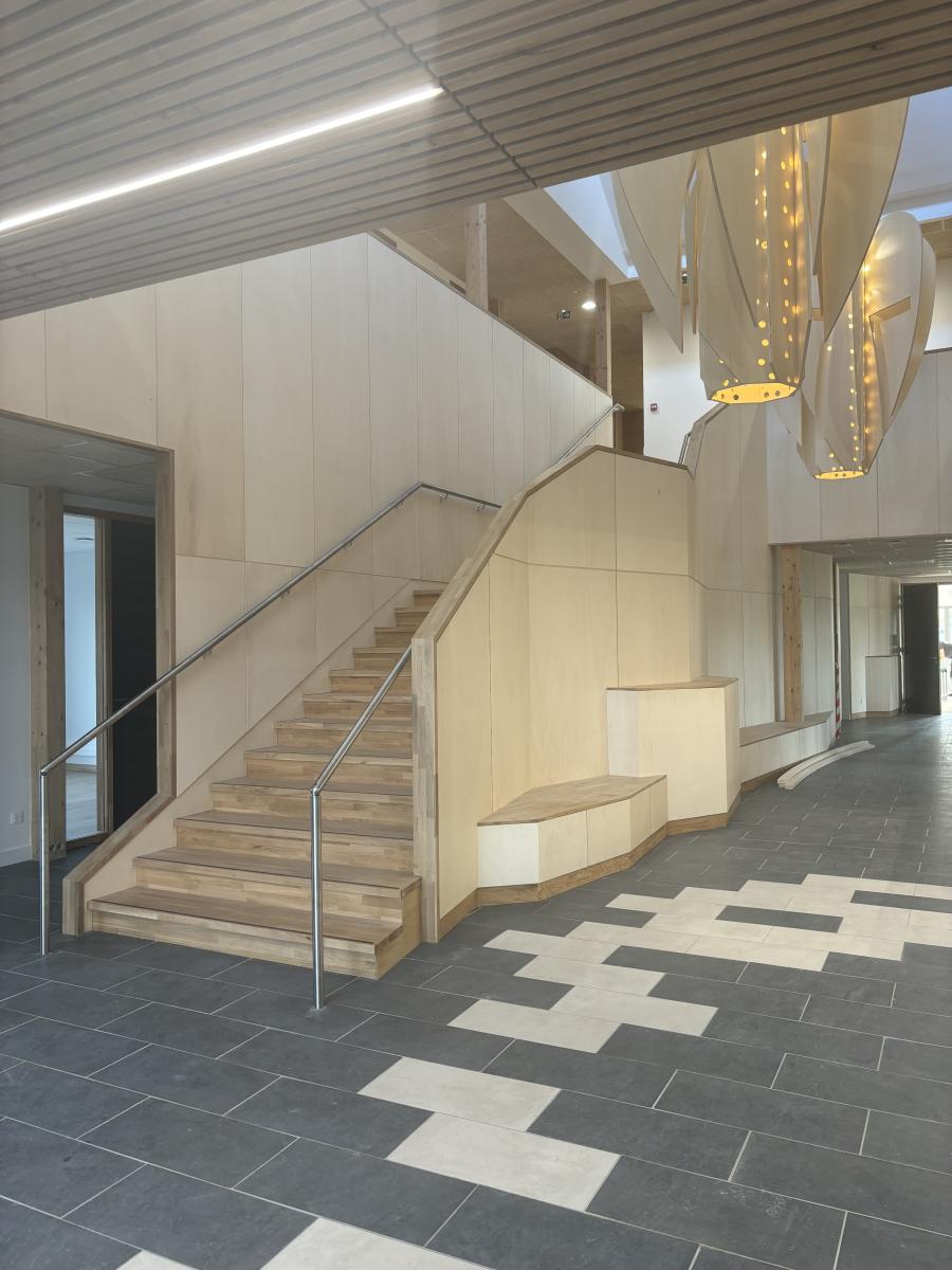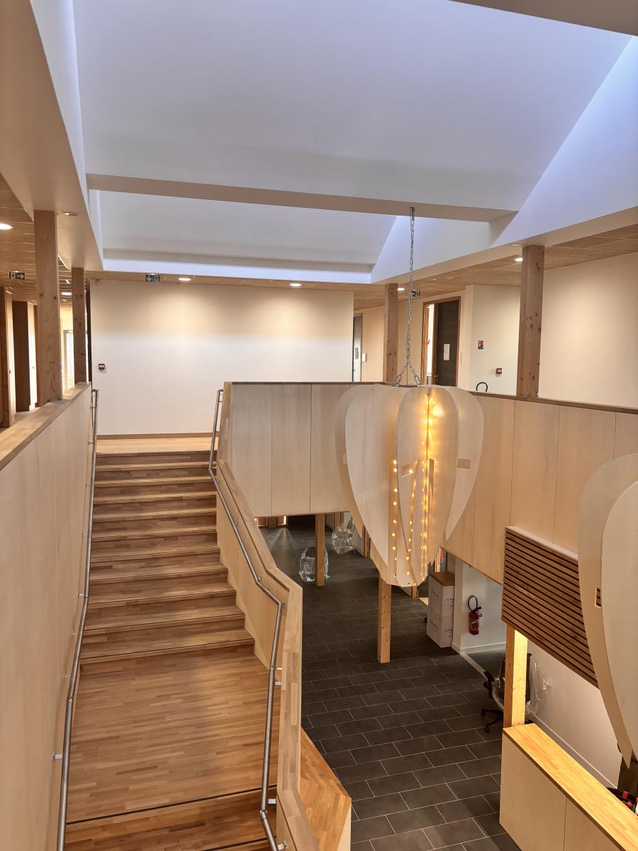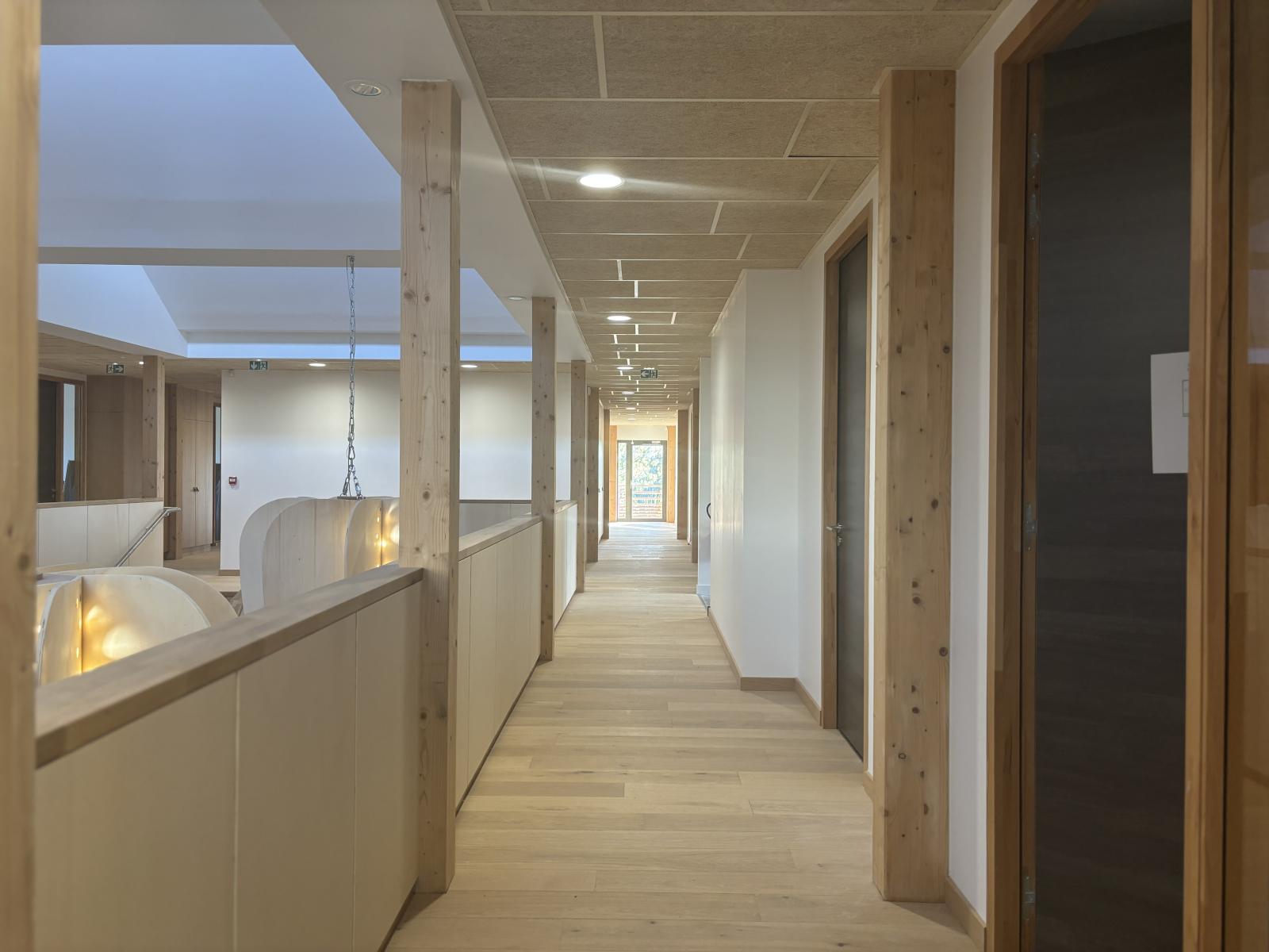 Descriptif technique : Une PAC permet le chauffage du bâtiment, elle est couplée à une ventilation double flux qui limite les pertes caloriques et permet de conserver au maximum la chaleur dans le bâtiment. Ajoutons à cela une isolation performante, des apports naturels de lumière et des appareils peu consommateurs d'énergie, et l'on obtient un bâtiment peu énergivore. La structure du bâtiment est en Epicéa (origine Europe du Nord), le bardage bois est en Douglas (PEFC / Bois de France), les huisseries sont en hêtre (origine Allemagne), Les habillages, escalier et mobilier sont en chêne (Bourgogne), Peuplier (PEFC) et Pin (Massif central). Les façades sont en MOB, isolés en panneaux de fibre de bois, les planchers sont en chape sèche sur poutres et solives bois. Le parquet est en chêne (Europe) semi massif.
