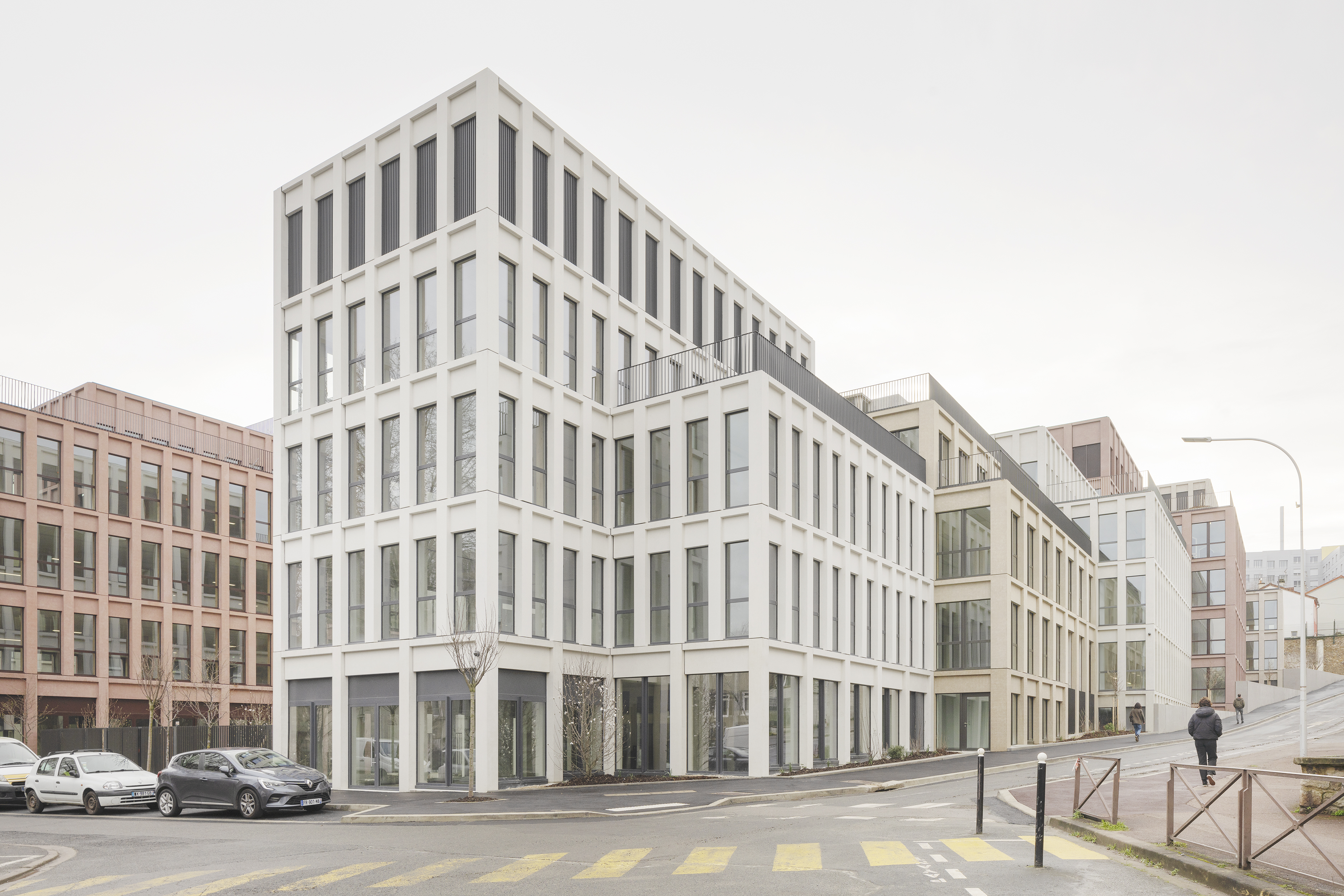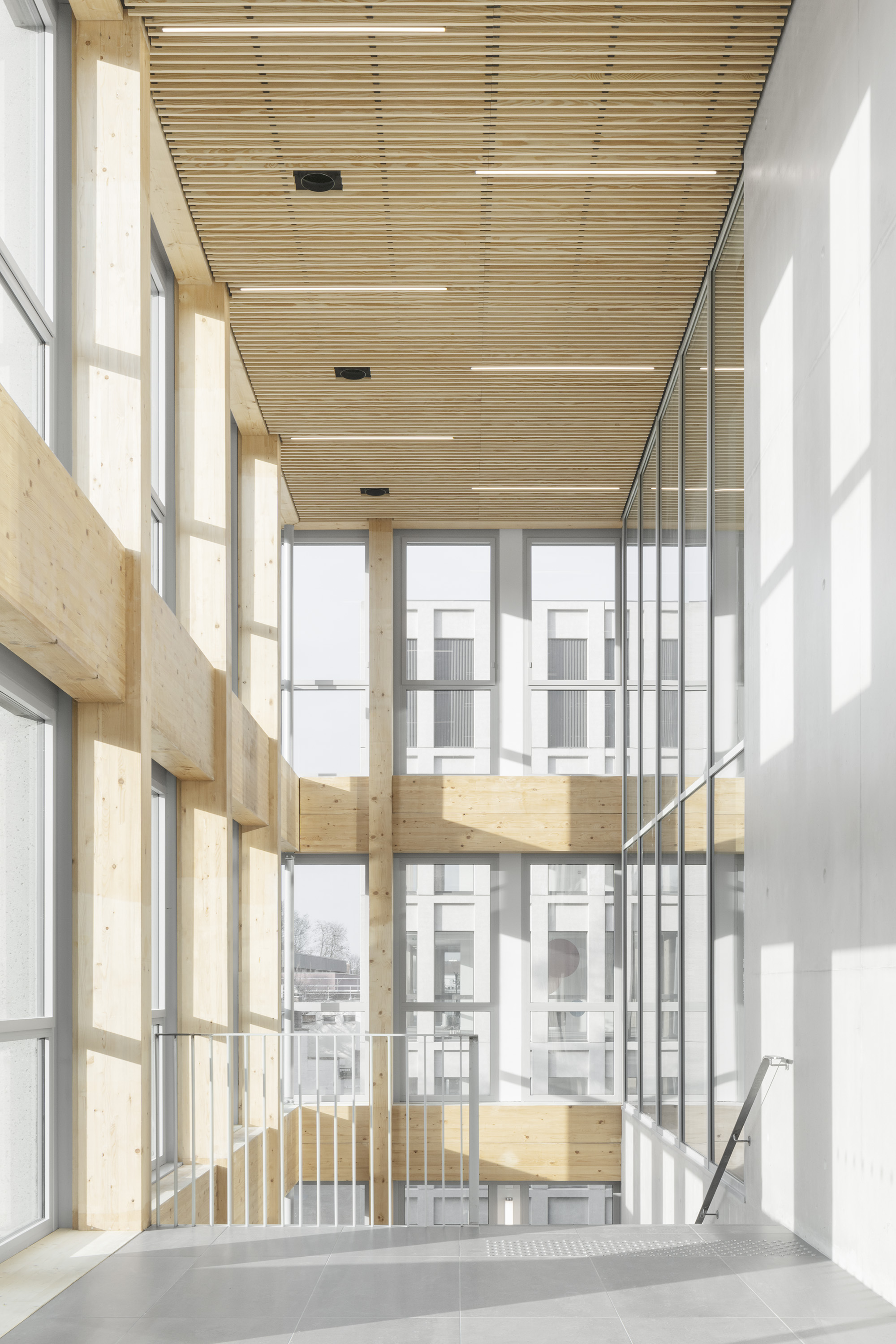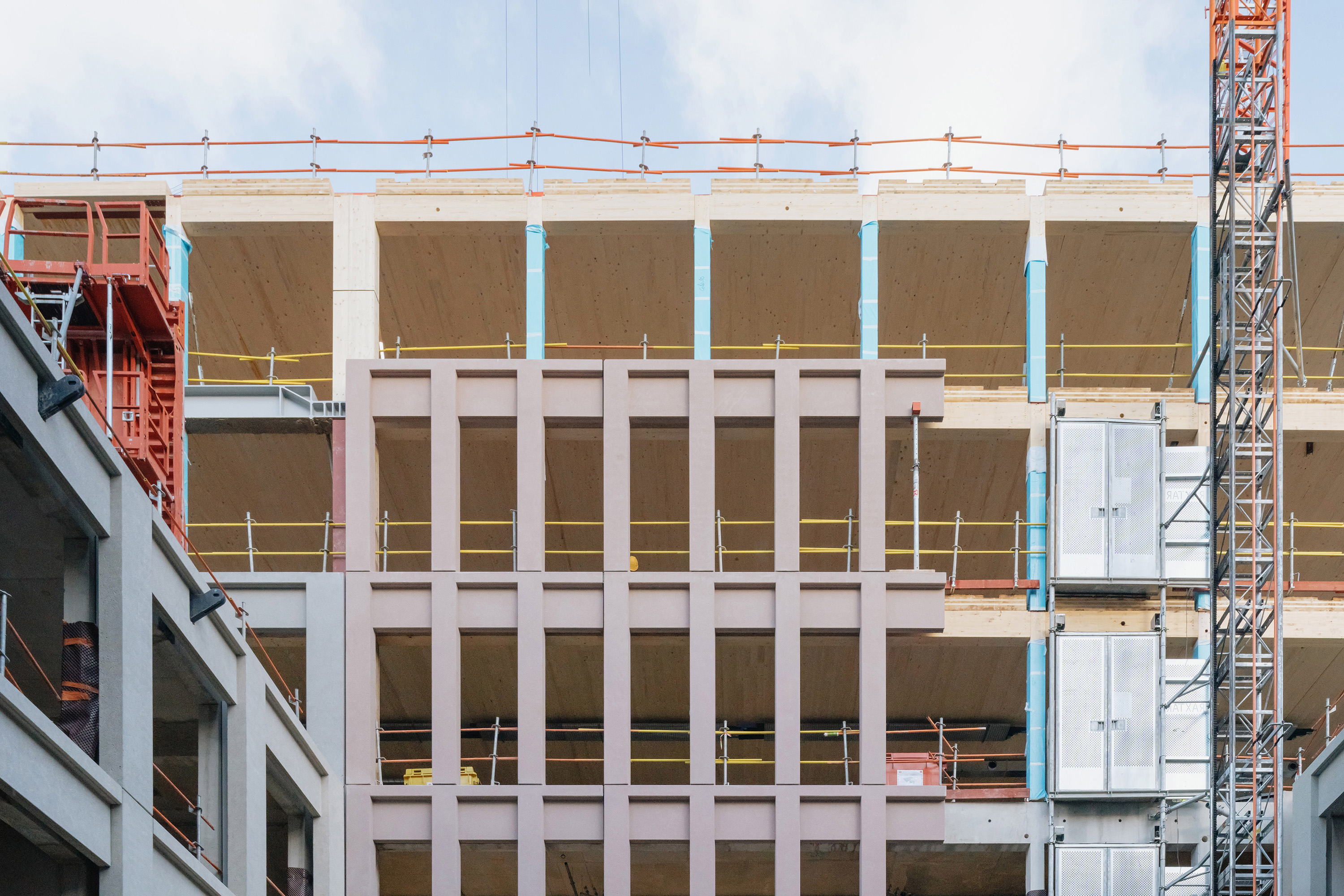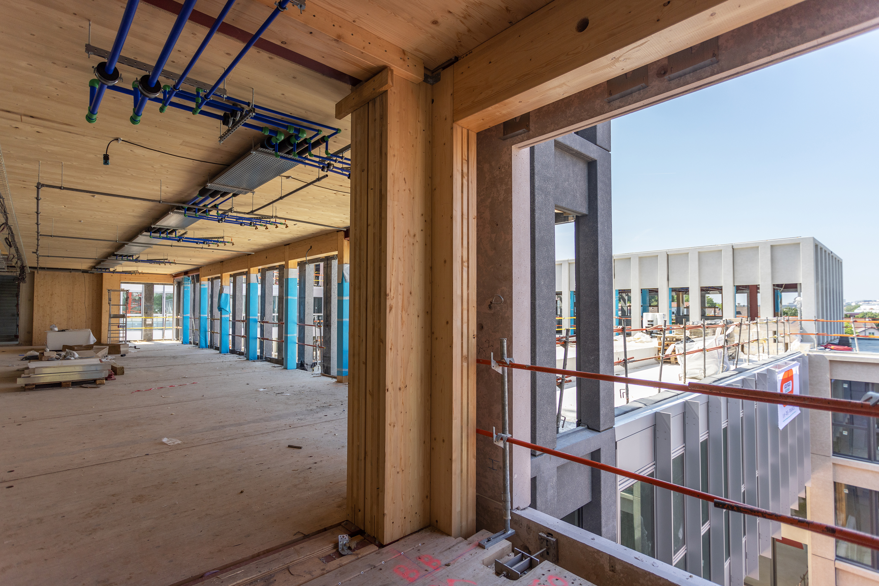 Descriptif technique : La superstructure est composée d’éléments en bois lamellé collé (poteaux et poutres en BLC et dalles CLT) et en métal, qui sont préfabriqués et assemblés sur site. L’enveloppe est en béton préfabriqué teinté dans la masse. Dans une logique d'utilisation du bon matériau au bon endroit, la charpente métallique concerne les terrasses, les seuls éléments en béton coulés en place sont le socle et les noyaux de circulation verticaux. Une fois le socle bâti, le chantier fait ainsi uniquement appel aux filières sèches, occasionnant une grande rapidité d’exécution, et de très faibles nuisances. 16 000 m2 de planchers CLT sont déployés, dont 500 m2 restent apparent dans le projet livré.