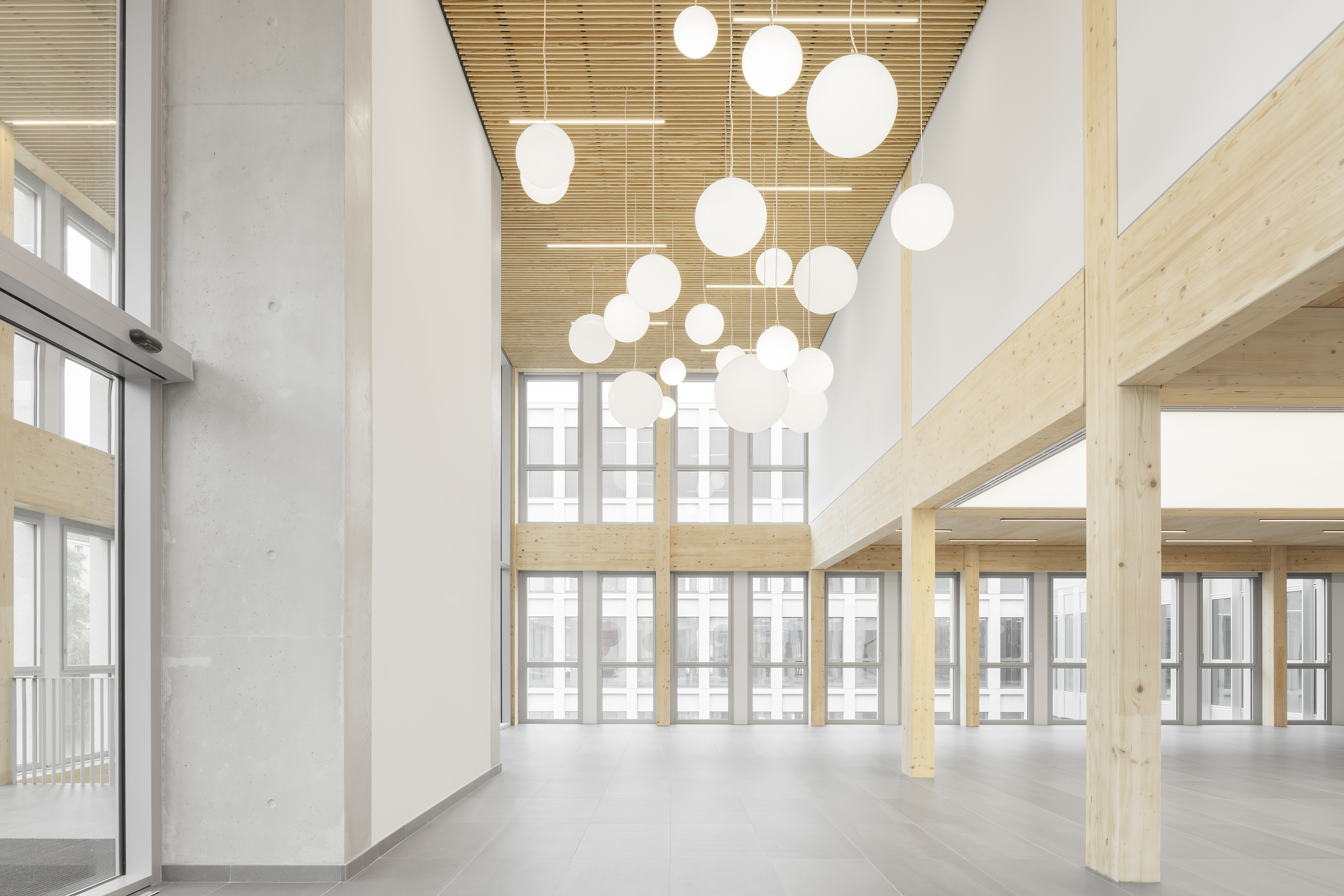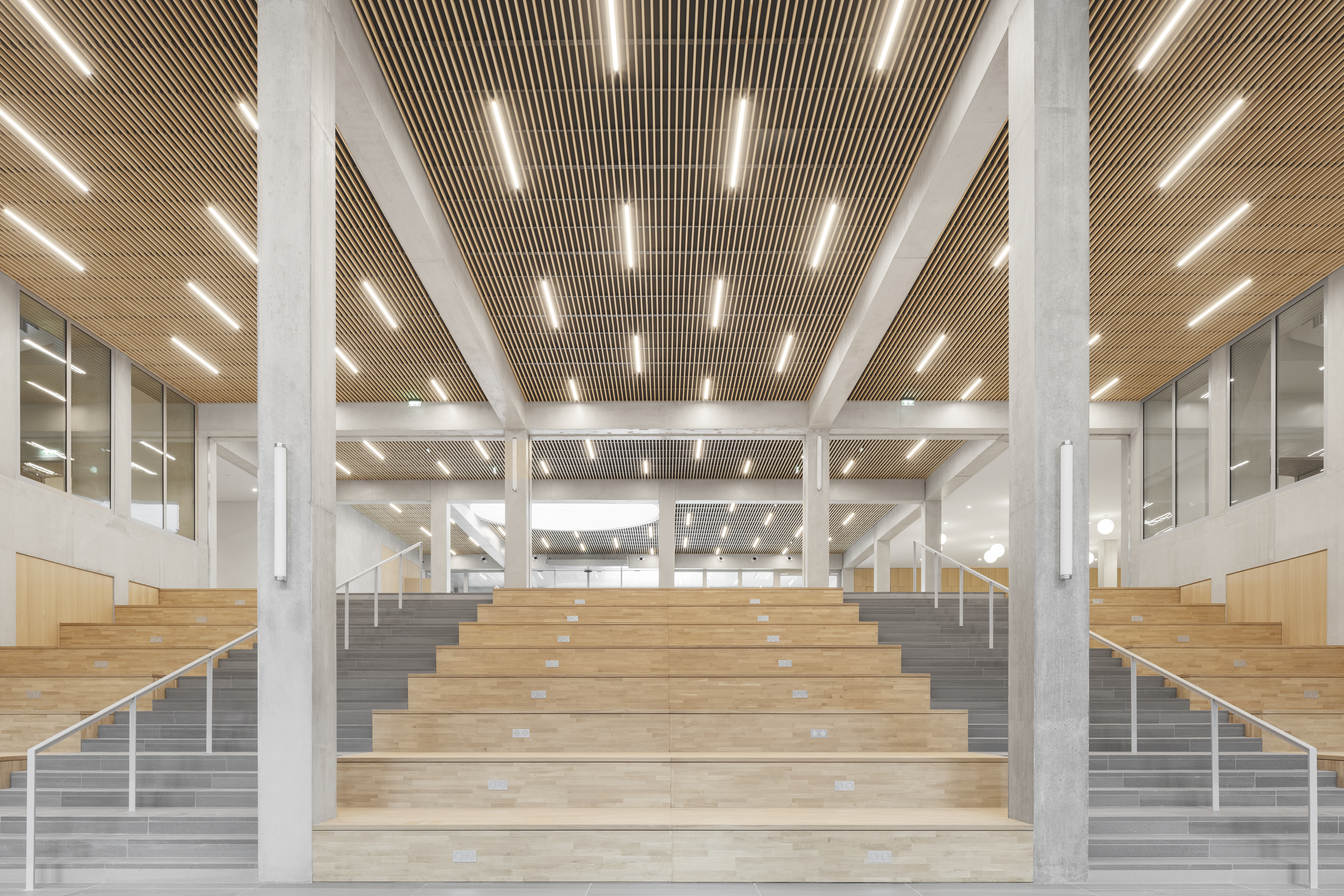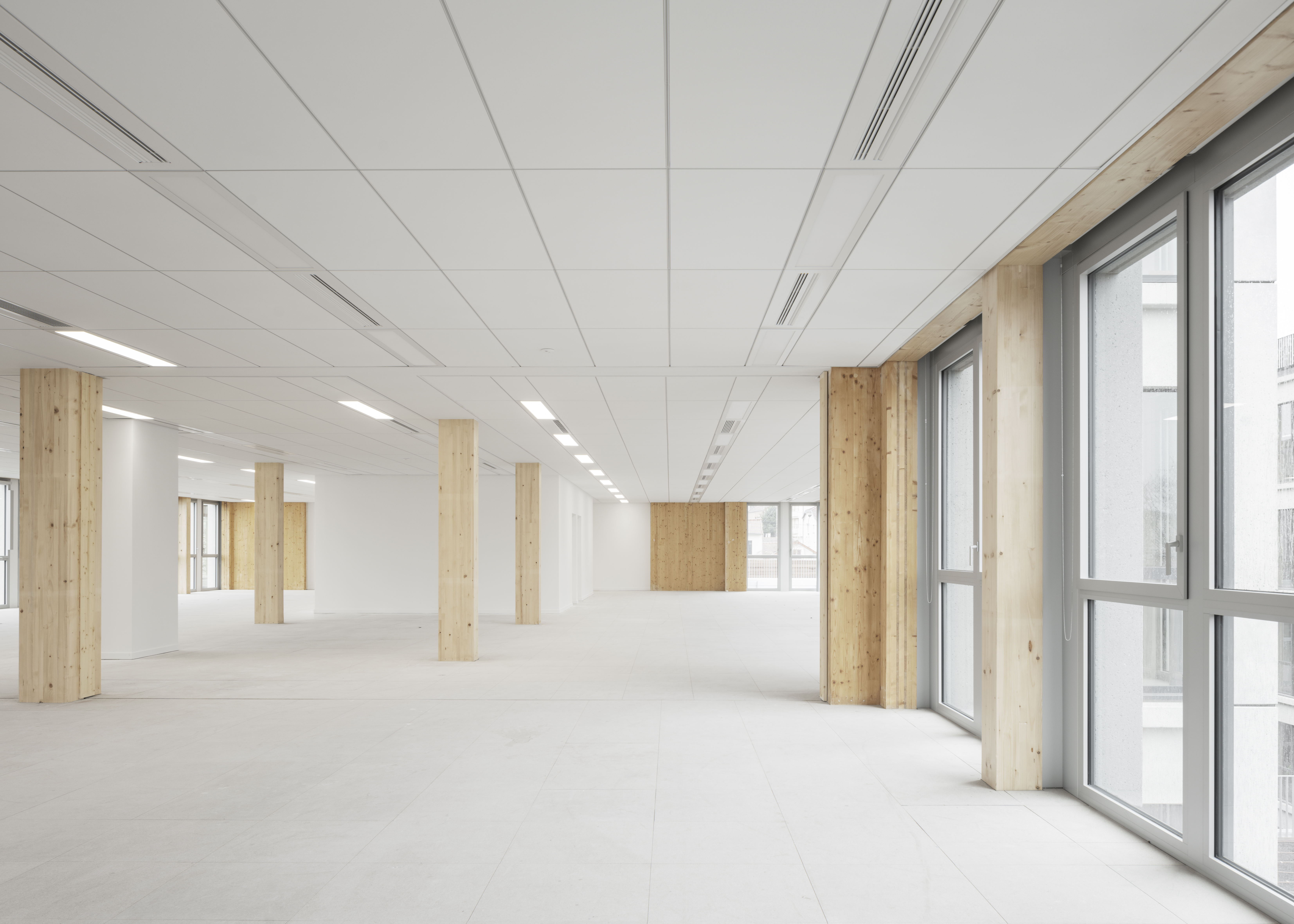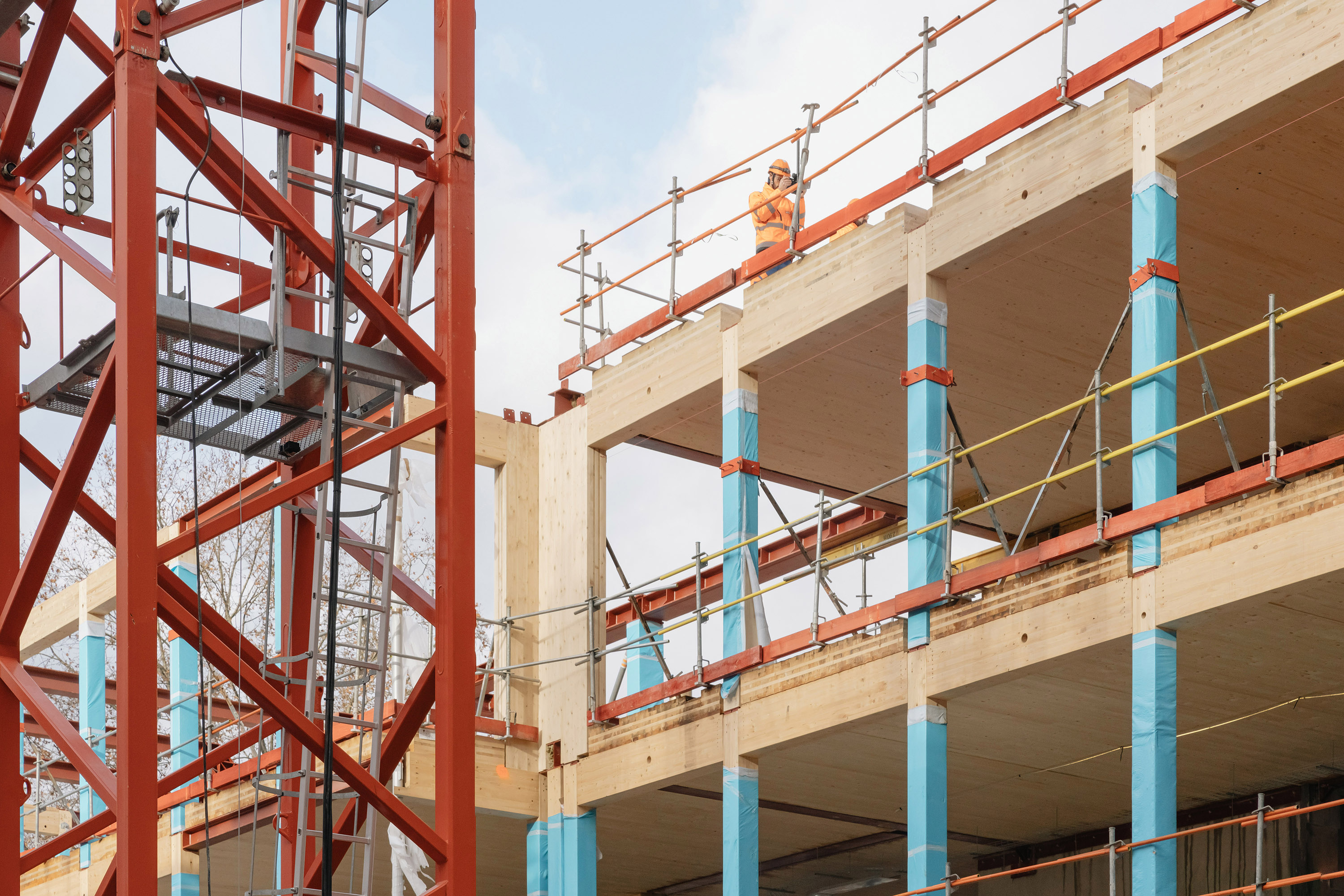 Descriptif technique : La superstructure est composée d’éléments en bois lamellé collé (poteaux et poutres en BLC et dalles CLT) et en métal, qui sont préfabriqués et assemblés sur site. L’enveloppe est en béton préfabriqué teinté dans la masse. Dans une logique d'utilisation du bon matériau au bon endroit, la charpente métallique concerne les terrasses, les seuls éléments en béton coulés en place sont le socle et les noyaux de circulation verticaux. Une fois le socle bâti, le chantier fait ainsi uniquement appel aux filières sèches, occasionnant une grande rapidité d’exécution, et de très faibles nuisances. 16 000 m2 de planchers CLT sont déployés, dont 500 m2 restent apparent dans le projet livré.
