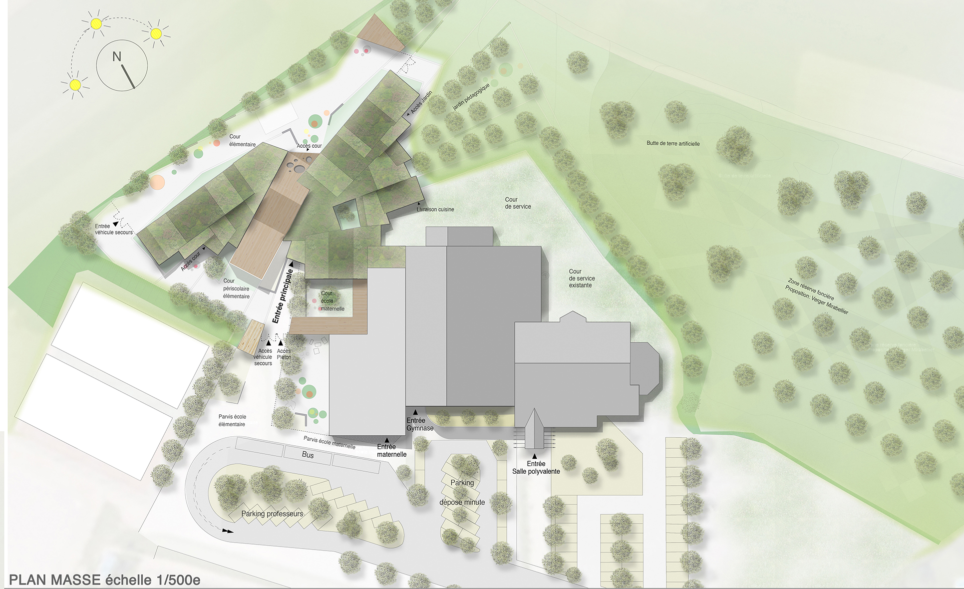 Approche environnementale : L'architecture a été conçue pour répondre de façon pertinente à une démarche environnementale : travail sur l’échelle humaine et la relation entre un édifice public et son environnement, préfabrication des structures bois utilisée au maximum, éclairage naturel de tous les locaux, confort visuel garanti par les vues et orientations adaptées aux usages et protection solaire, fonctionnalité du hall traversant desservant la cour et toutes les fonctions internes, contrôle des accès par un bon positionnement des bureaux, accès facilités depuis le hall et les salles de cours, confort acoustique généré par la volumétrie et des plafonds perforés inclinés, utilisation de matériaux sains et écologiques, végétalisation des toitures, pas de traitement des bois en bardage laissés naturels, isolation renforcée de l'enveloppe, réduction des entretiens et consommations