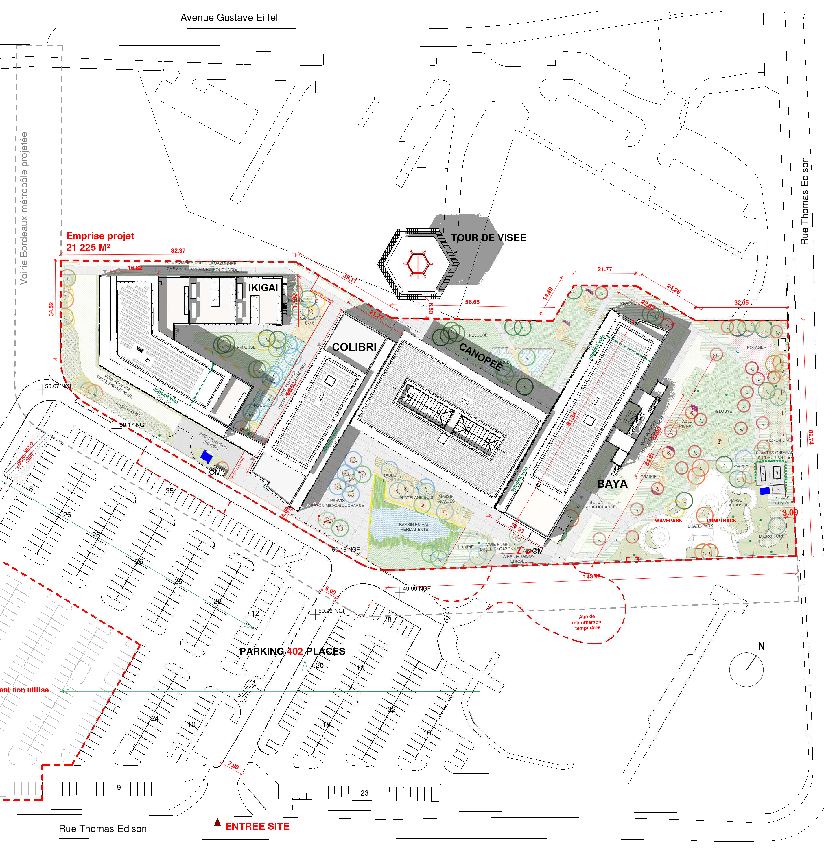 Descriptif technique : - Démarche Full BIM Conception - Réalisation - Exploitation - Canopée: Structure en Epicéa et Douglas - Ossature bois: Pin Maritime - Façades de 2 types: lames en pin Maritime pour Baia et Colibri - lames en Mélèze pour Canopée - Sous-faces en lames de Pin Maritime - Panneaux d'habillages muraux intérieurs en Rolpin - Terrasses en lames composites Sylvadec, composée à 67% de sciure de bois issues d'une scierie située en Bretagne. - Production Chaud Froid: PAC "thermofrigopompes" géothermiques alimentant tout le site. - CTA Double Flux - Diffusion Chaud-Froid: Dalles Actives dans Canopée / Poutres Climatiques en plafond pour les espaces de travail - Façades non protégées par des coursives équipées de protections solaires motorisées - Toitures équipées de panneaux photovoltaïques