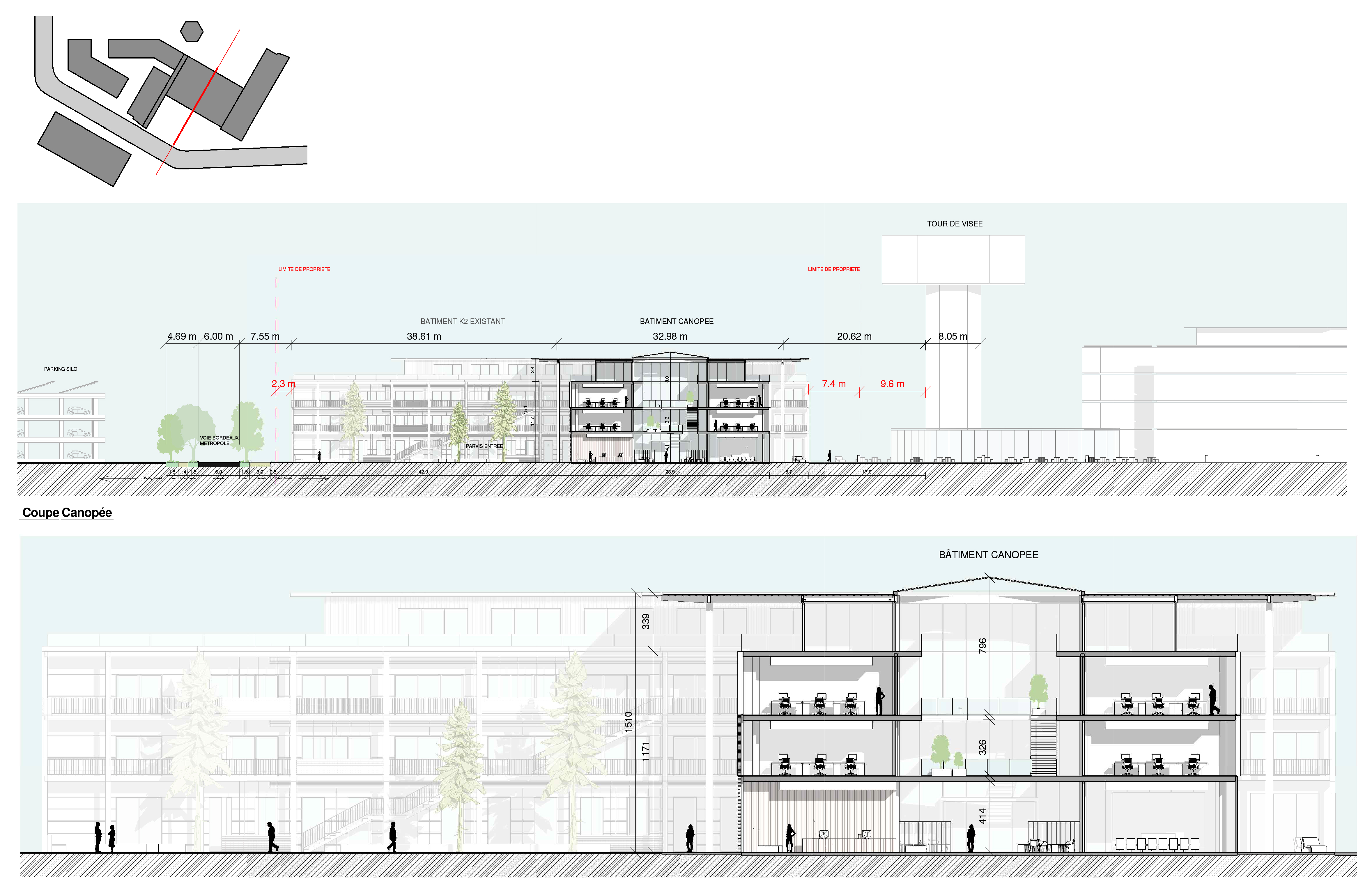 Implanté sur l’ancien site Thales à Pessac, le parc d’activités AMPERIS constitue un nouveau pôle d’attractivité porté par La SEML de la Route des Lasers, dont la Région Nouvelle Aquitaine est actionnaire majoritaire. Ce site est porteur d’enjeux majeurs en terme de développement économique régionaux, pour les futures entreprises qui s'y implanteront, mais aussi pour la filière bois aquitaine. Le projet présenté se compose de 3 bâtiments, dont 2 existants en béton (Baia et Colibri) réhabilités et surélevés en ossature bois, reliés par un principal neuf à structure et vêture bois (Canopée).