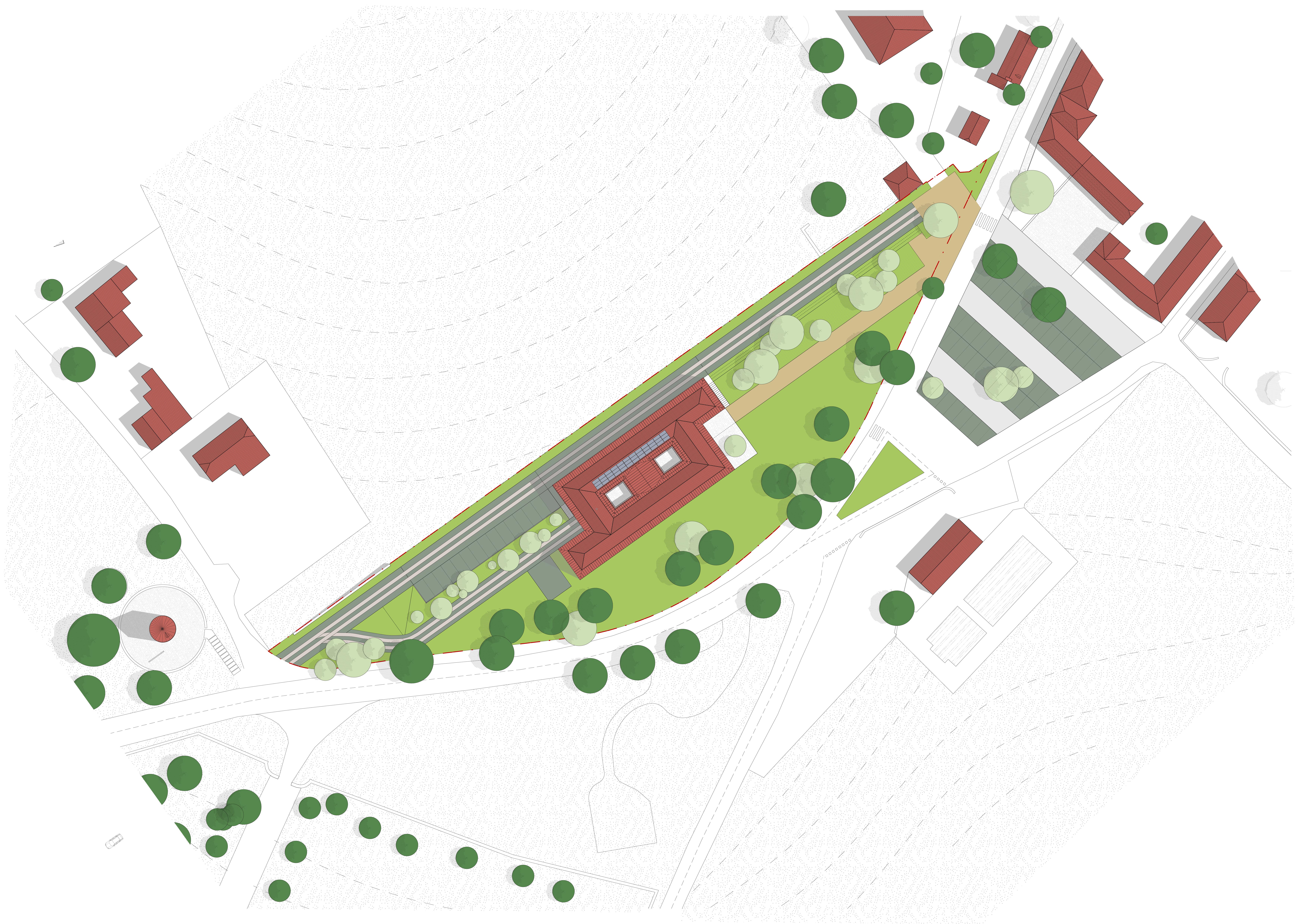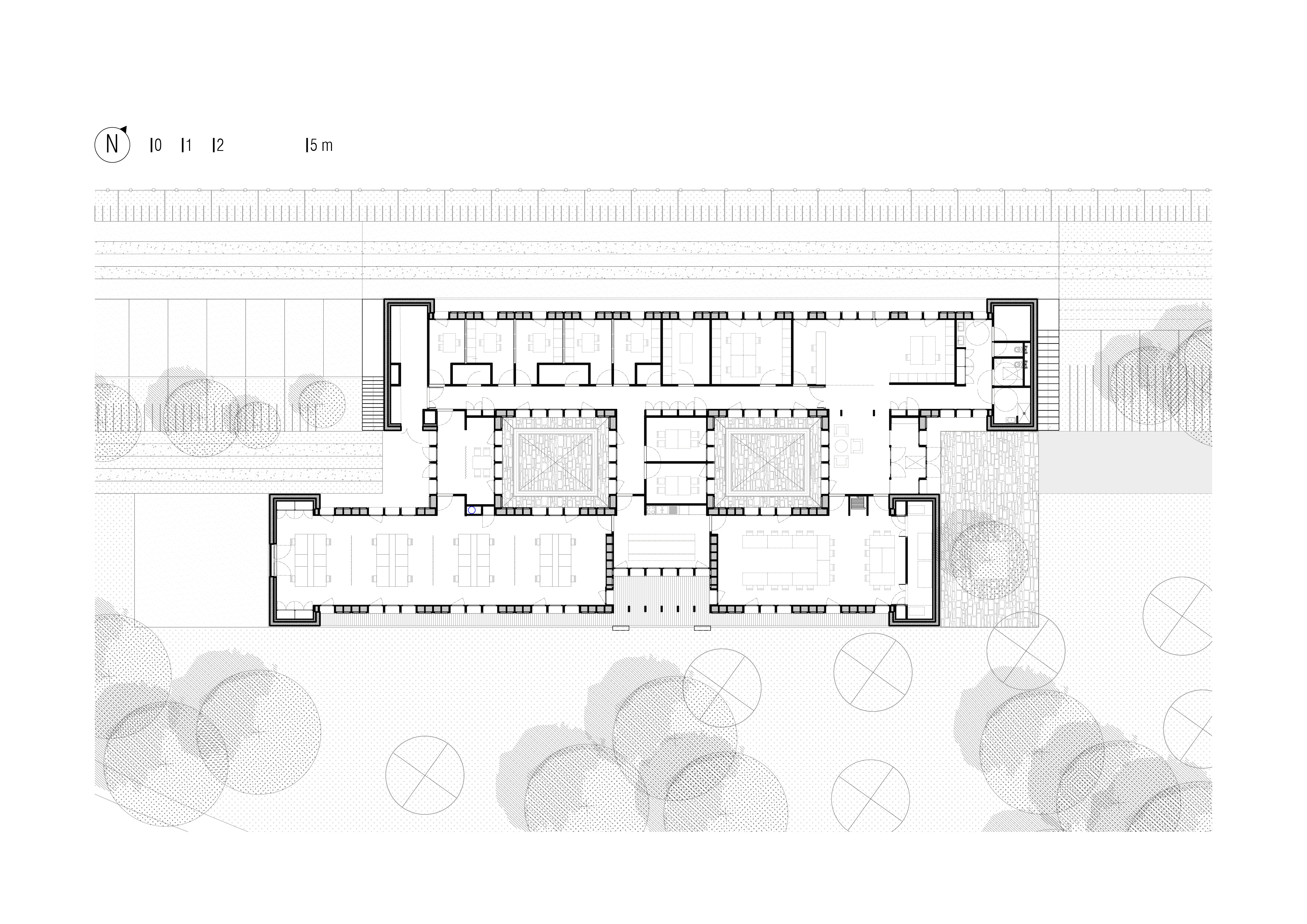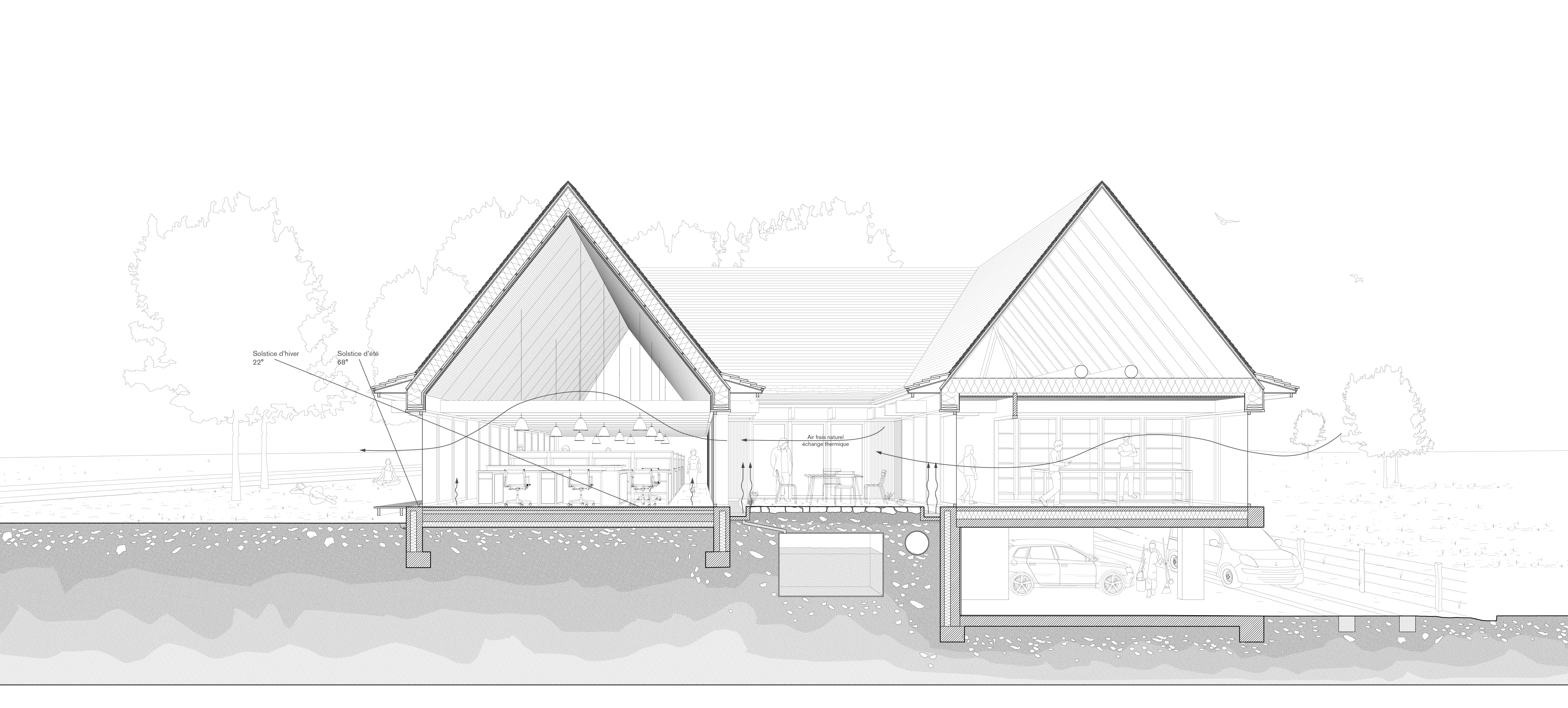 Approche environnementale : L’orientation sud est privilégiée pour maximiser les apports solaires passifs. Le plan comprend deux ailes, l’une au nord, l’autre au sud, entre lesquelles s’inscrivent les entrées, deux patios et des bureaux de souplesse. Les matériaux retenus sont majoritairement biosourcés, faiblement transformés et disponibles localement. Non seulement ces choix réduisent l’empreinte carbone du projet, mais ils permettent également à la commande publique de soutenir les filières locales. PERFORMANCE THERMIQUE : pré RE 2020 - E3C1