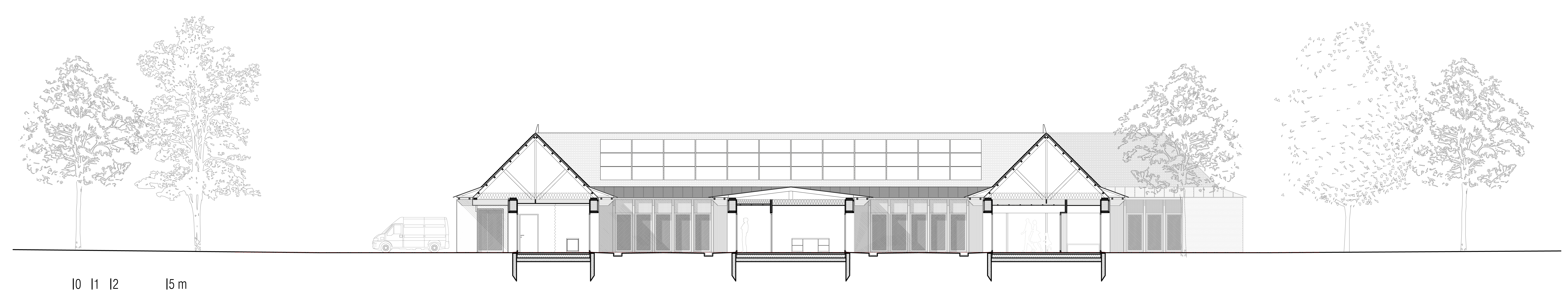 Descriptif technique : Le système constructif qualifie l’architecture. Les pignons en béton de site, fortement exposés aux intempéries, contrastent avec les façades en bois des murs gouttereaux, disposées en retrait du toit et abritées de la pluie. Elles sont constituées d’une ossature en bois isolée en bottes de paille et revêtue d’un bardage vertical en douglas. Des châssis vitrés s’ouvrent aux vues. Installé à cheval sur le talus du couderc, l’édifice présente un niveau semi enterré au nord, lequel abrite les stationnements, les locaux techniques dont la chaufferie à granulés bois, la cuve de récupération des eaux de pluie et le composteur des toilettes sèches. L'ensemble des bois sont labelisés Bois des Territoires du Massif Central