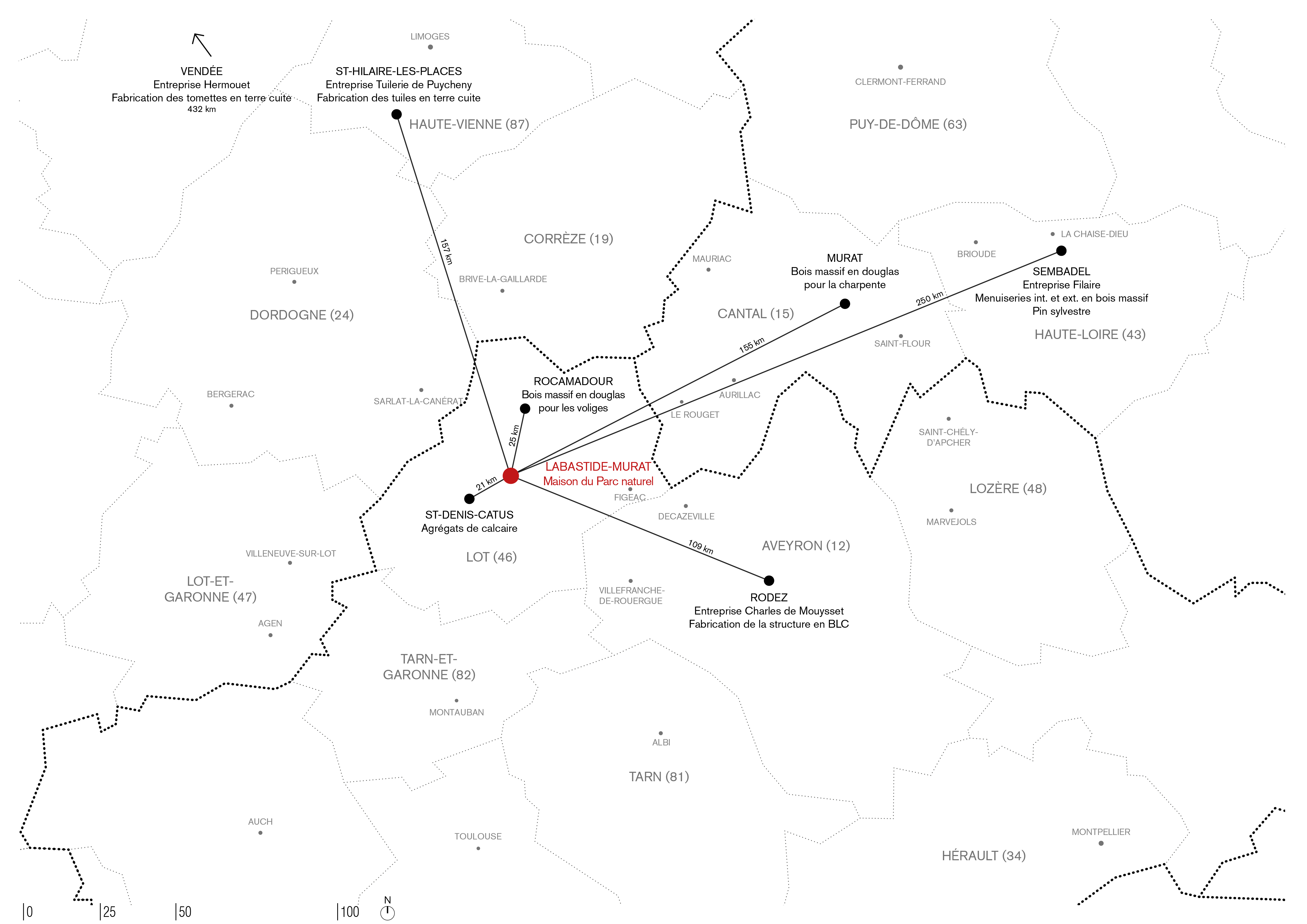 Les PNR sont historiquement engagés dans des formes d’expérimentations qui ambitionnent de répondre aux enjeux écologiques et sociaux de leur temps. L’édifice et ses aménagements extérieurs s’inscrivent dans une logique de parcours entre le centre bourg et le château situé à l’entrée ouest du bourg de Labastide-Murat. La Maison du Parc partage avec l’architecture vernaculaire une attention à la topographie, au climat et aux matières locales, tout en s’inscrivant pleinement dans le XXIème siècle, avec ses enjeux écologiques, son économie, ses techniques constructives et sa quête de sens.