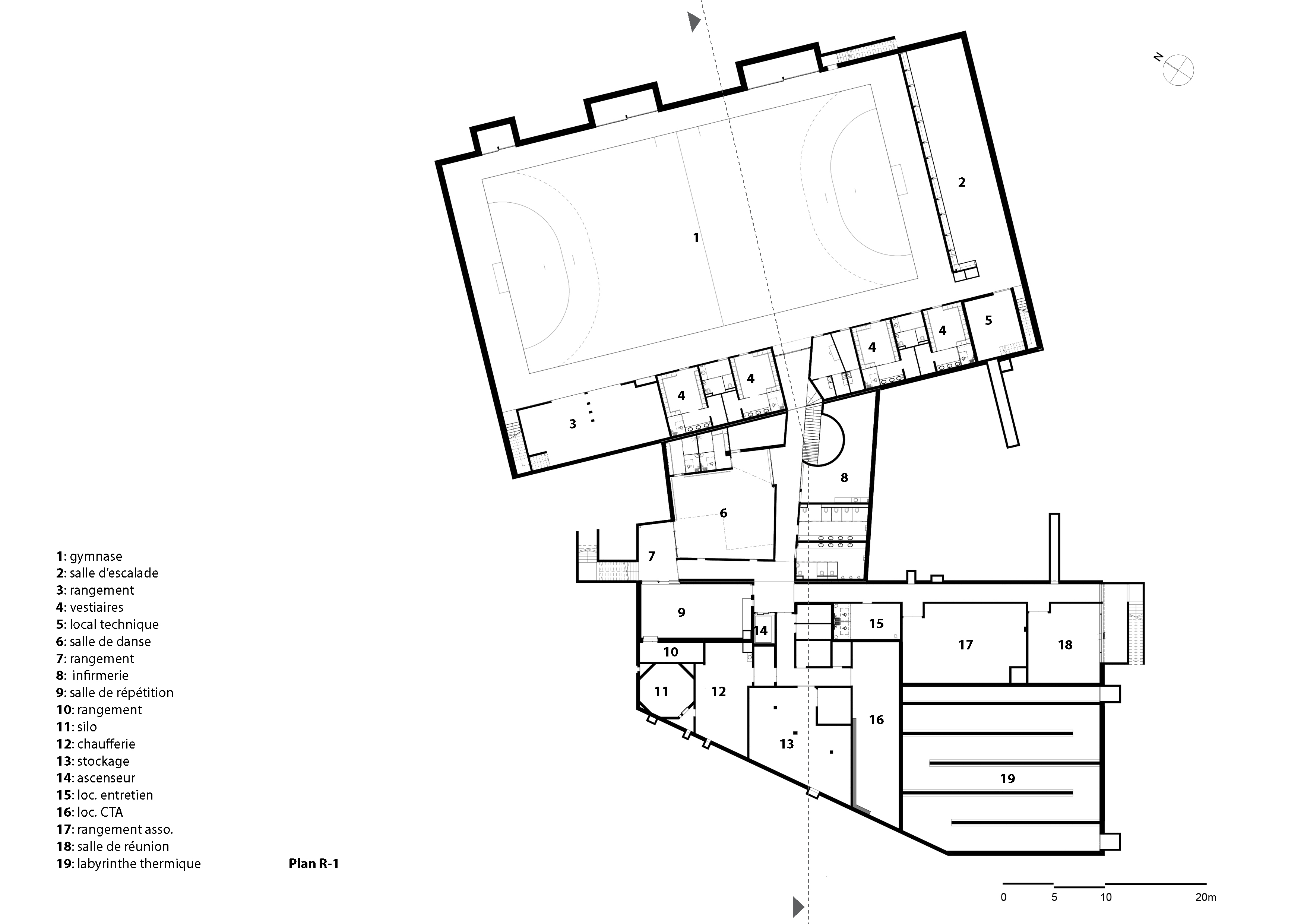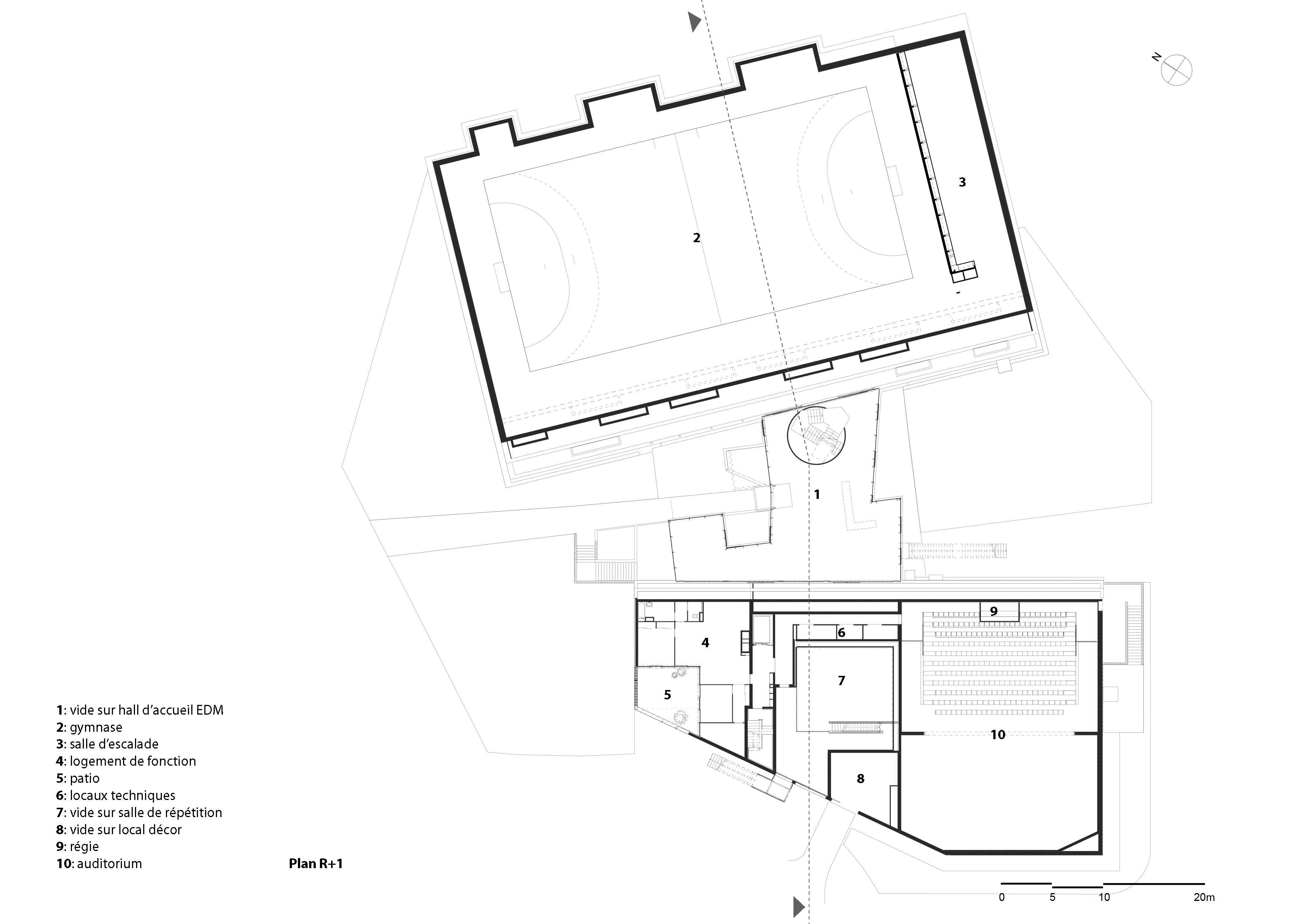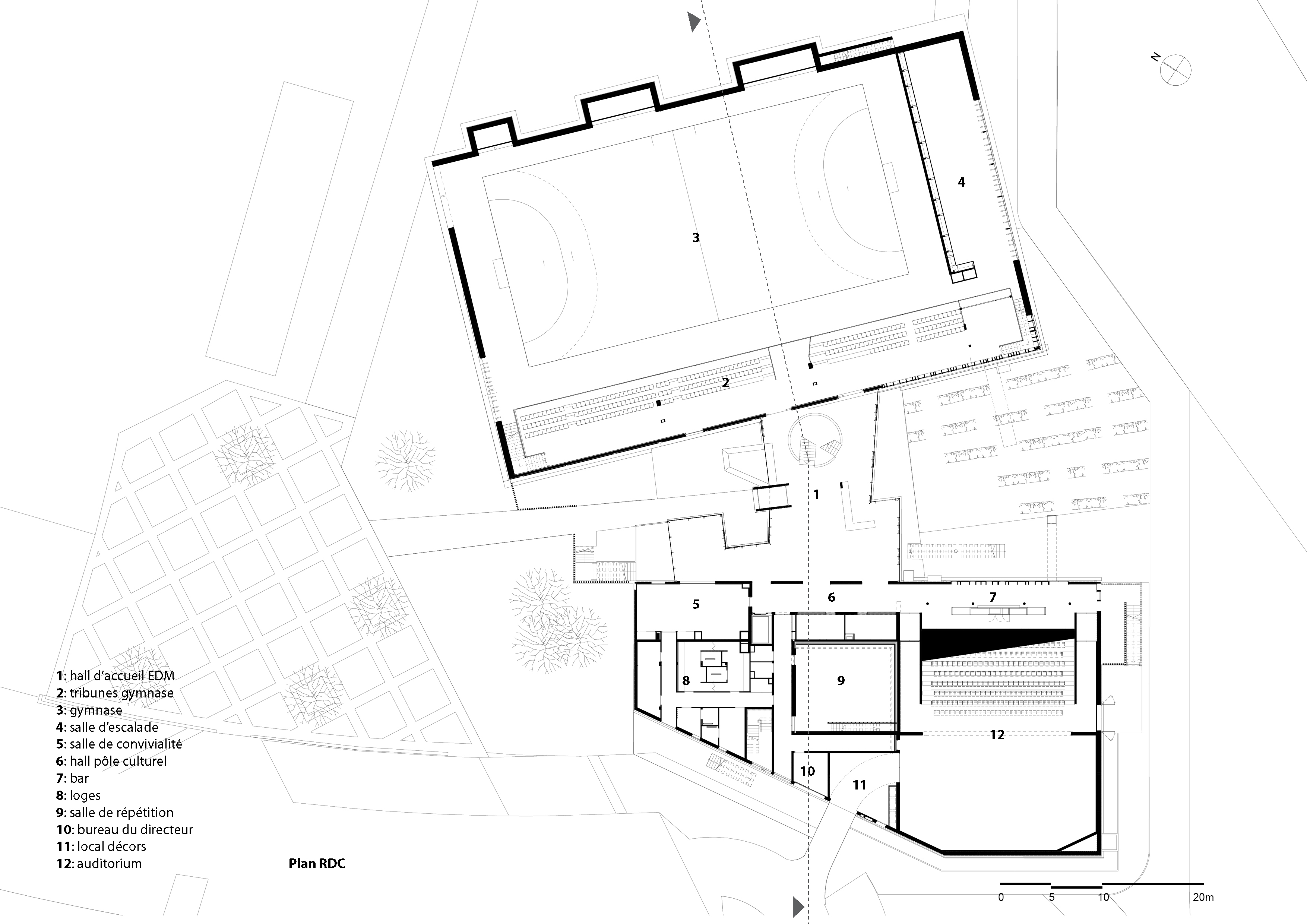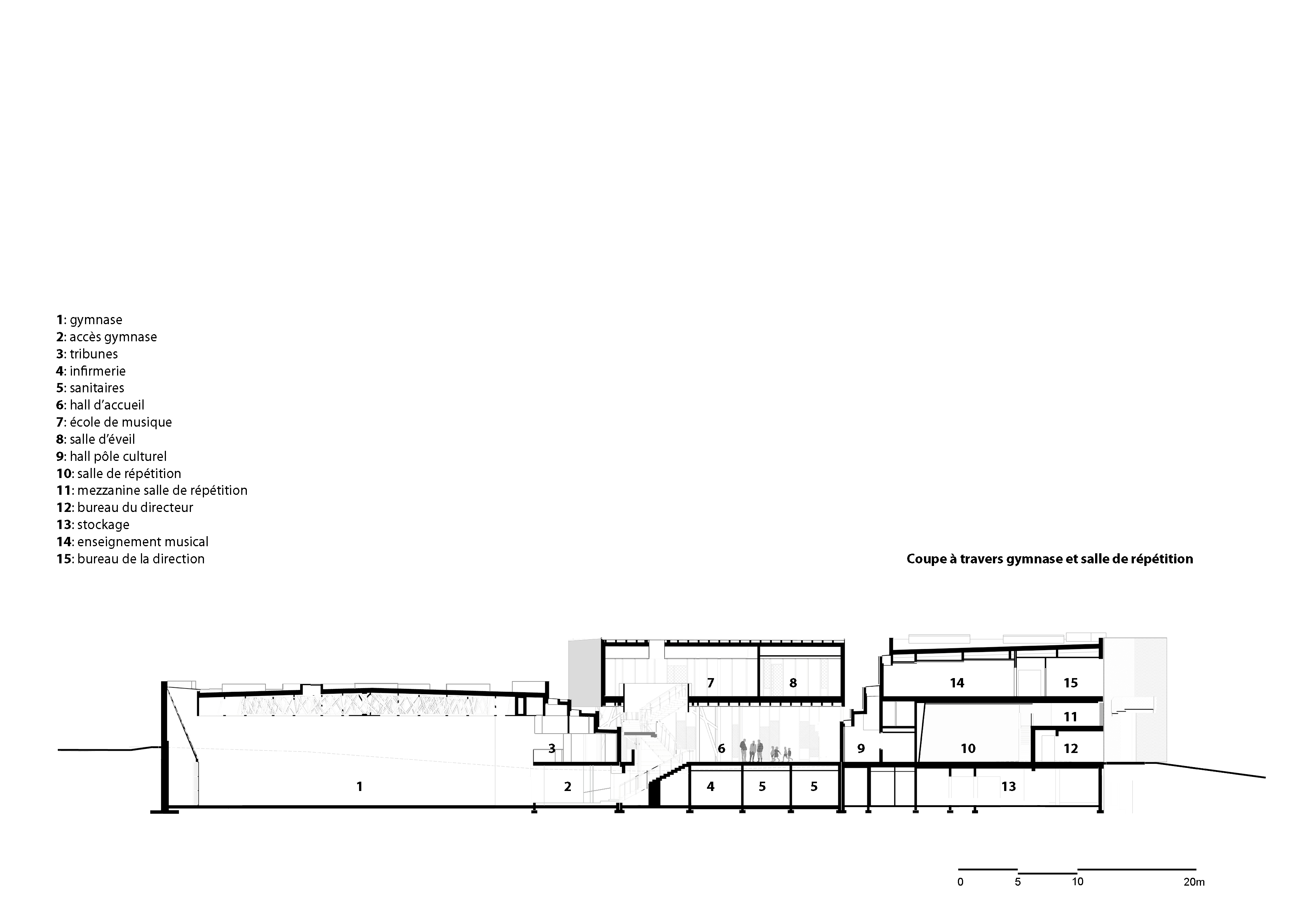 Le projet réunit trois fonctions publiques - pôle culturel, gymnase et école de musique - ainsi que deux logements de fonction. Sur les hauteurs de la commune d'Alby, le site bénéficie d'une vue imprenable sur les Bauges, massif montagneux proche. La vue doit être mise en valeur a travers le bâtiment. C'est un axe constitutif du projet. Le pôle culturel et le pôle sportif sont liés par un accueil traversant vitré sur le massif des Bauges. Cet espace de liaison multidirectionnel est en relation étroite avec le grand paysage, révélant le génie du lieu. Le projet est encastré dans le sol sur une hauteur de 3m, et les grands volumes sont traités en gradins; ainsi l'impact visuel du gymnase et de l’auditorium sont minimisés,et le projet reste à échelle humaine. "On peut toucher le bord du toit", comme dans les maisons traditionnelles des alpages. En coupe, le projet articule deux strates matérielles. La matière y est travaillée brute afin d’exprimer au maximum la vérité constructive. Le béton traité brut aux murs et poli en sol, constitue les parties encastrées. Le bois constitue la majorité de la structure émergée, ainsi que l’enveloppe extérieure des pôles sportif et culturel. La structure primaire de l’école de musique est confortée de structure acier pour absorber les efforts sismiques en finesse malgré les généreuses surfaces vitrées. Un escalier monumental relie ces deux strates entre elles et ce faisant propose un voyage à 360° à travers le projet. Le projet constitue un parcours à travers des espaces contrastés. Si les matériaux sont à l’état brut dans le gymnase ou l’auditorium, l'école de musique, elle, est mise en tension au cœur du projet par l’utilisation de revêtements aux teintes vives. Le soin porté au détail ornemental fait en outre honneur à la tradition dans laquelle s’inscrit l’architecture vernaculaire savoyarde. Le projet joue avec une lumière naturelle protéiforme. Filtrée à travers la charpente du gymnase, elle se répand sur la la totalité de l'espace sportif. Les écailles en pans coupés sur les rangements sportifs, les languettes horizontales au-dessus des gradins, les murs rideaux courant sur les potelets bois, sont autant de petites touches qui font vivre le projet, sa structure, ses revêtements. Le hall central baigné de lumière est traversé par un patio vertical illuminant 3 niveaux. Le volume du pôle culturel, d’apparence opaque en façade, travaille en subtilité la lumière : - derrière d’épais carrelets de bois se niche un patio pour les logements. - derrière la façade technique la lumière filtrée par le métal déployé.