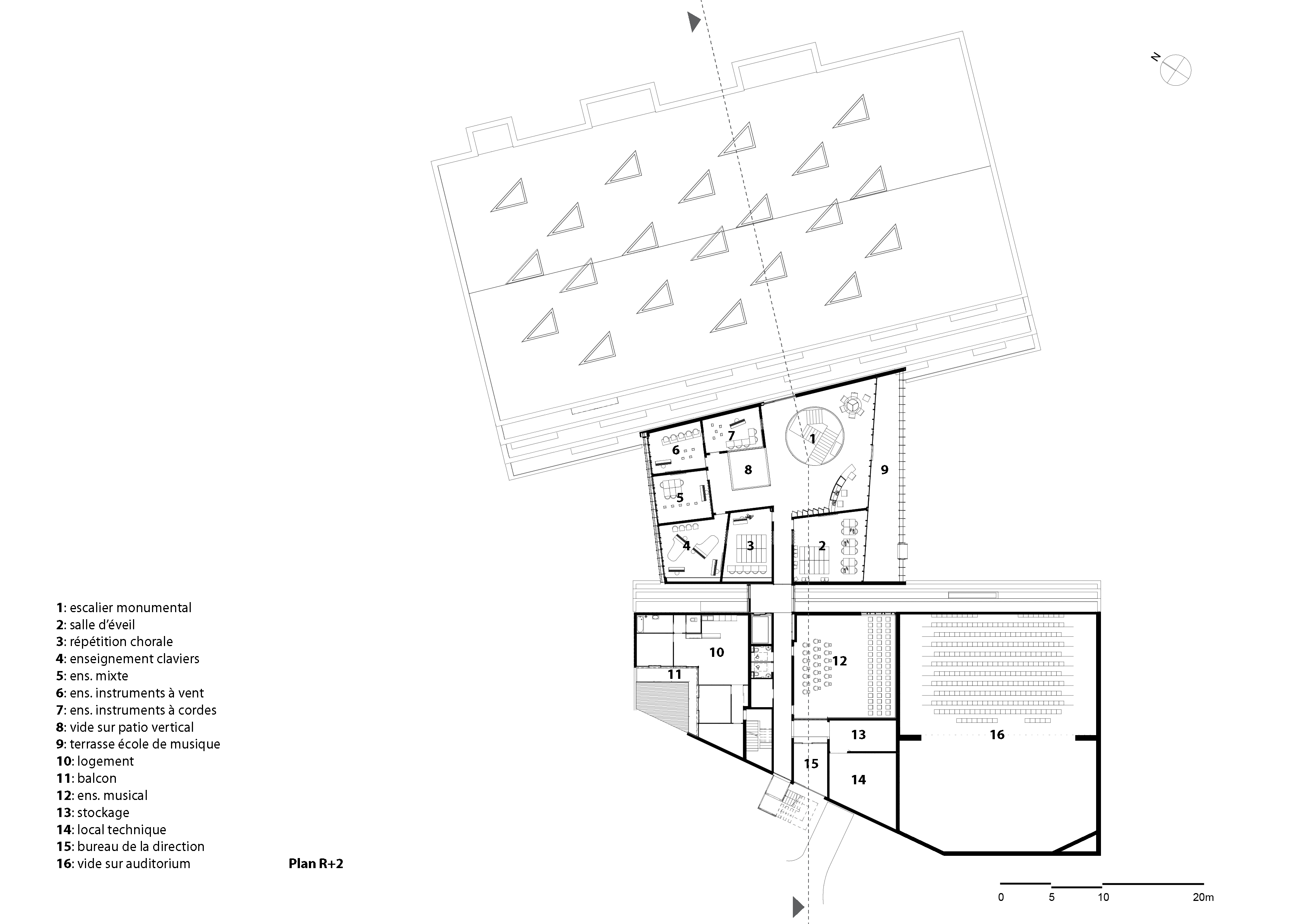 Approche environnementale : Le projet signe un engagement fort sur le plan environnemental. L'utilisation prépondérante du matériau bois - 630m3 - et de la paille comme isolant permet aujourd’hui de livrer un bâtiment biosourcé à faible énergie grise. L'enveloppe performante, l'éclairage naturel de qualité, le labyrinthe thermique sous l'auditorium, la ventilation naturelle optimisée, les occultations végétales ou amovibles sont autant de stratégies passives qui font l'intégrité écologique du projet, et nous permettent aujourd'hui d'atteindre un coefficient d'énergie primaire de 97 kWep/m²/an ( pour un Cep de référence de 183,88 kWep/m²).