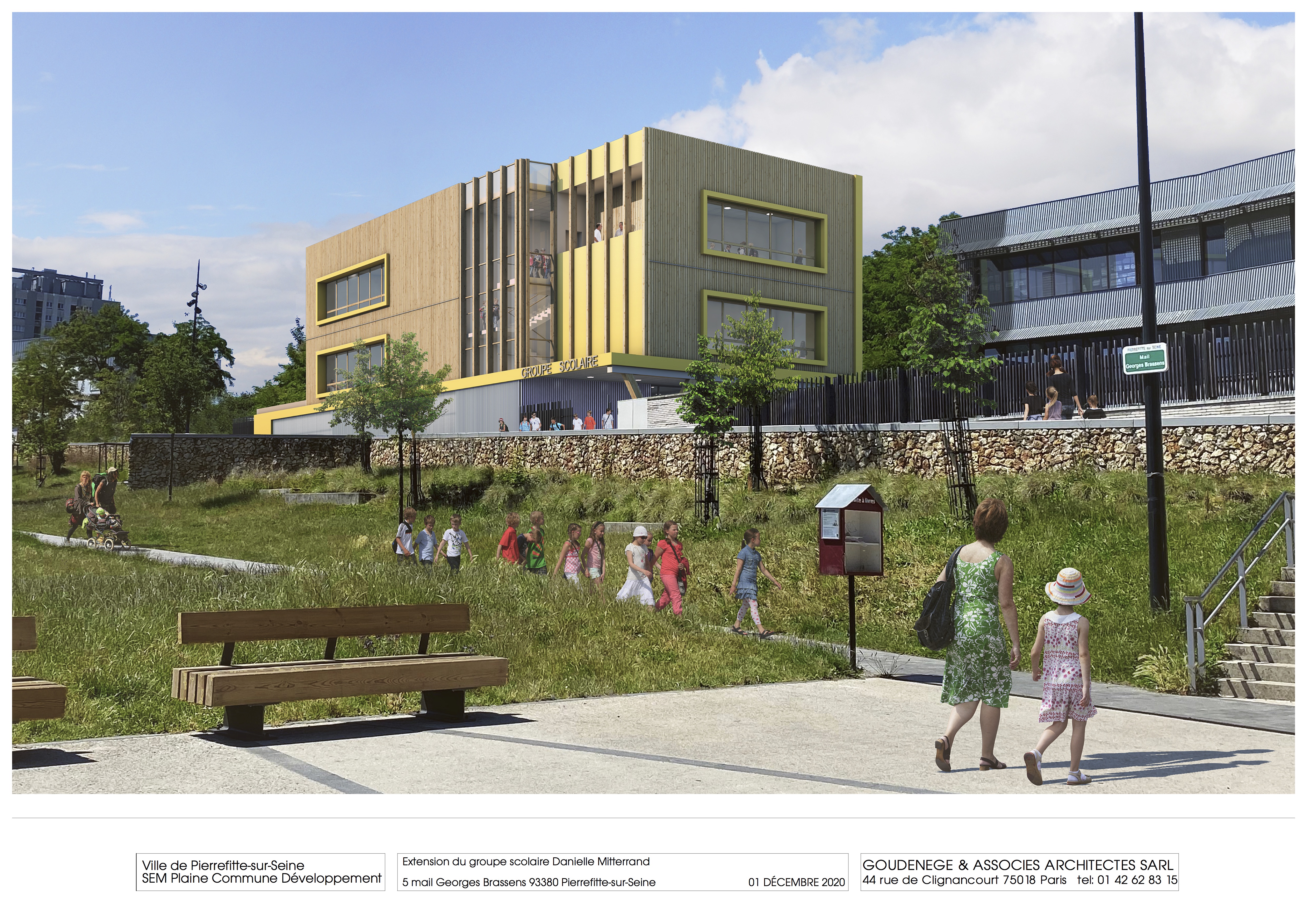 Le groupe scolaire s'inscrit dans la requalification urbaine du quartier des Poètes, visant le désenclavement et l'attractivité d'un nouveau quartier diversifié. Le végétal vient en surplomb du projet: à l'ouest l'espace boisé au-dessus, au sud à la pointe de l'îlot le square, à l'est en contrebas du mail paysagé. Cet effet de cascade vers un espace en creux vient asseoir le projet dans la continuité de l'entrée du groupe scolaire existant pour créer un front bâti sur la voie piétonne et cadrer le vide laissé par l'espace paysagé en contrebas.