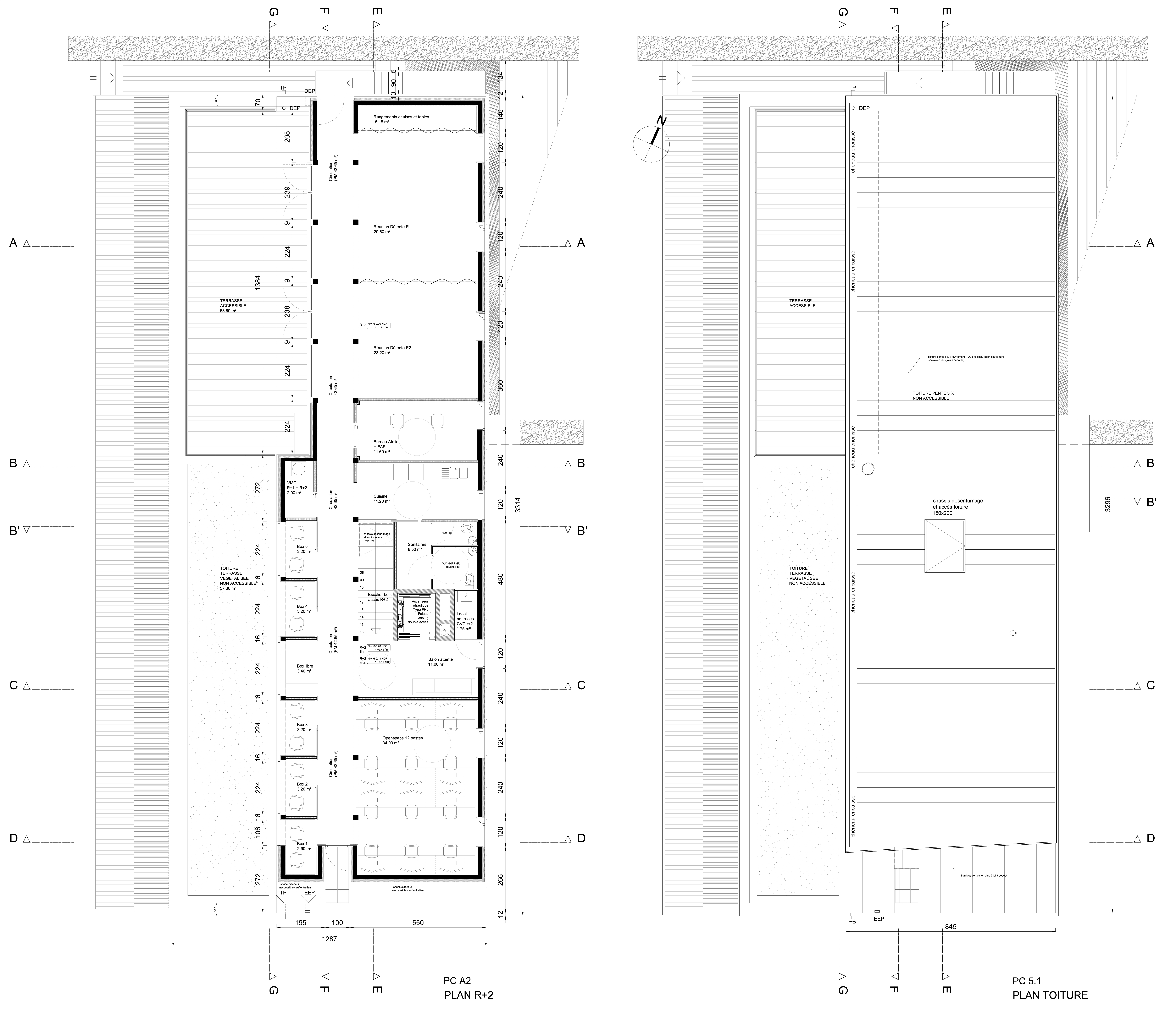 Descriptif technique : Le volume de la surélévation est réalisé entièrement en ossature bois et charpente bois. L'ossature bois traditionnelle est réalisée en épicea du Nord. (23 m3). Toutes les pièces de charpente visibles (poteaux et poutres) sont réalisées en lamellé collé de pin maritime des Landes. (7 m3, bois issus de la forêt des Landes, PEFC). Aucun traitement de finition, ni peinture ni verni. Le bardage est réalisé en zinc qualité Azengar, sur voligeage bois. Les aménagements intérieurs : Tous les doublages, toutes les cloisons, et tous les plafonds (hormis bloc sanitaire) sont réalisés en panneaux multiplis de Pin maritime des Landes pleins ou perforés. (8 m3, bois issus de la forêt des Landes, Label Bois de France, PEFC). Aucun traitement de finition, ni peinture ni verni.