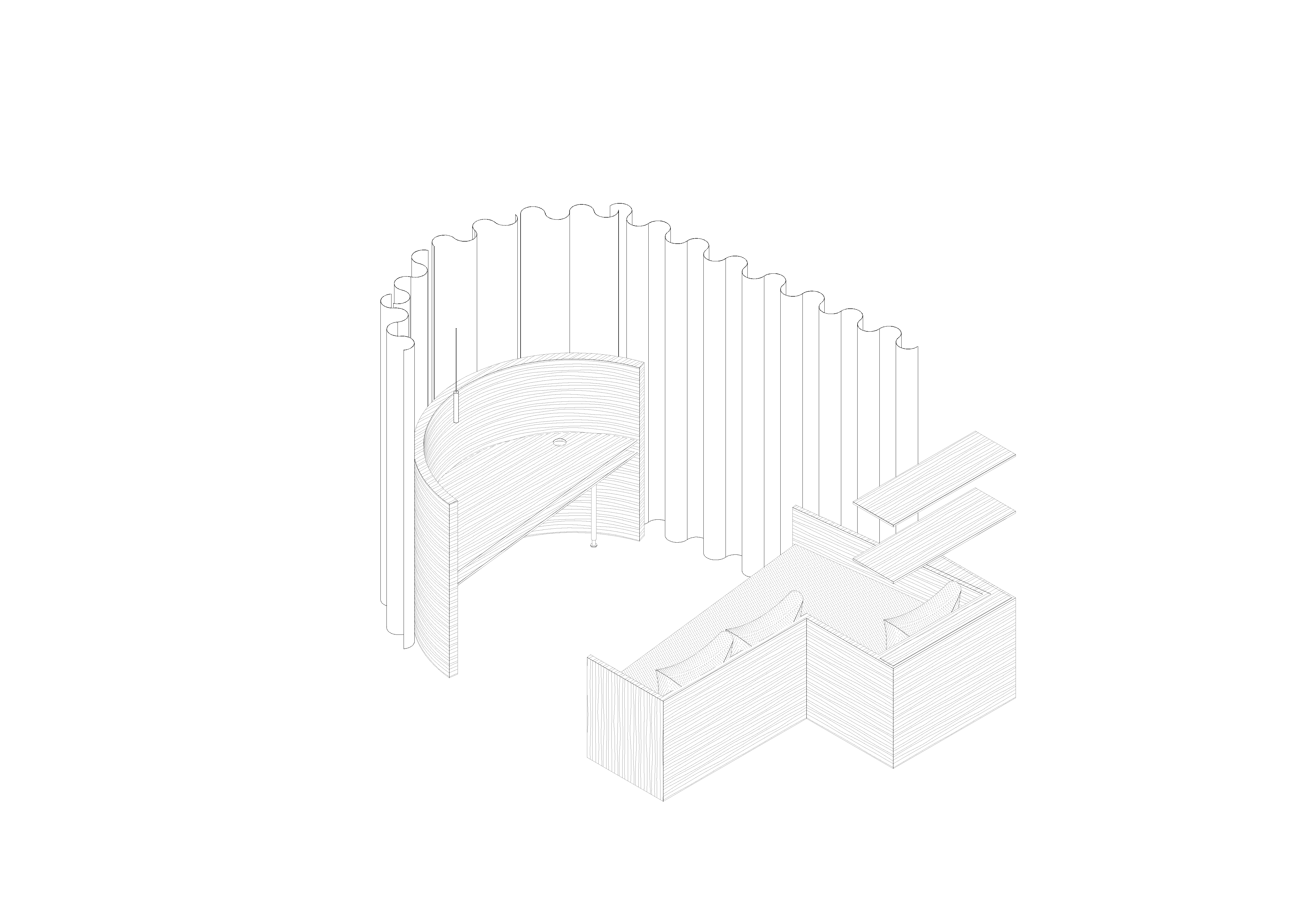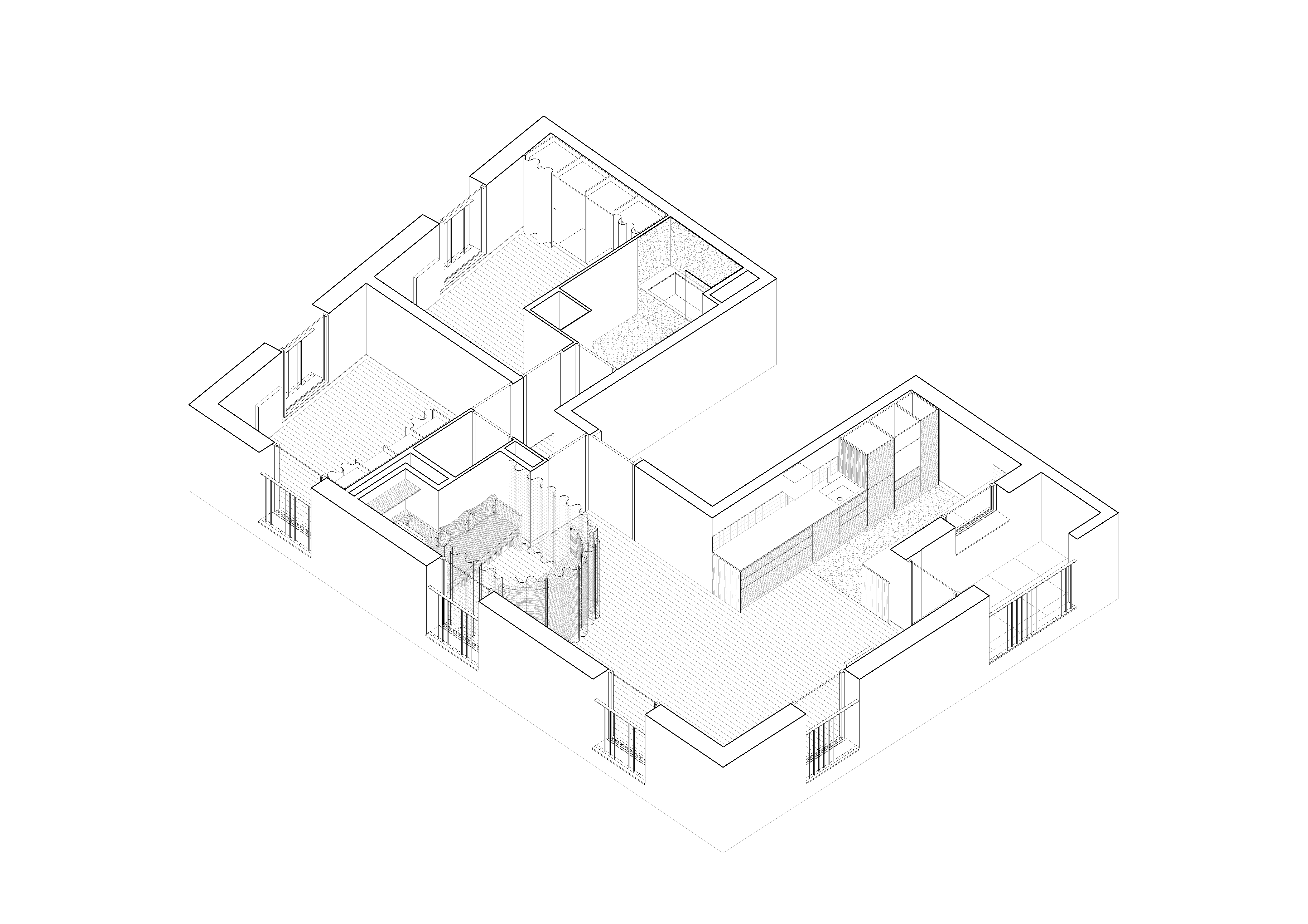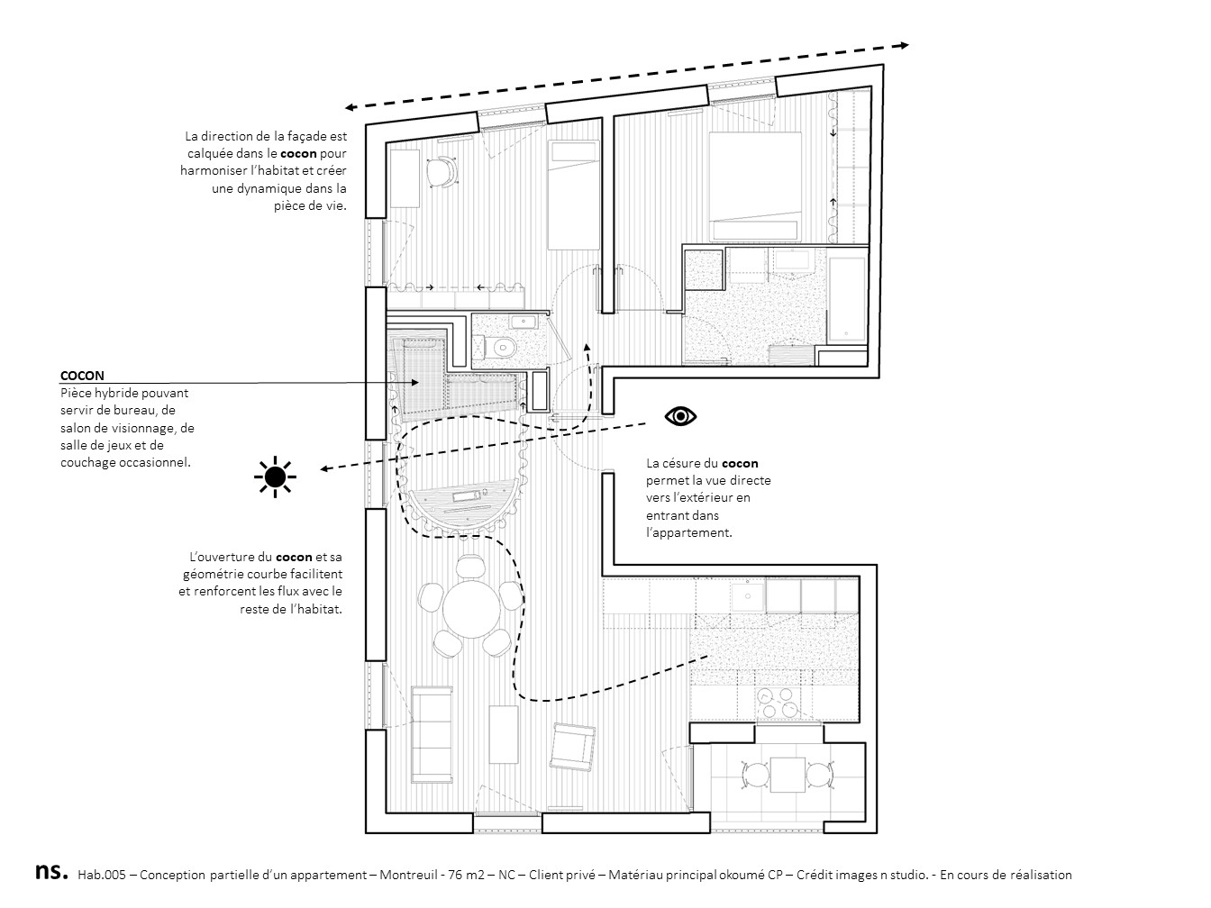 La problématique majeure pour la famille était de pouvoir ajouter à ce T3, une pièce modulable servant à la fois de bureau, couchage occasionnel, salon de visionnage et rangements. Nous avons alors pensé un espace hybride inspiré de l'idée-même du cocon. Enveloppé de voilages, le cocon permet de s'isoler de la pièce de vie via ce filtre visuel apportant douceur et intimité. Sa géométrie composée d'une courbe permet des déplacements fluides avec le reste de l’habitat. Par ailleurs, dès l'entrée du logement, la césure créée par l'agencement offre une vue directe vers l’extérieur.