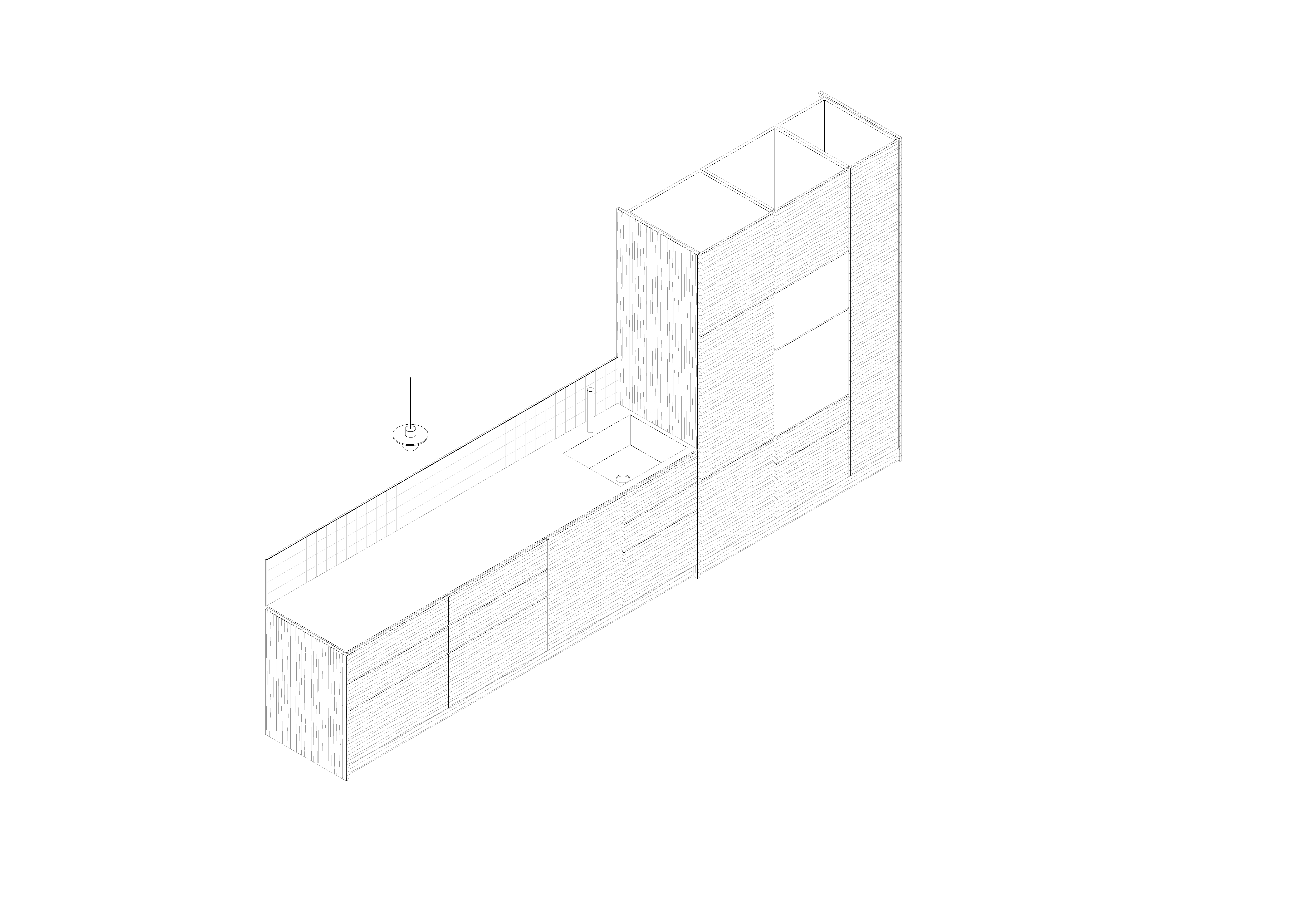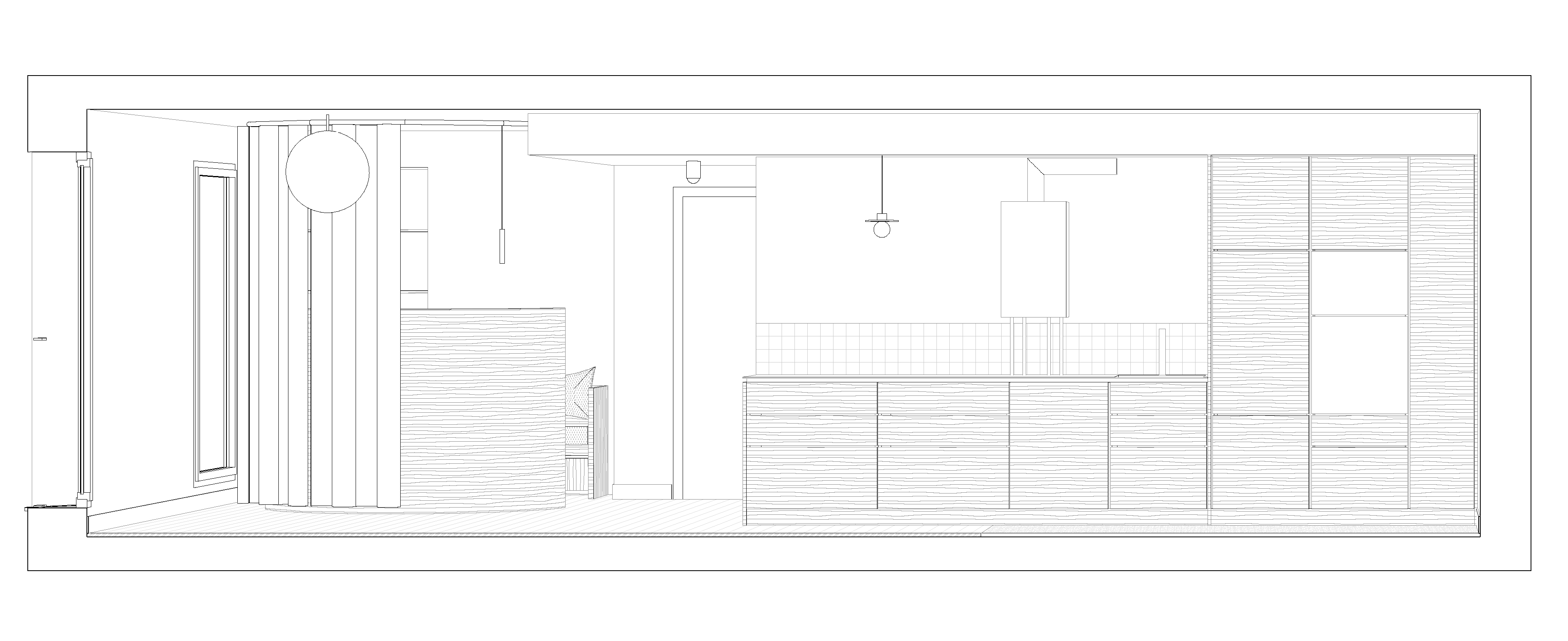 Descriptif technique de l'aménagement : L'aménagement de la pièce comporte un bureau avec une paroi à mi hauteur, suffisamment élevée pour dissimuler tout le matériel informatique. La banquette compte 3 places assises et intègre de grands caissons sur roulettes en-dessous. Ses dimensions permettent également le couchage d'une personne. La cuisine sur-mesure quant à elle ouverte sur le séjour mais toutefois placée dans un volume dissocié du reste de la pièce, est aménagée de façon ergonomique. Tous les rangements sont des tiroirs à poignées intégrées et elle offre deux grands linéaires de plans de travail. Chaque chambre dispose de grands rangements ouverts et adaptés aux occupants: dressings pour les parents et étagères à profondeur réduite pour la chambre enfant.
