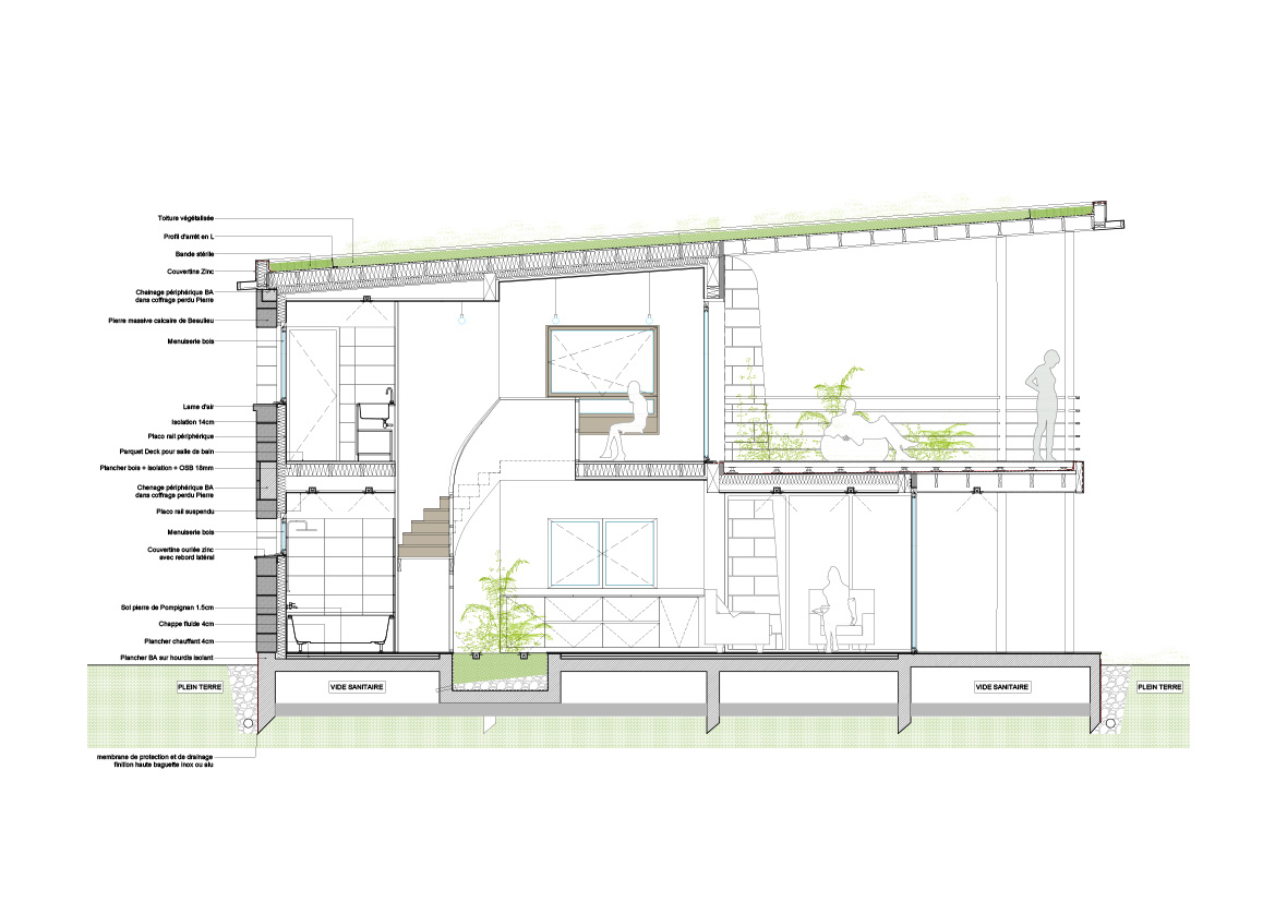 Descriptif technique : La maison offre une architecture contemporaine organique souhaitée par ses futurs propriétaires proposant un confort optimal (plancher chauffant, toiture végétalisée, récupération d’eau de pluie). - L'inertie et la structure verticale est assurée par la pierre calcaire massives de 32cm d'épaisseur ainsi que son plancher bas sur hourdis. - L'isolation et la structure horizontale est concentrée sur l'utilisation du bois sous différentes formes dans un soucis de préservation de la matière.