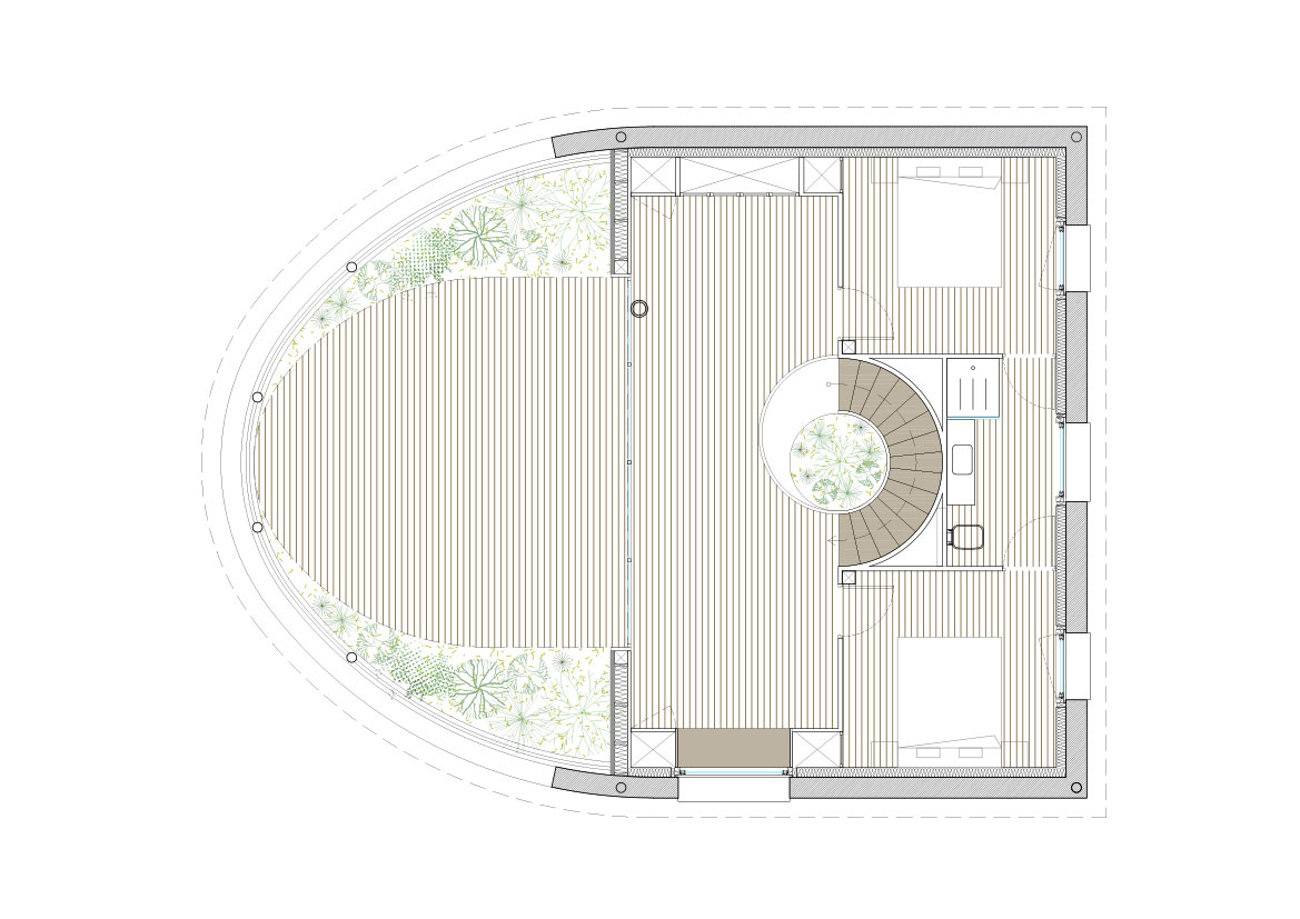 La maison LPC est une villa individuelle biosourcée et géosourcée. Son orientation s'ouvre vers la vue magistrale donnant sur le Pic Saint Loup et l’Hortus. Les espaces intérieurs optimisés s’articulent autour d’un escalier en spirale de Théodore végétalisé. Sculpté dans la masse, cet escalier dissocie les espaces nuits pleins des espaces jours vides. Ce petit Object dynamique simple et parfaitement adapté à son environnement, émerge d’une clairière Héraultaise.